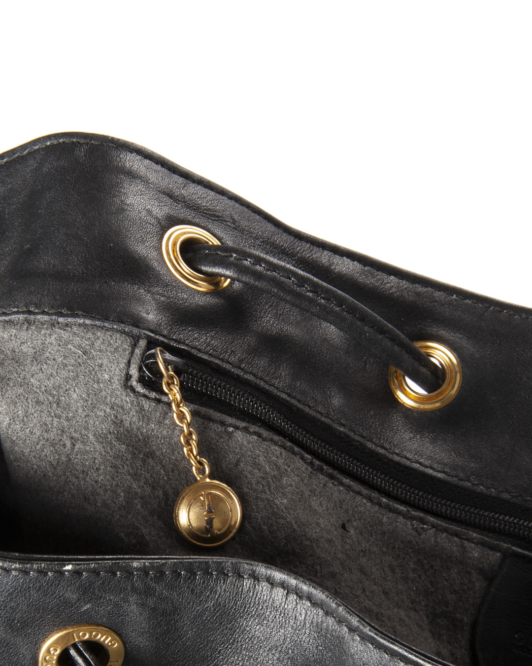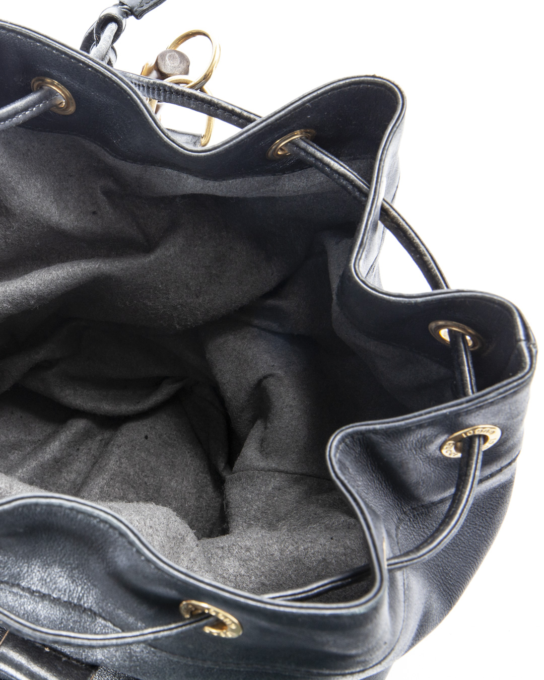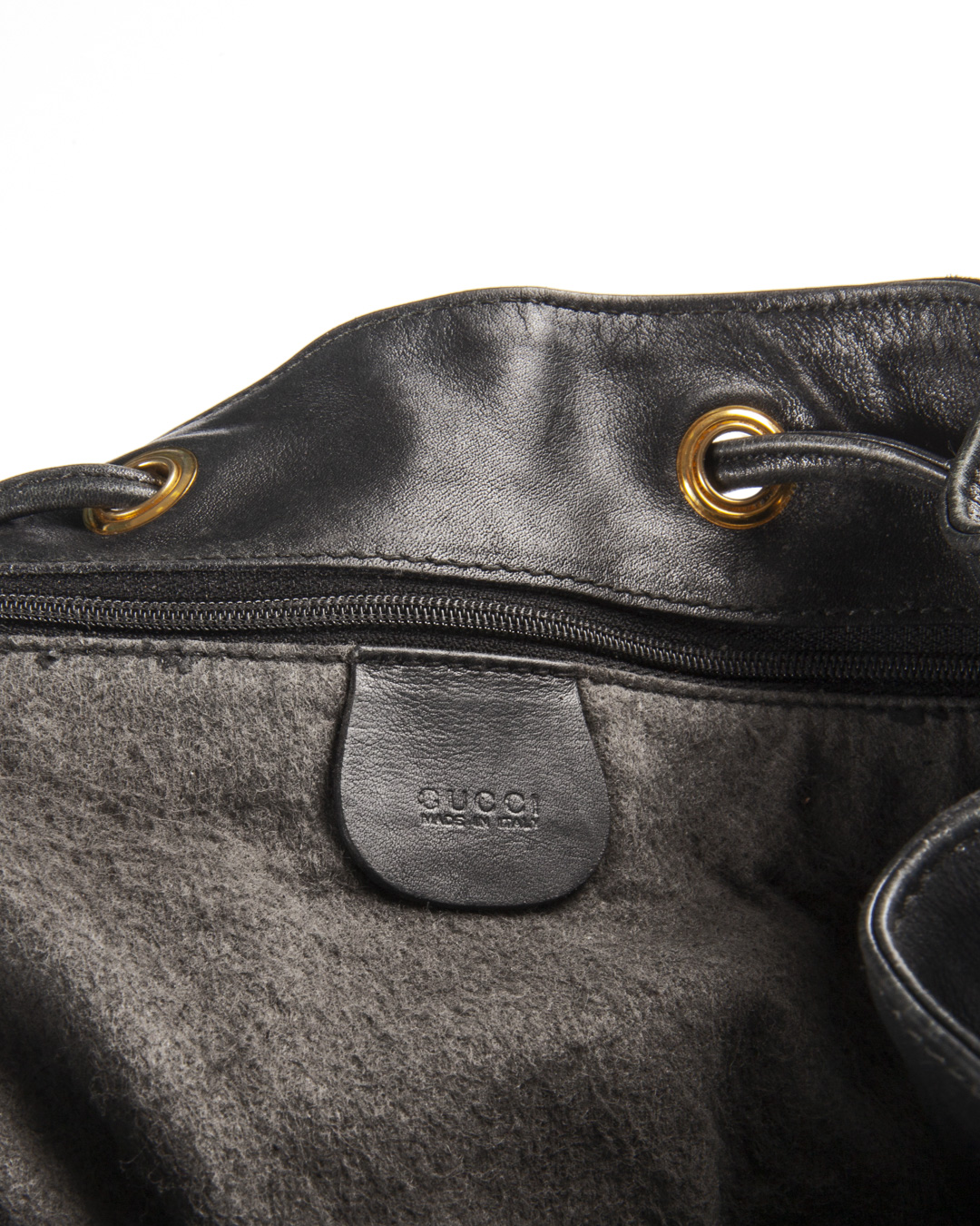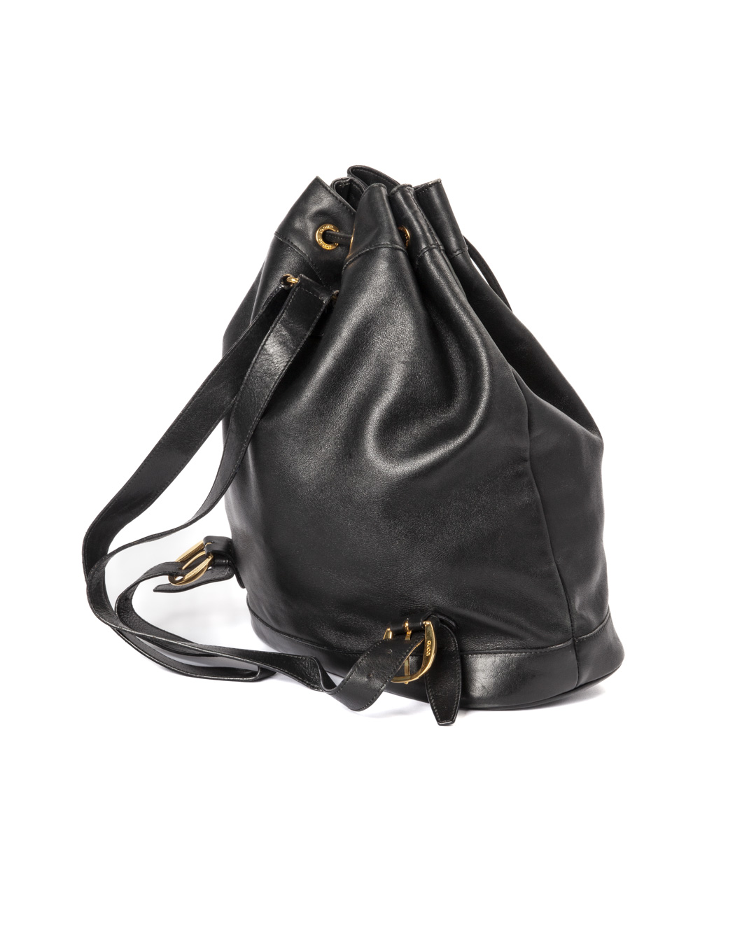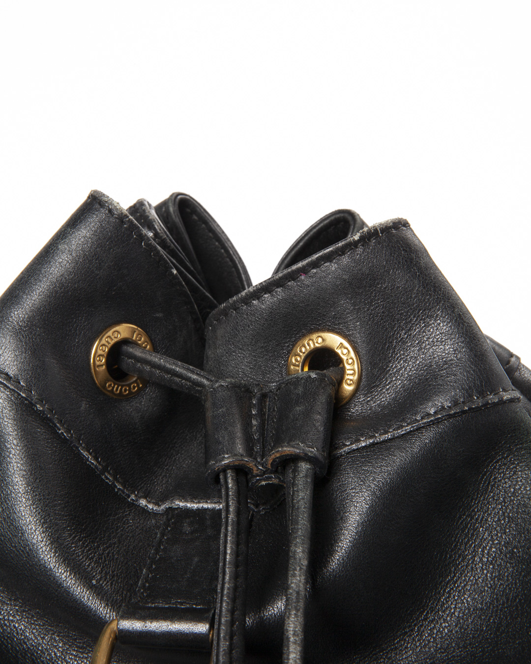 Zaino firmato Gucci, linea Bamboo Vintage, realizzata in pelle liscia nera con hardware dorato. Dotata di una chiusura superiore a coulisse, internamente rivestita in tessuto scamosciato nero con comoda tasca, lo zaino è abbastanza capiente. Munito di due spallaci regolabili in pelle, per una comoda portata a spalla o a mano. L’articolo si presenta in buone condizioni, con segni di usura visibili in foto.