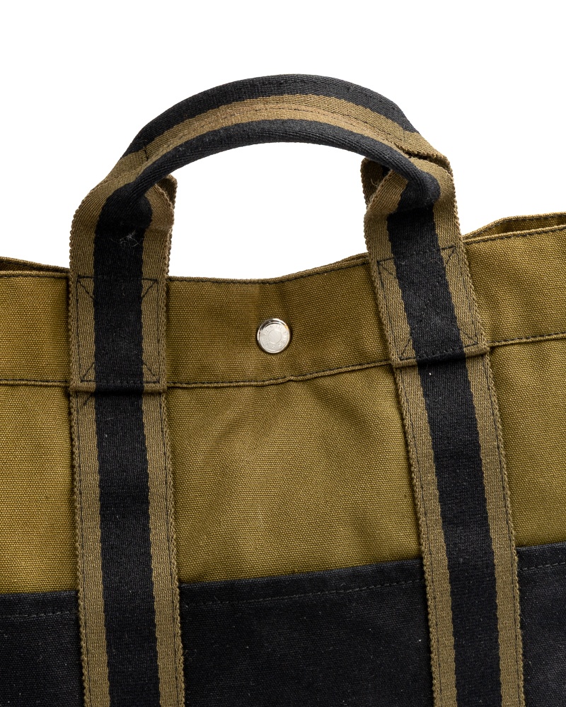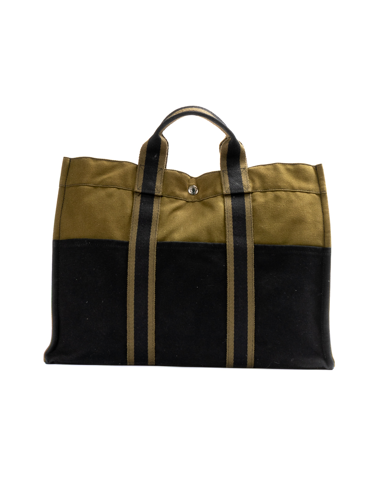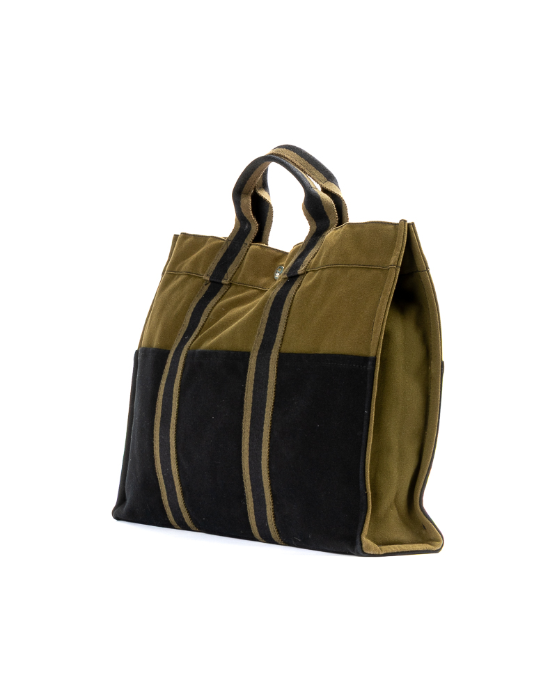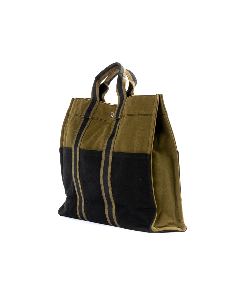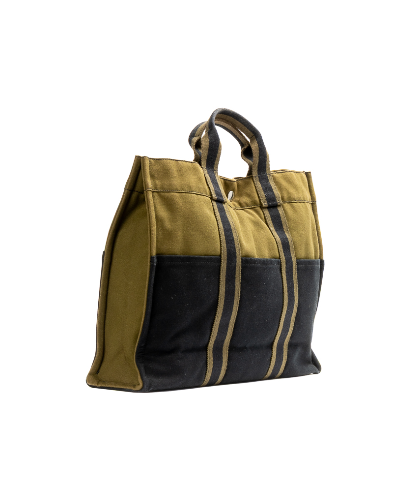 Borsa firmata Hermès, modello Tote Fourre nella misura Medium, realizzata in tessuto bicolor verde con hardware argento. Dotata di una chiusura a clip, internamente rivestita in tessuto tono su tono con comoda tasca, la borsa è abbastanza capiente. Munita di doppio manico, per una comoda portata a mano. L'articolo si presenta in ottime condizioni.