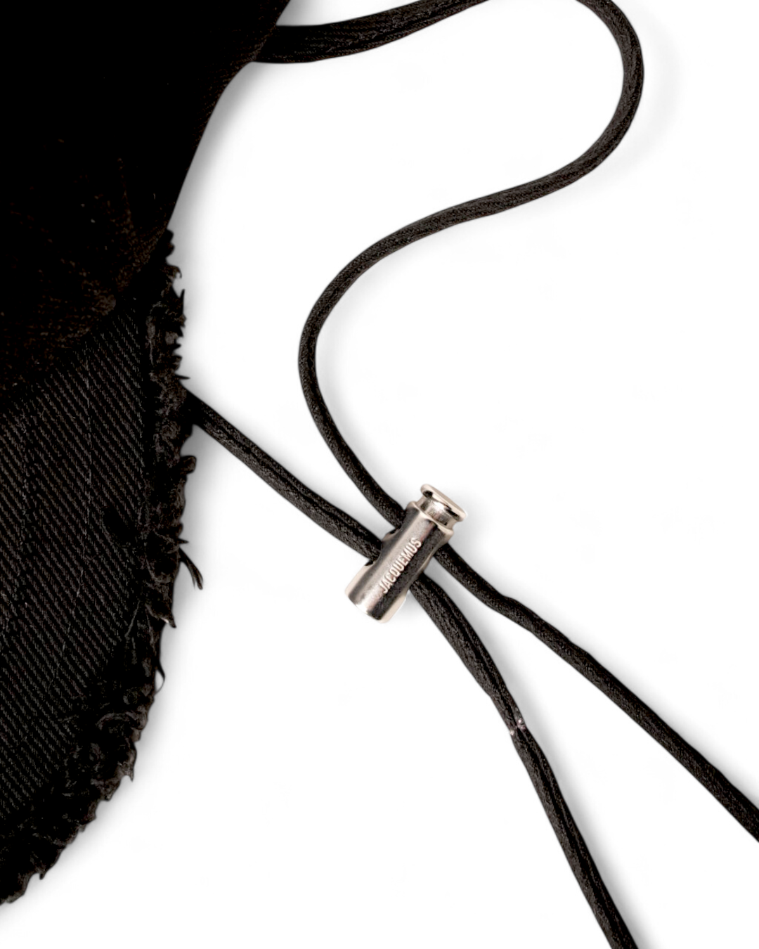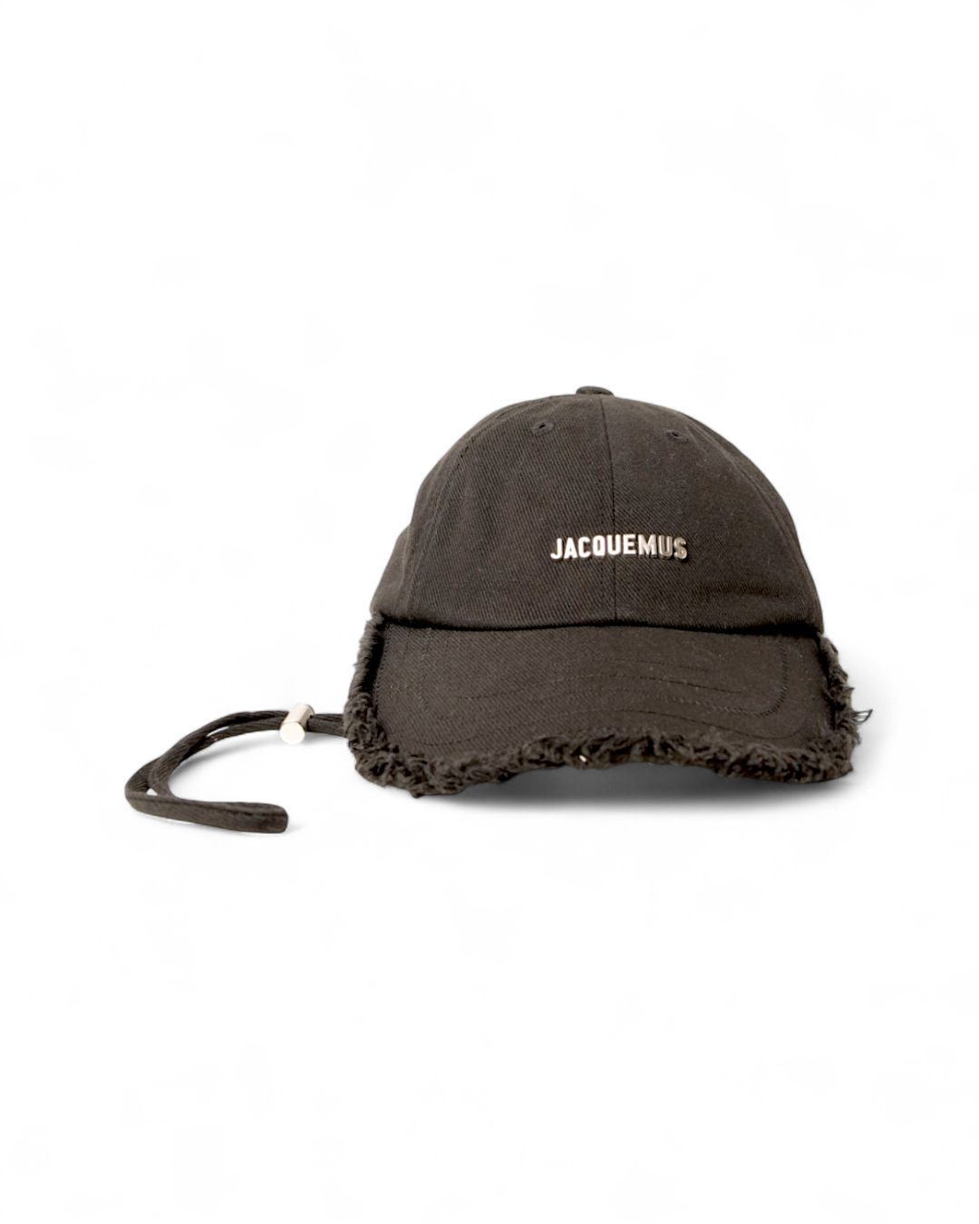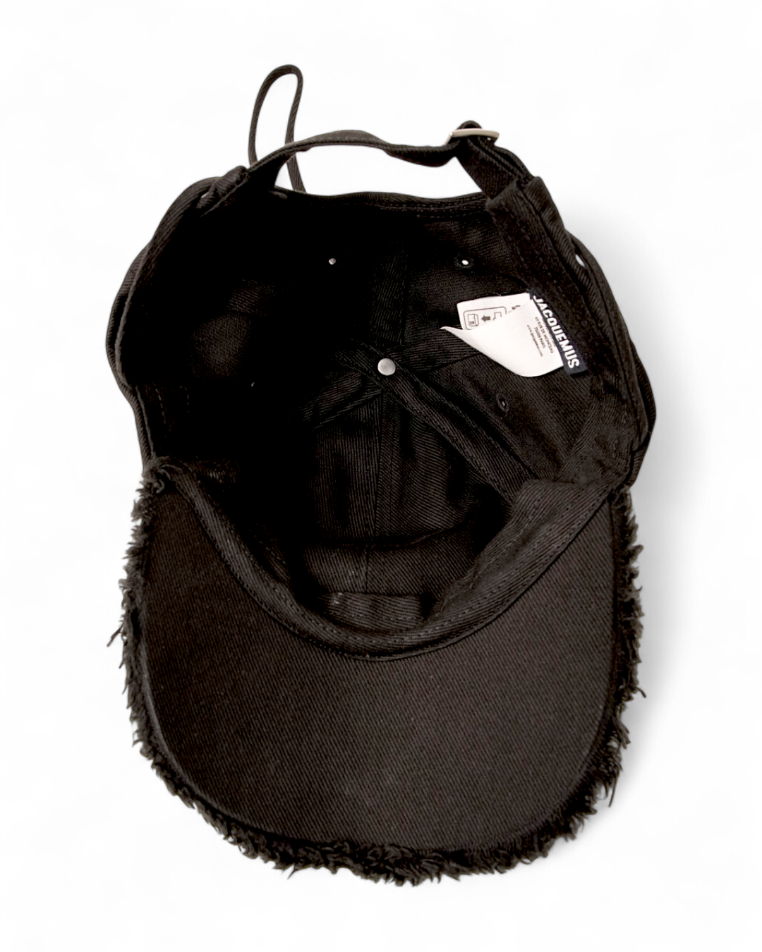 Berretto firmato Jacquemus, modello La Casquette, realizzato in denim nero arricchito da frange e classico logo del brand in metallo argento sulla parte frontale. Munito di laccio regolabile, Taglia 56\US. L’articolo si presenta in ottime condizioni.