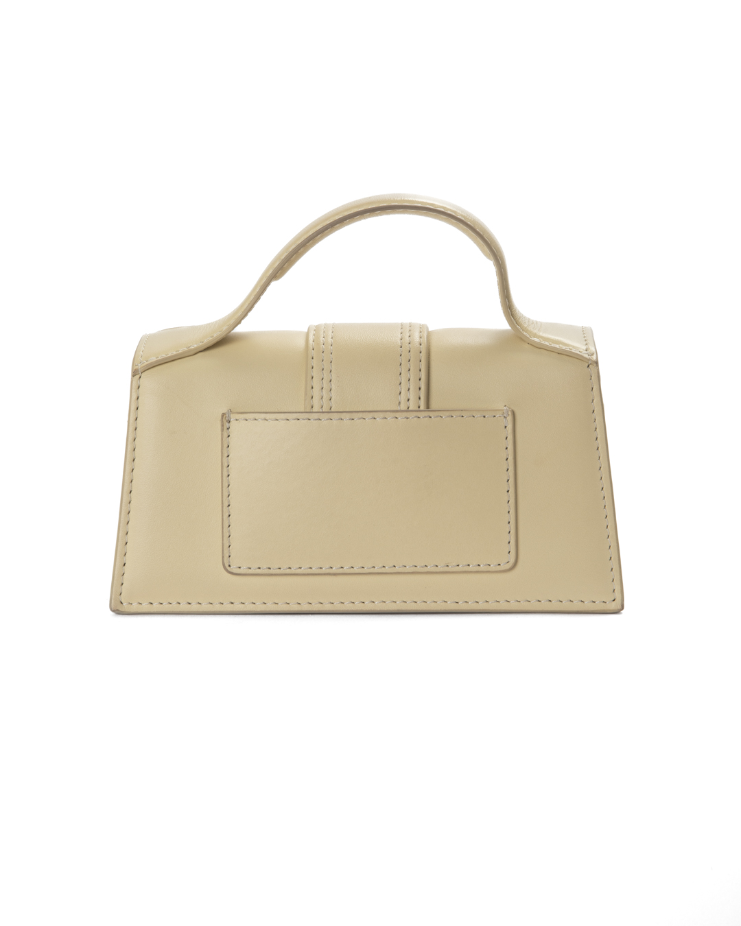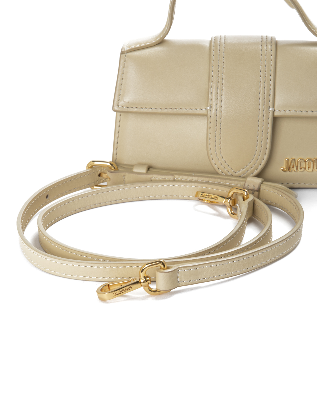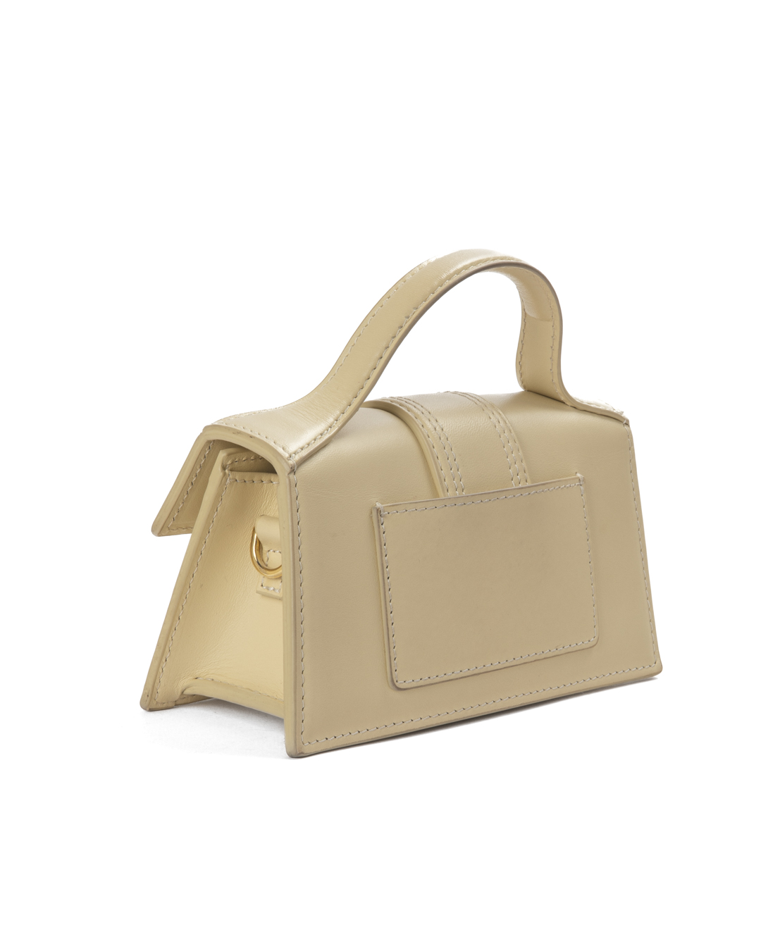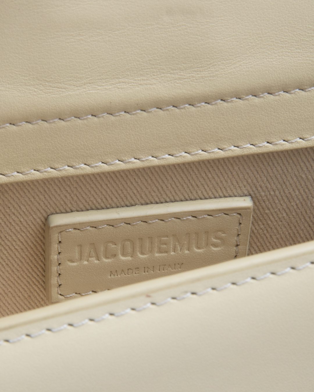 Borsa firmata Jacquemus, modello Le Bambino Mini, realizzata in pelle liscia crema e hardware dorato. Dotata di una patta frontale con chiusura a bottone calamitato, internamente rivestita in tela beige, capiente per l’essenziale. Munita di un manico rigido centrale per portata a mano e di una tracolla rimovibile e regolabile per una portata a spalla. L' articolo si presenta in buone condizioni, con segni di usura visibili in foto.