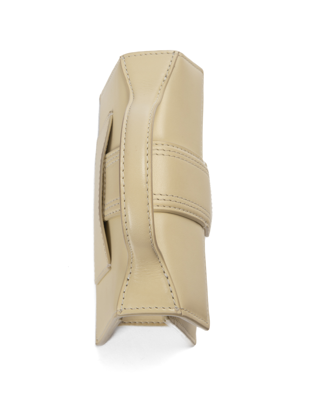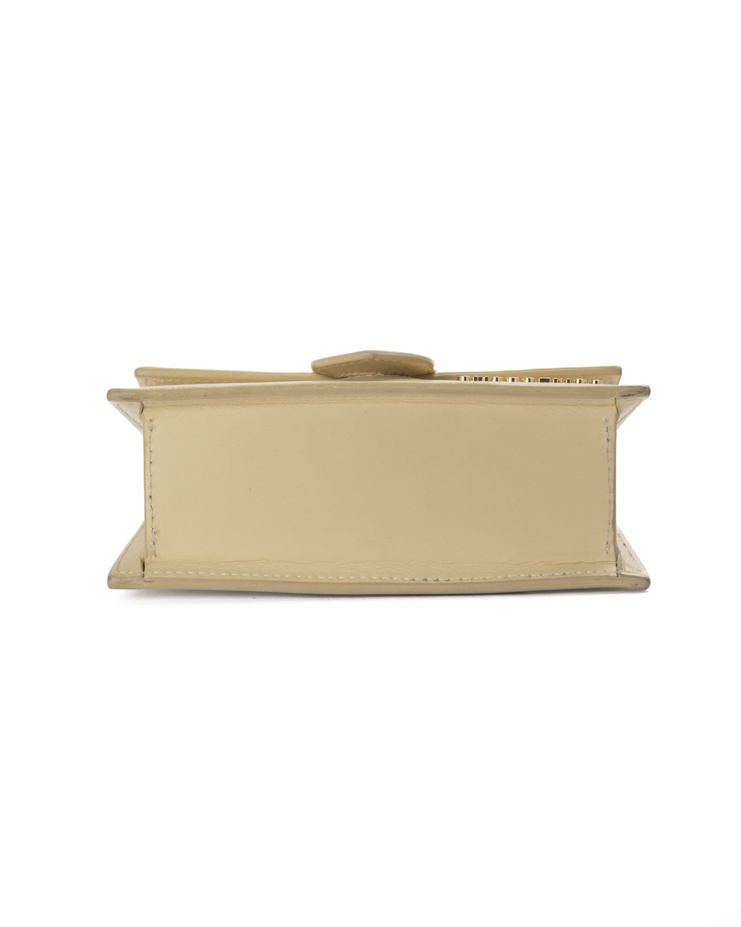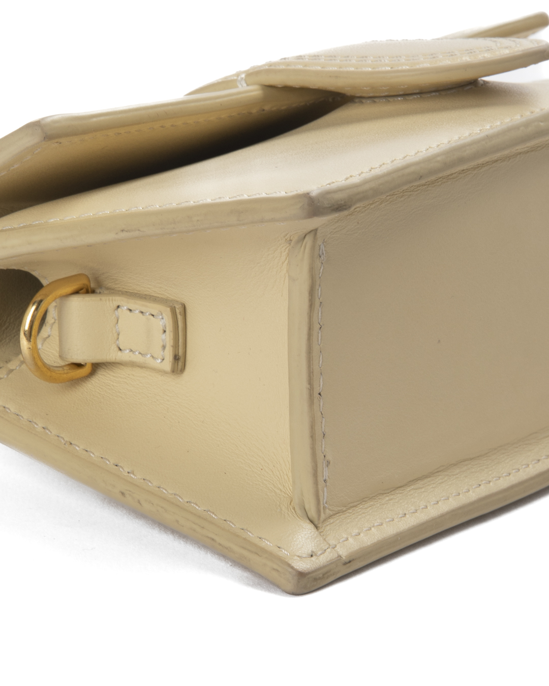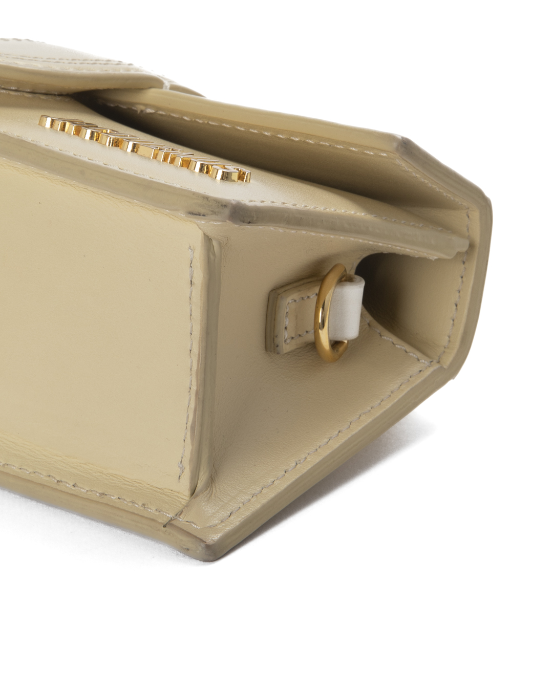 Borsa firmata Jacquemus, modello Le Bambino Mini, realizzata in pelle liscia crema e hardware dorato. Dotata di una patta frontale con chiusura a bottone calamitato, internamente rivestita in tela beige, capiente per l’essenziale. Munita di un manico rigido centrale per portata a mano e di una tracolla rimovibile e regolabile per una portata a spalla. L' articolo si presenta in buone condizioni, con segni di usura visibili in foto.