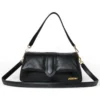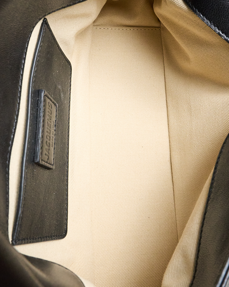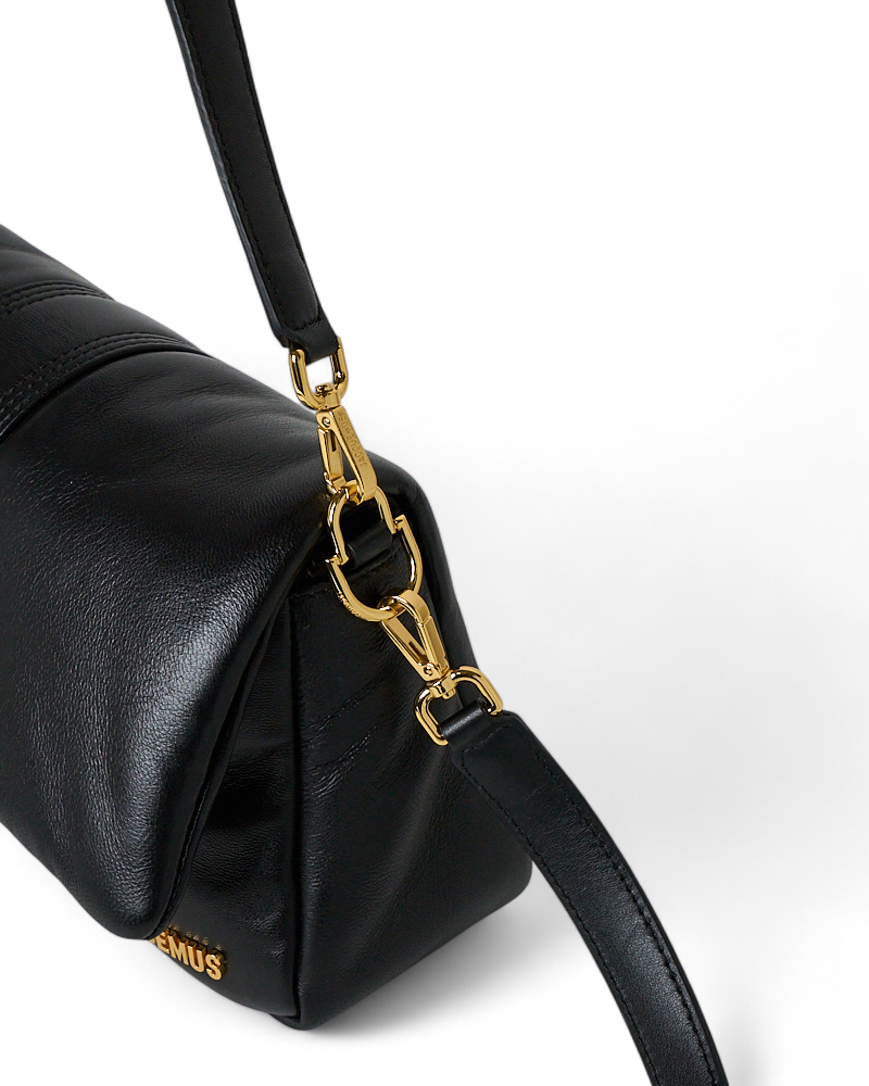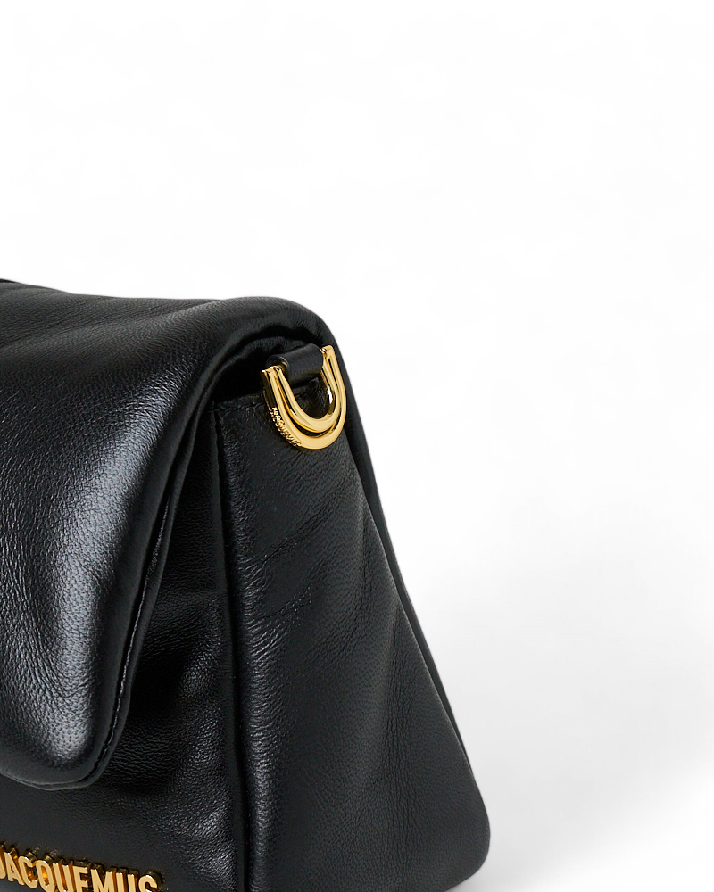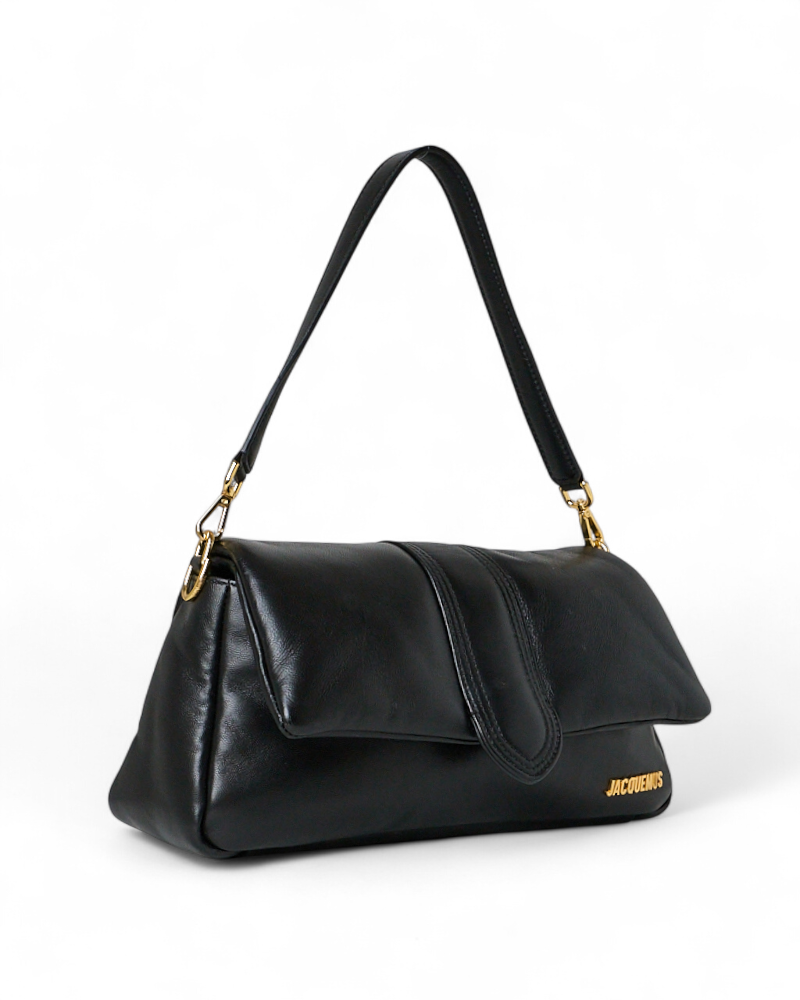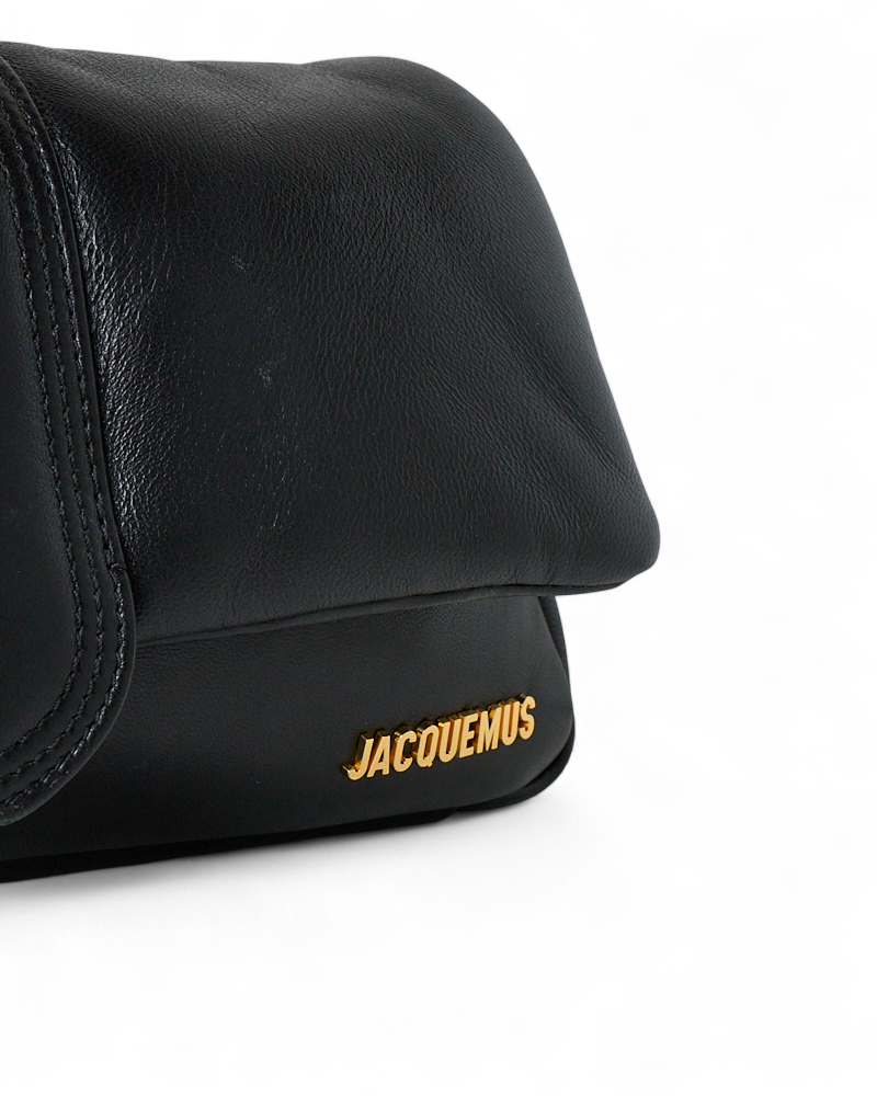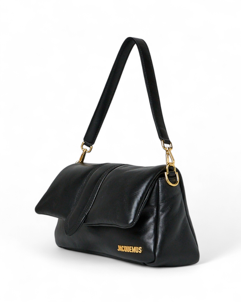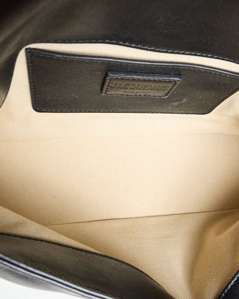 Borsa firmata Jacquemus, modello Le Bambinou nella misura grand, realizzata in pelle nero con hardware dorati. Dotata di una patta frontale con chiusura magnetica, internamente rivestita in tela beige con piccola tasca, la borsa è capeinte per l’essenziale. Munita di un manico e di una tracolla rimovibili, per una portata a spalla o a tracolla. L’articolo si presenta in condizioni pari al nuovo.