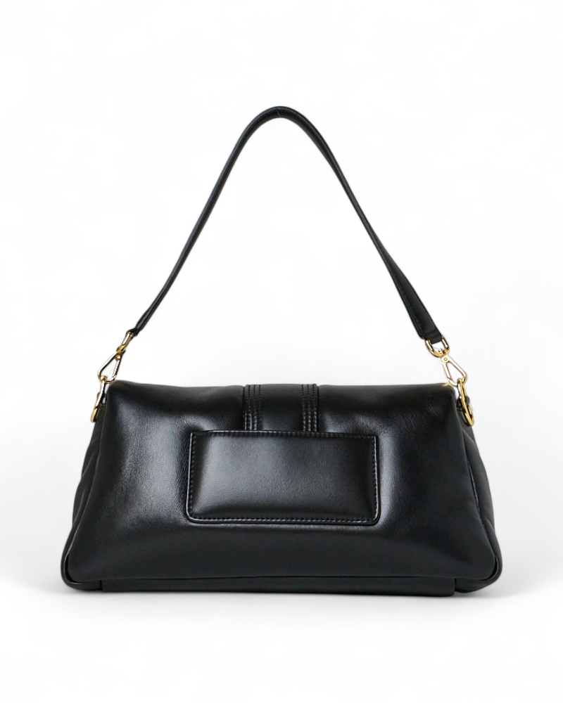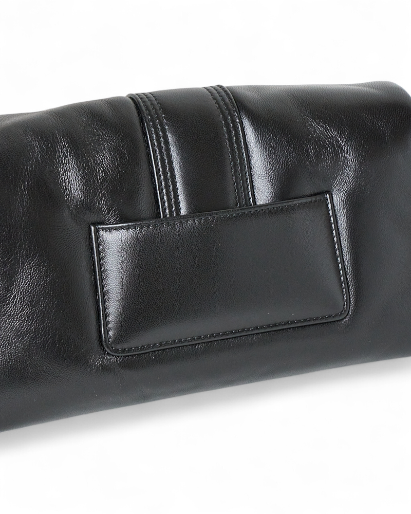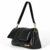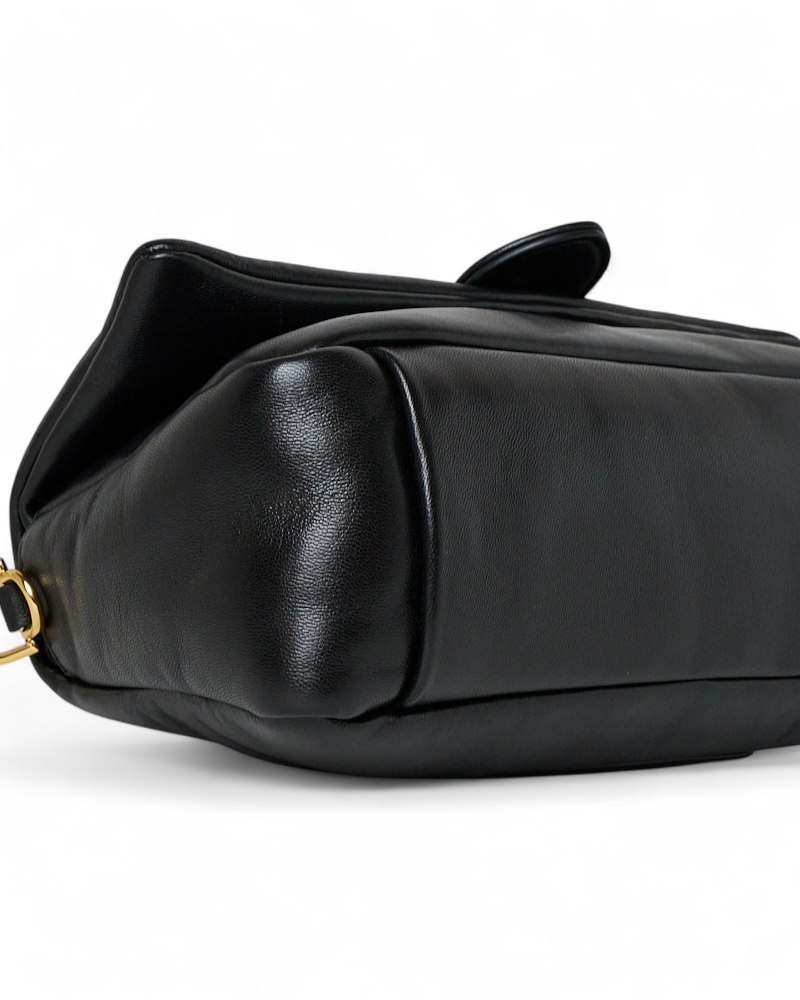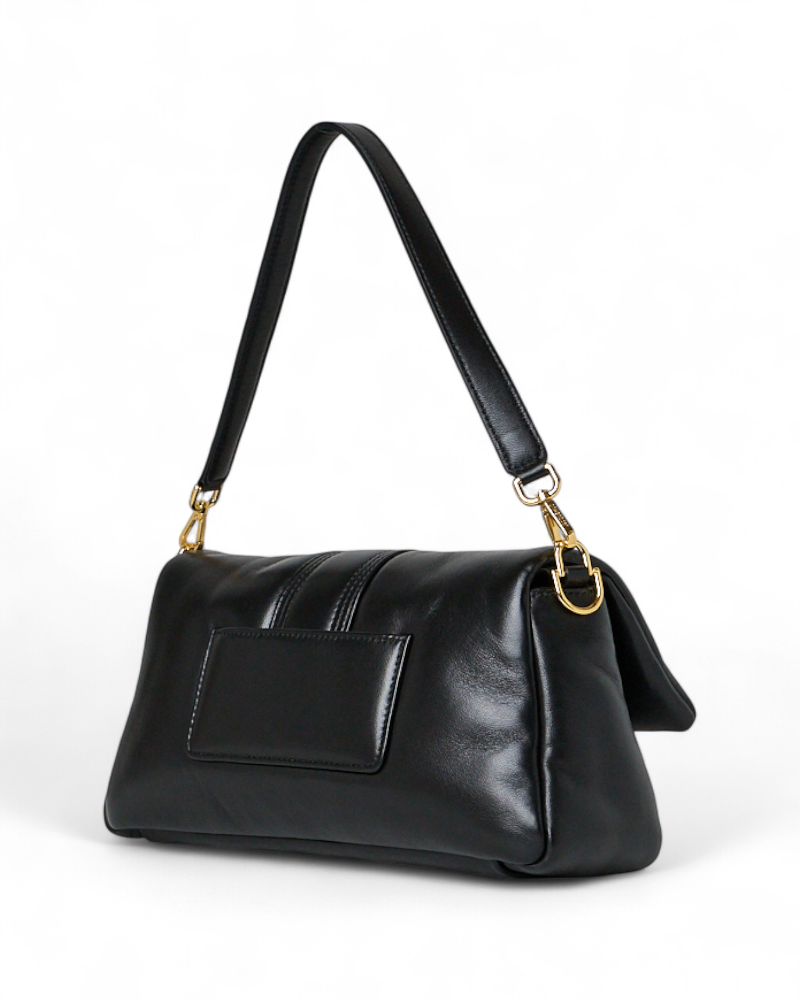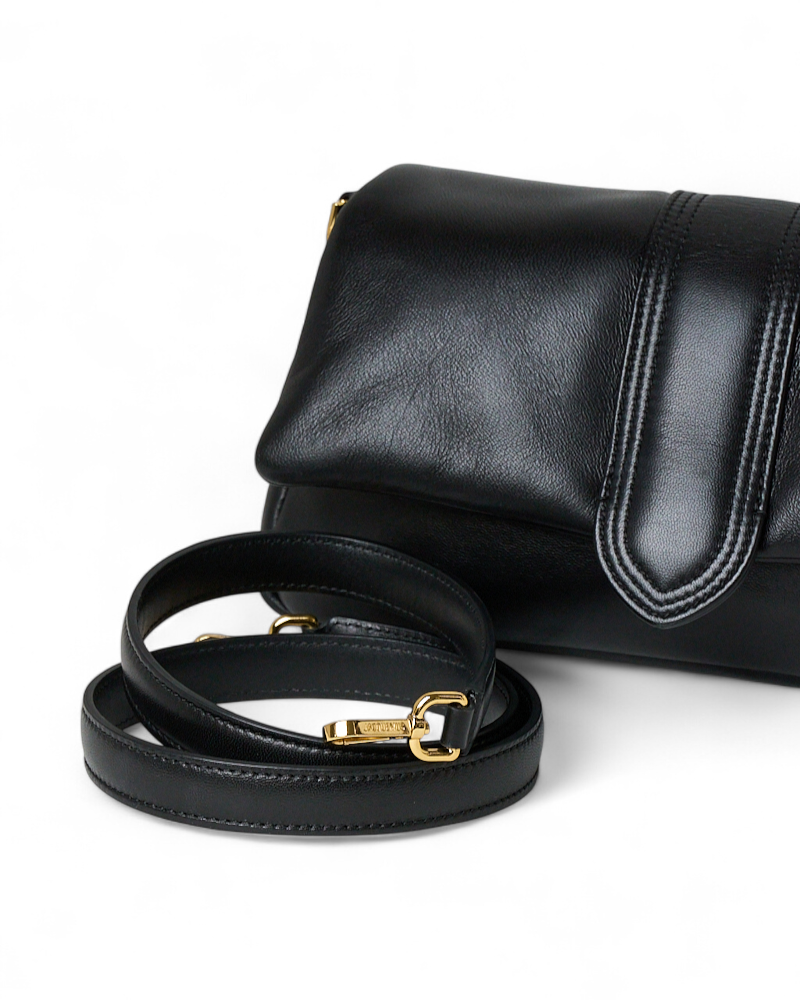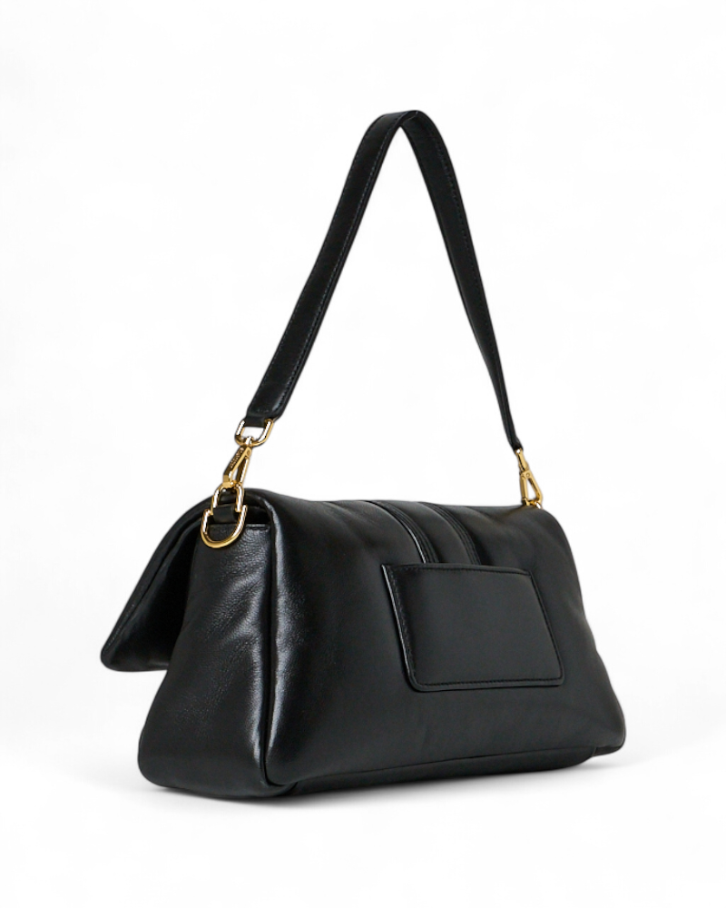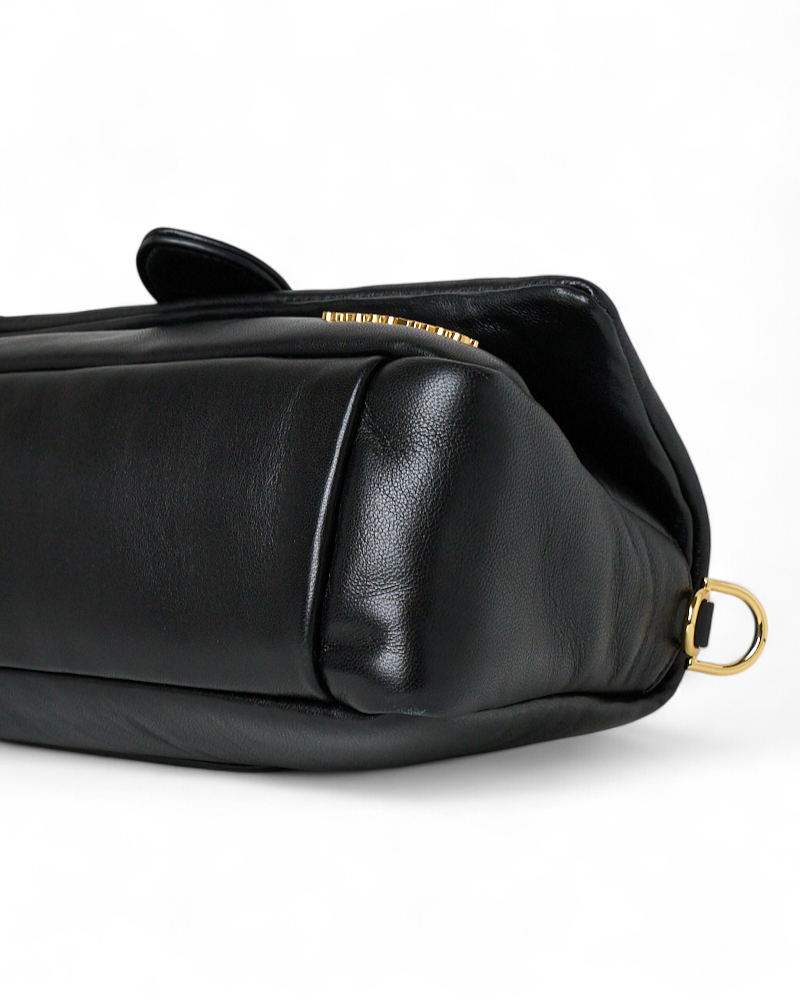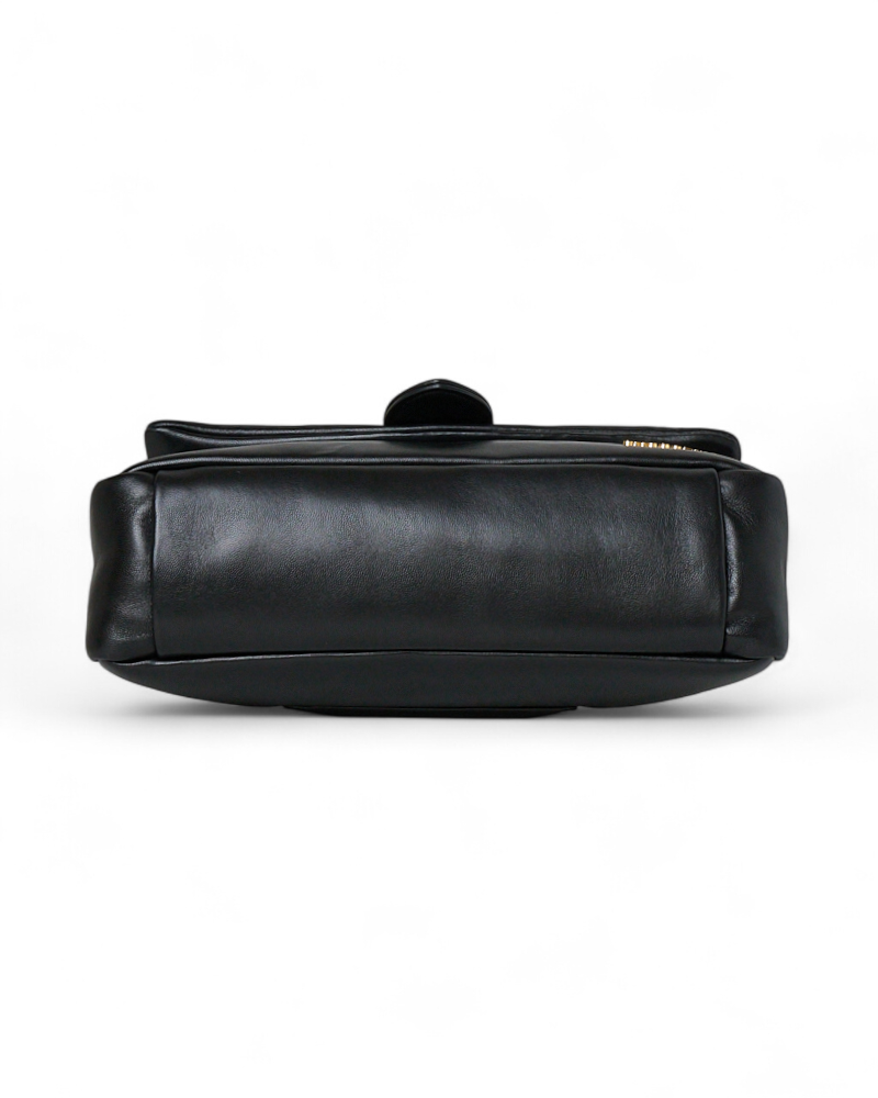 Borsa firmata Jacquemus, modello Le Bambinou nella misura grand, realizzata in pelle nero con hardware dorati. Dotata di una patta frontale con chiusura magnetica, internamente rivestita in tela beige con piccola tasca, la borsa è capeinte per l’essenziale. Munita di un manico e di una tracolla rimovibili, per una portata a spalla o a tracolla. L’articolo si presenta in condizioni pari al nuovo.