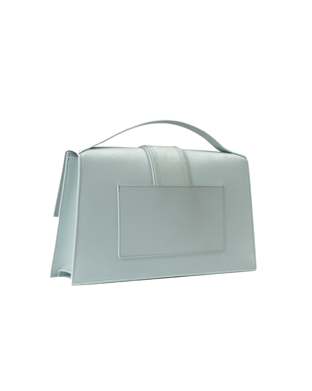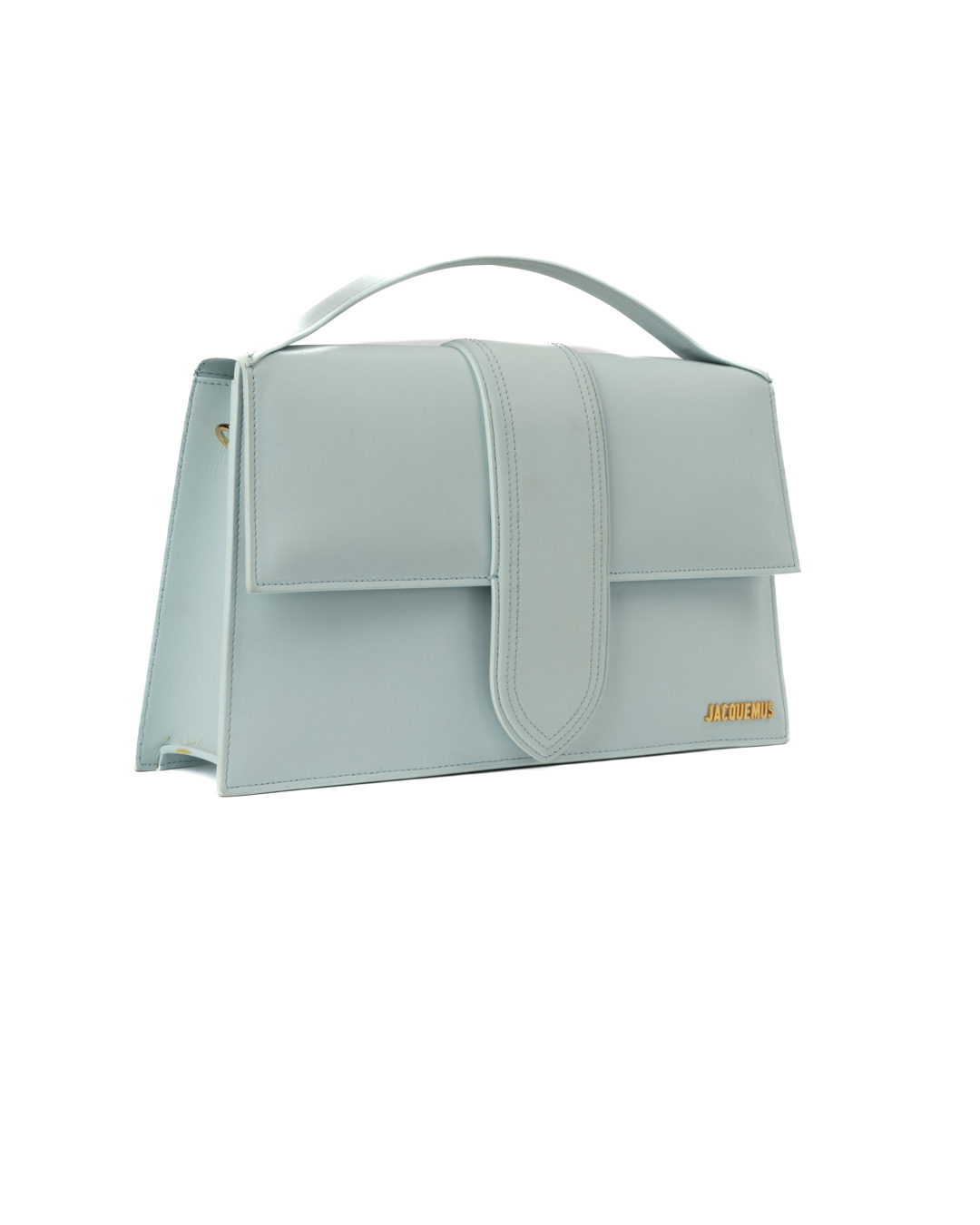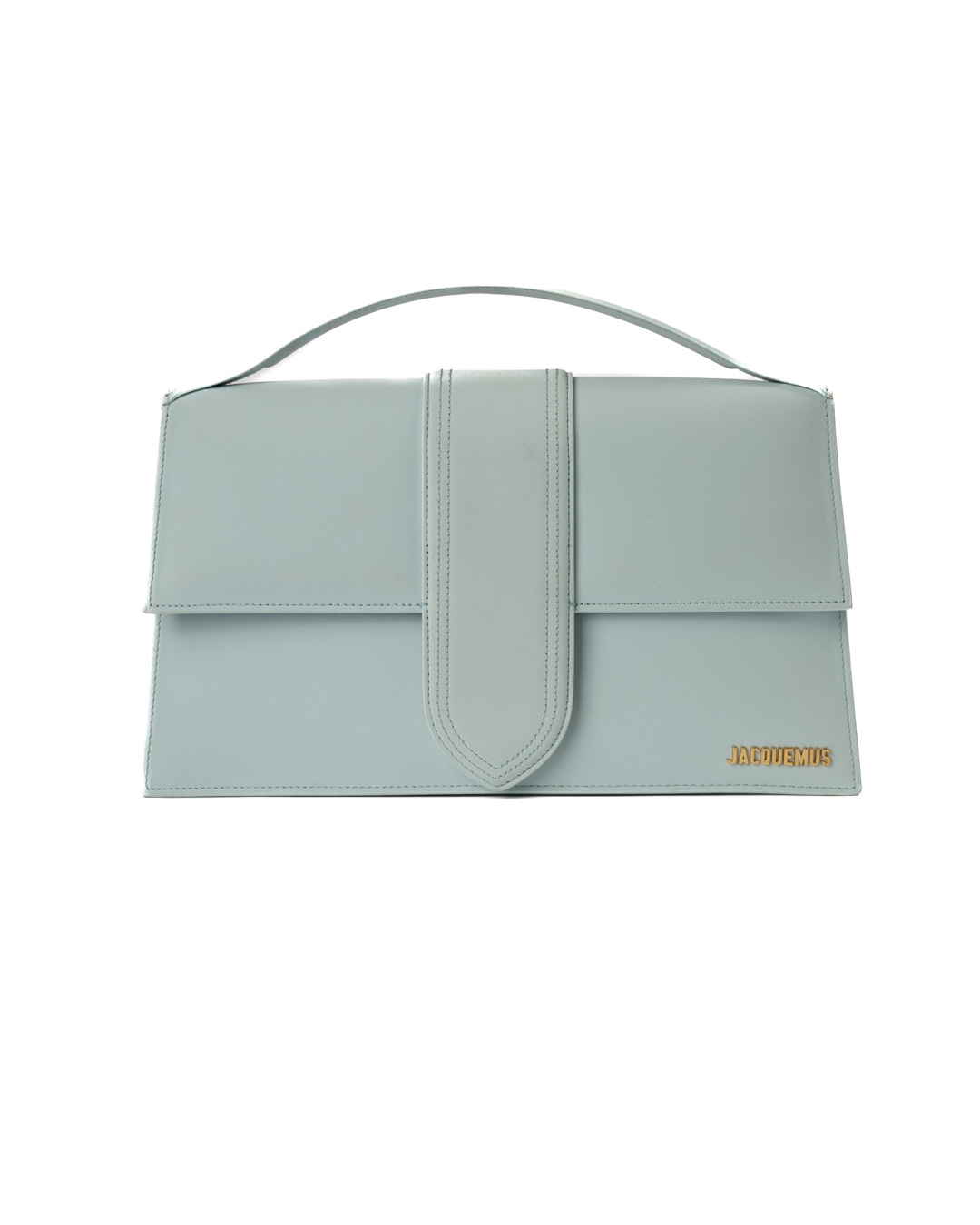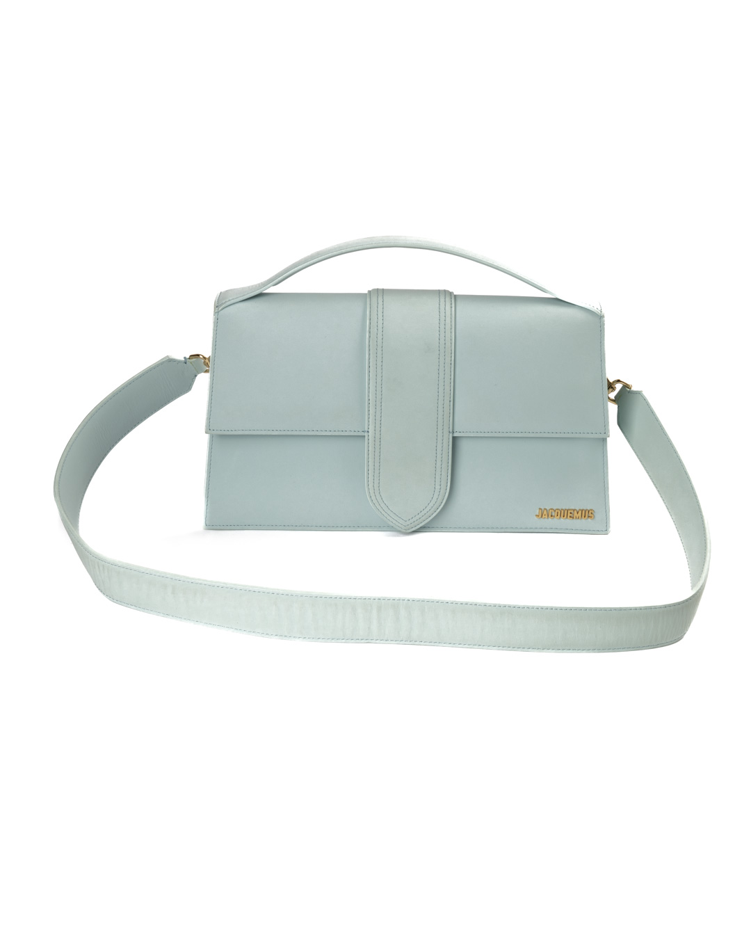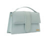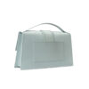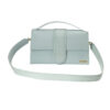 Borsa firmata Jacquemus, modello Le Bambinou Large, realizzata in pelle azzurra con hardware dorata. Dotata di una patta con chiusura calamitata, internamente rivestita in tela beige con comoda tasca, la borsa è abbastanza capiente. Munita di un manico e di una tracolla rimovibile, per una comoda portata a mano o a spalla. L’articolo si presenta in buone condizioni.
