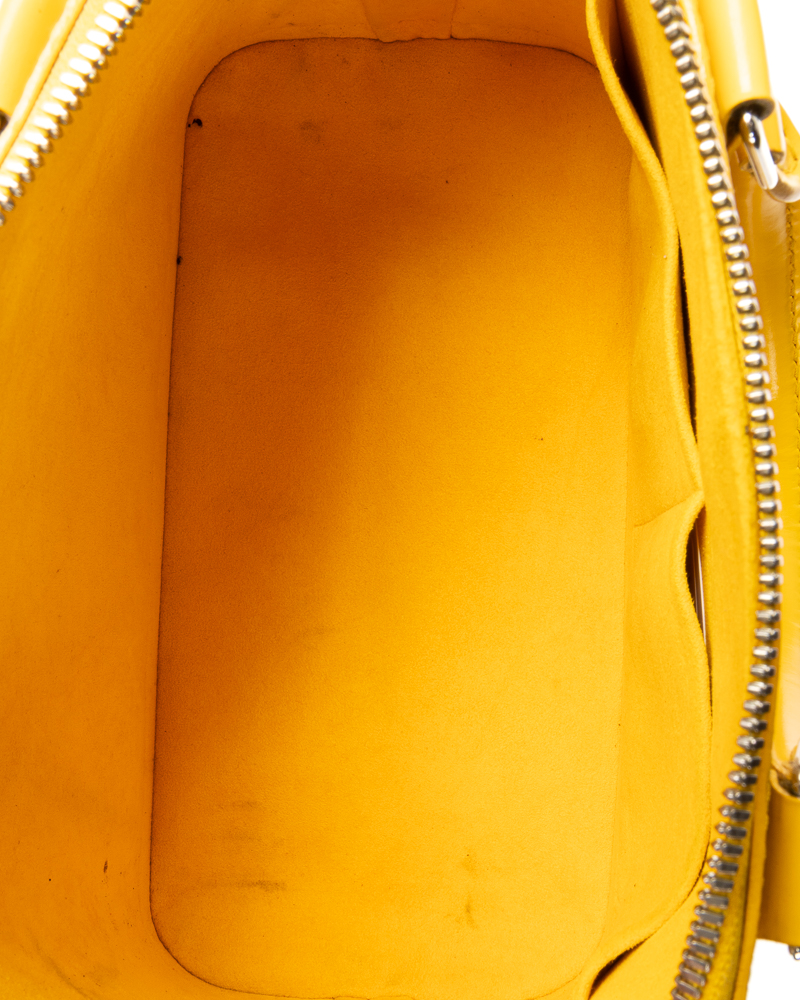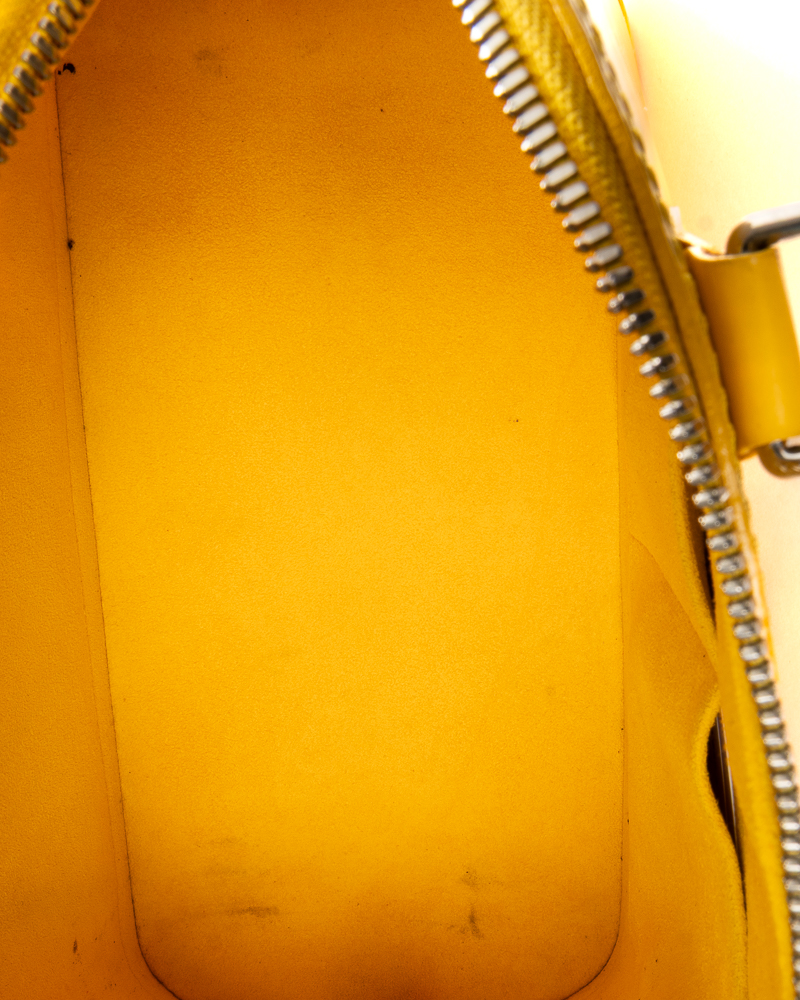 Borsa firmata Louis Vuitton, modello Alma nella misura MM, realizzata in pelle epi gialla con hardware argento. Dotata di una chiusura semicircolare a zip con doppio cursore, internamente rivestita in tessuto scamosciato tono su tono con comode tasche, la borsa è abbastanza capiente. Munita di doppio manico in pelle liscia, per una comoda portata a mano. Completa di lucchetto e chiavi. L’articolo si presenta in buone condizioni, con piccole usure visibili in foto.