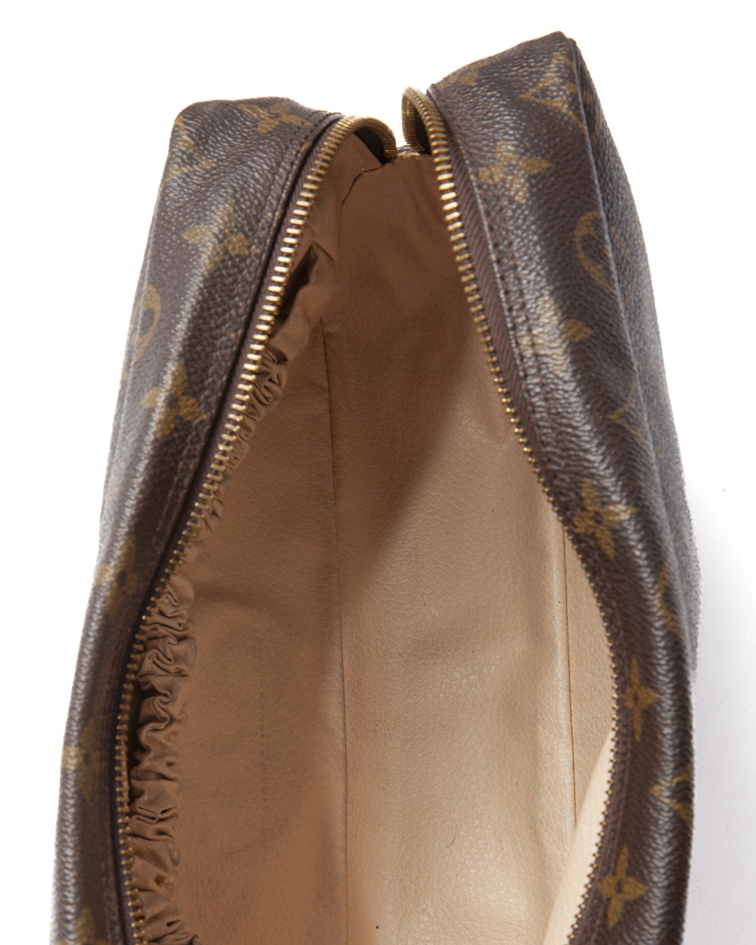 Pochette firmata Louis Vuitton, modello Beauty travel nella misura GM, realizzata in tela marrone nella classica fantasia monogram con hardware dorato. Dotata di una chiusura superiore a zip, internamente rivestita in pelle beige con comodi elastici e una tasca, la pochette è abbastanza capiente. L’articolo si presenta in ottime condizioni.