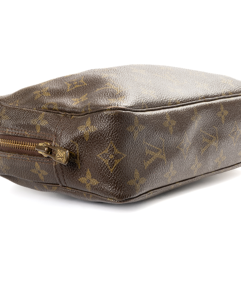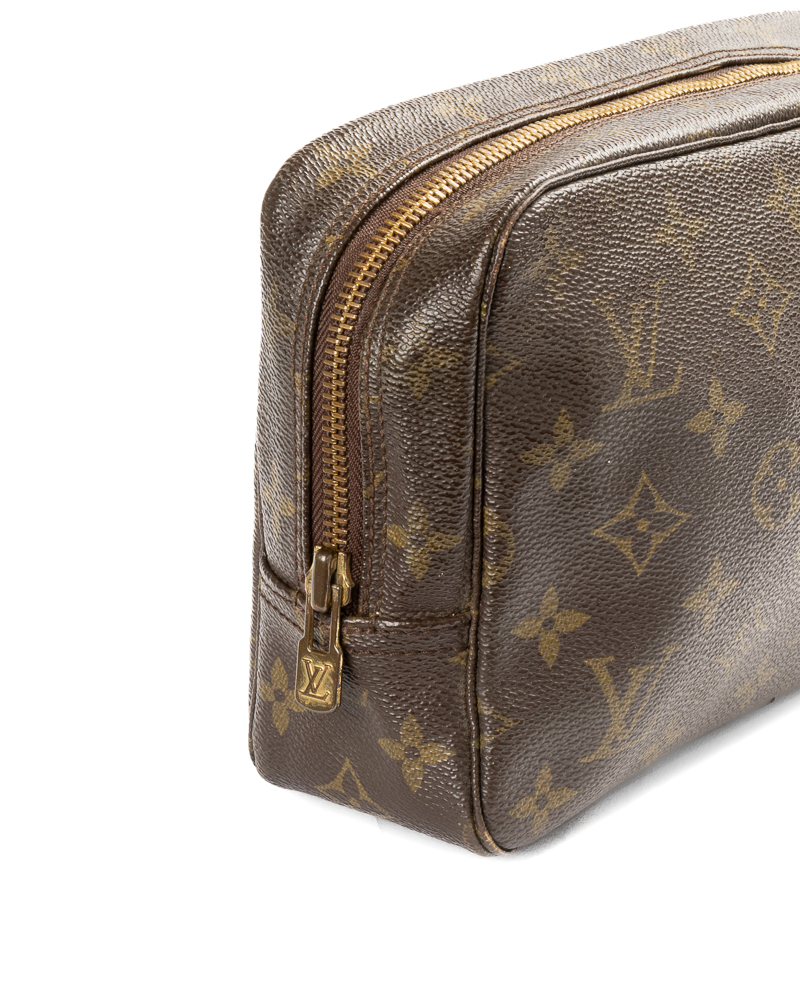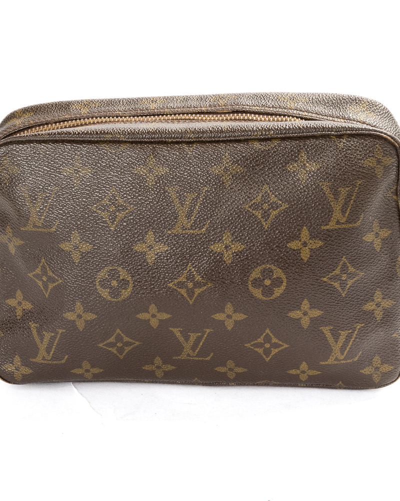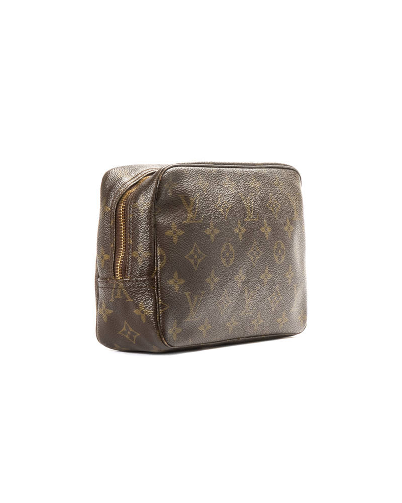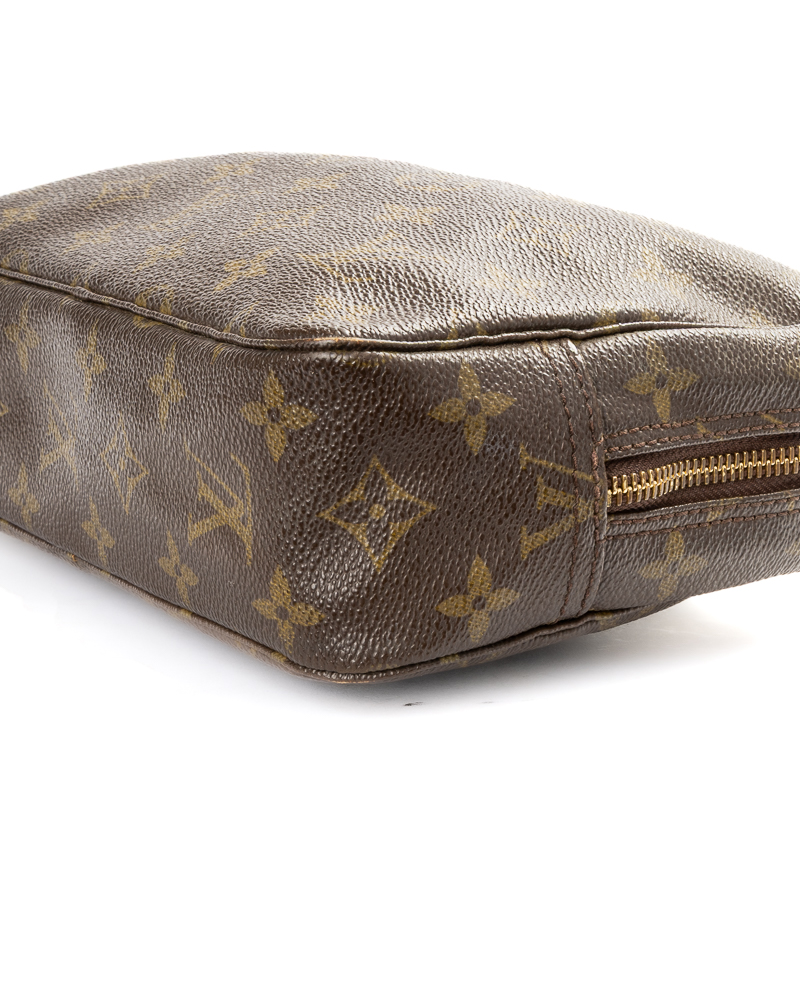Pochette firmata Louis Vuitton, modello Beauty Travel nella misura PM, realizzata in tela marrone nella classica fantasia monogram con hardware dorato. Dotata di una chiusura superiore a zip, internamente rivestita in pelle beige con comodi elastici e tasca, la pochette è abbastanza capiente. L'articolo si presenta in buone condizioni, con segni di usura visibili in foto.