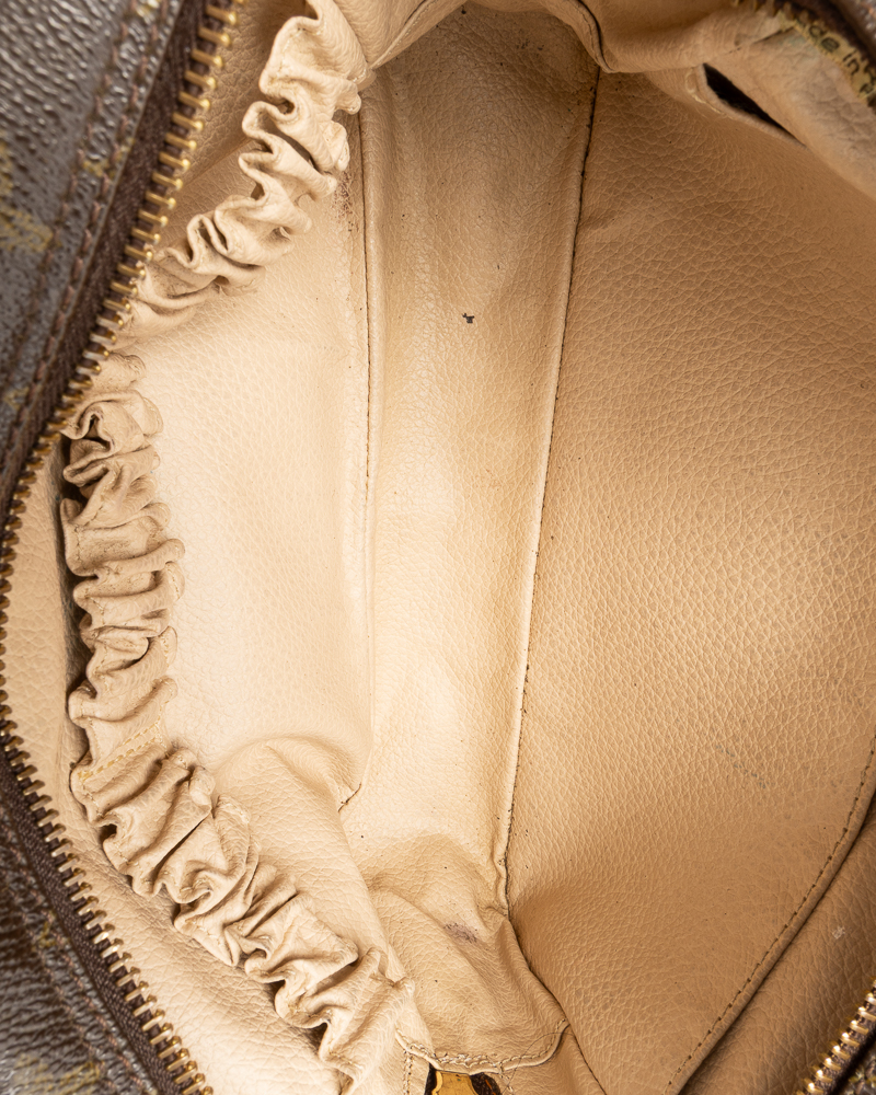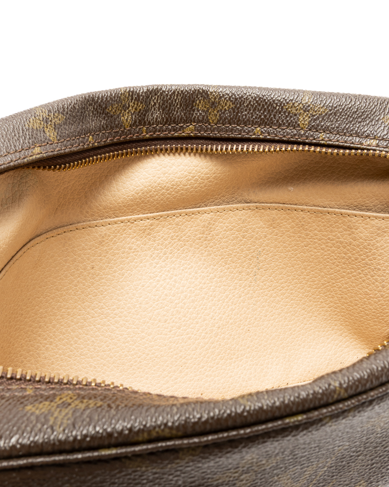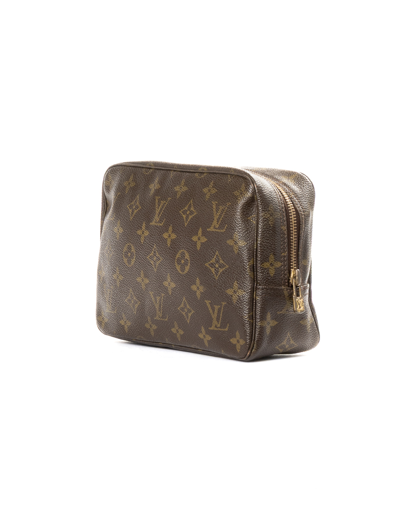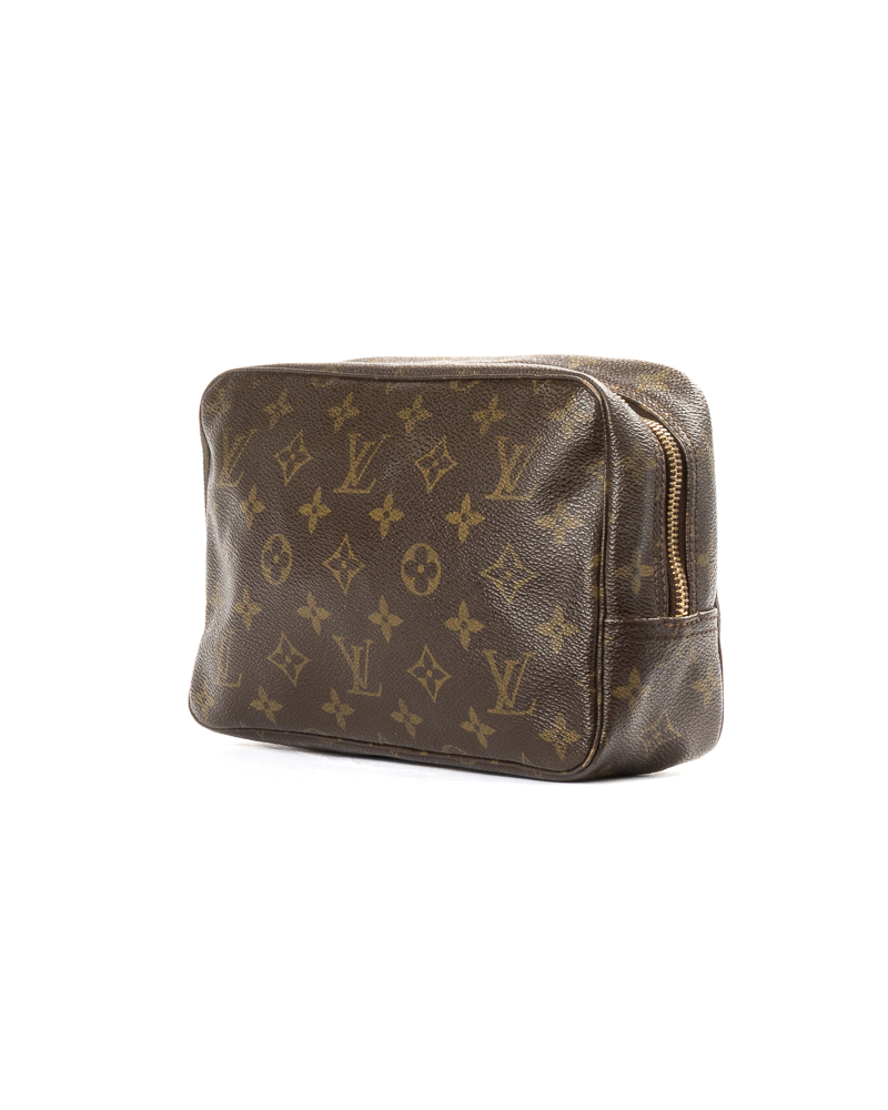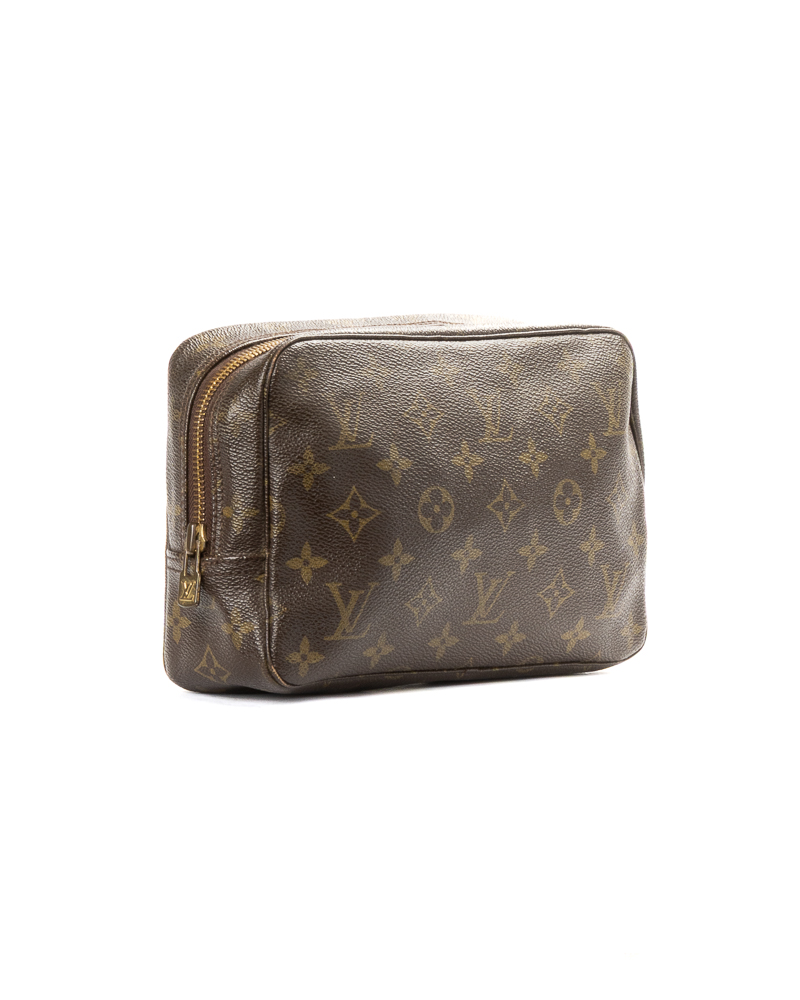 Pochette firmata Louis Vuitton, modello Beauty Travel nella misura PM, realizzata in tela marrone nella classica fantasia monogram con hardware dorato. Dotata di una chiusura superiore a zip, internamente rivestita in pelle beige con comodi elastici e tasca, la pochette è abbastanza capiente. L'articolo si presenta in buone condizioni, con segni di usura visibili in foto.