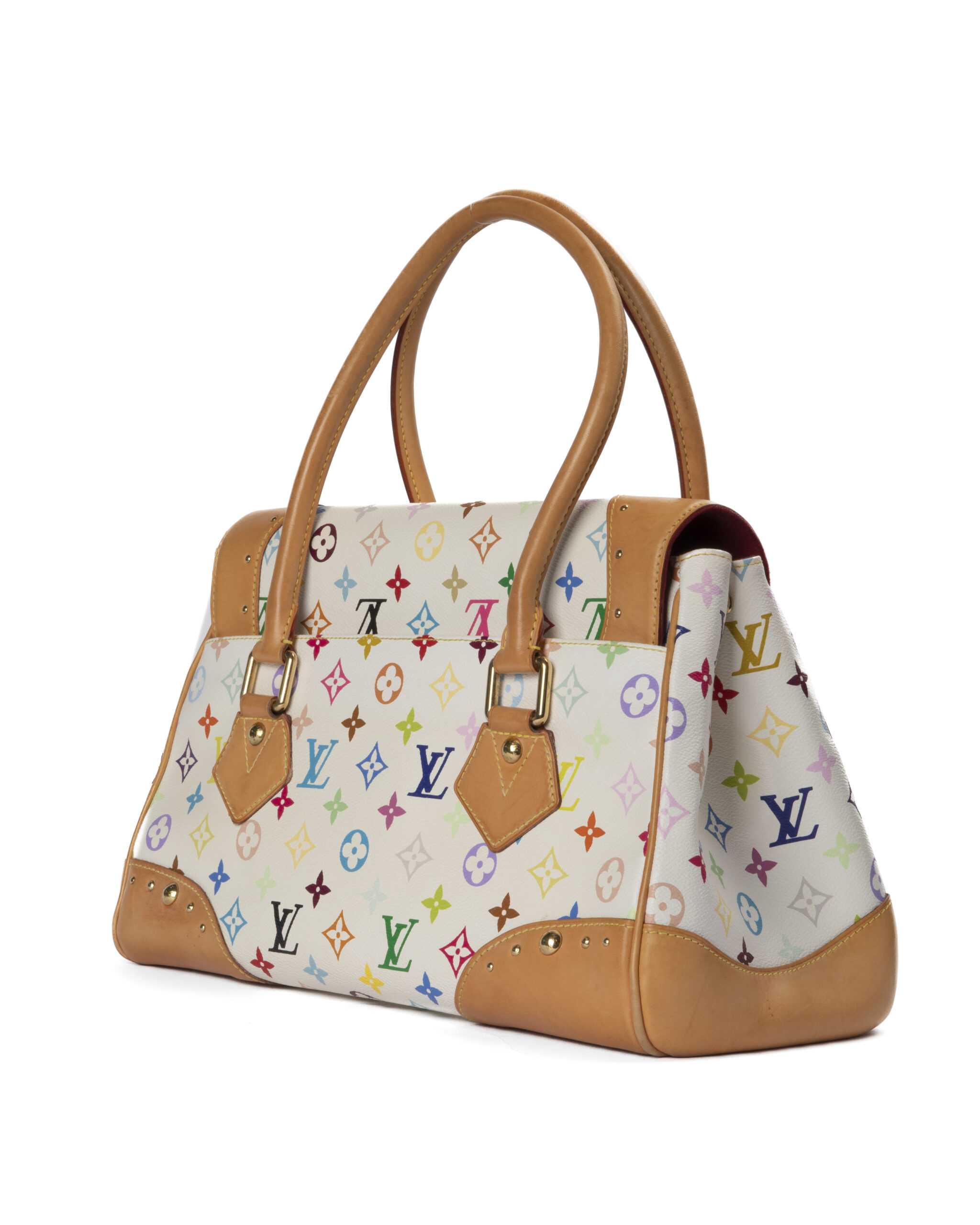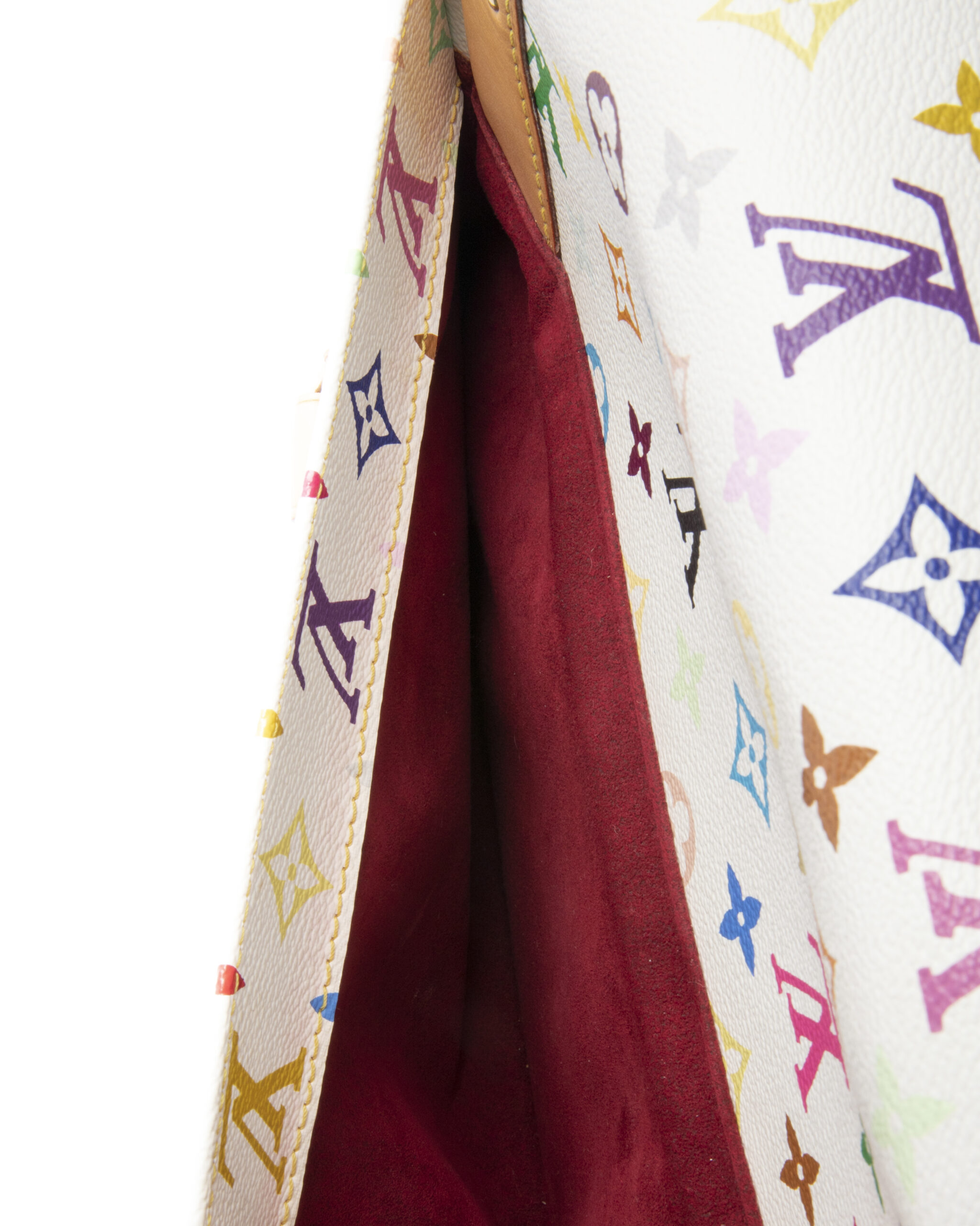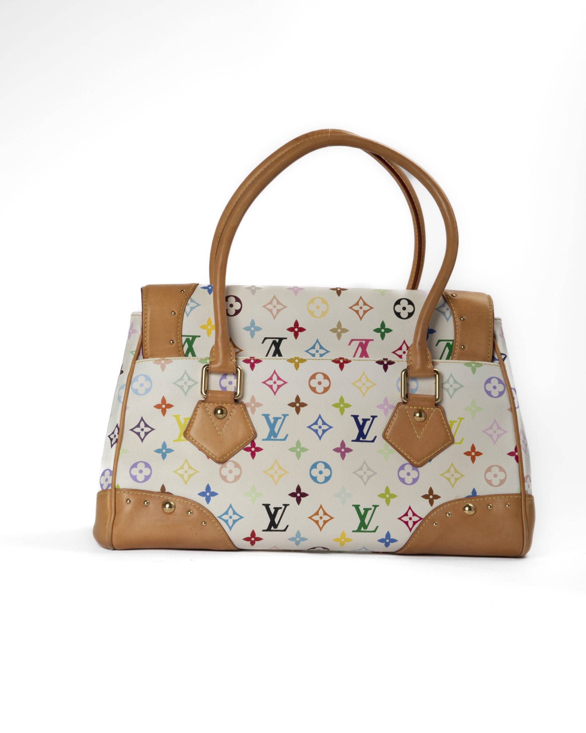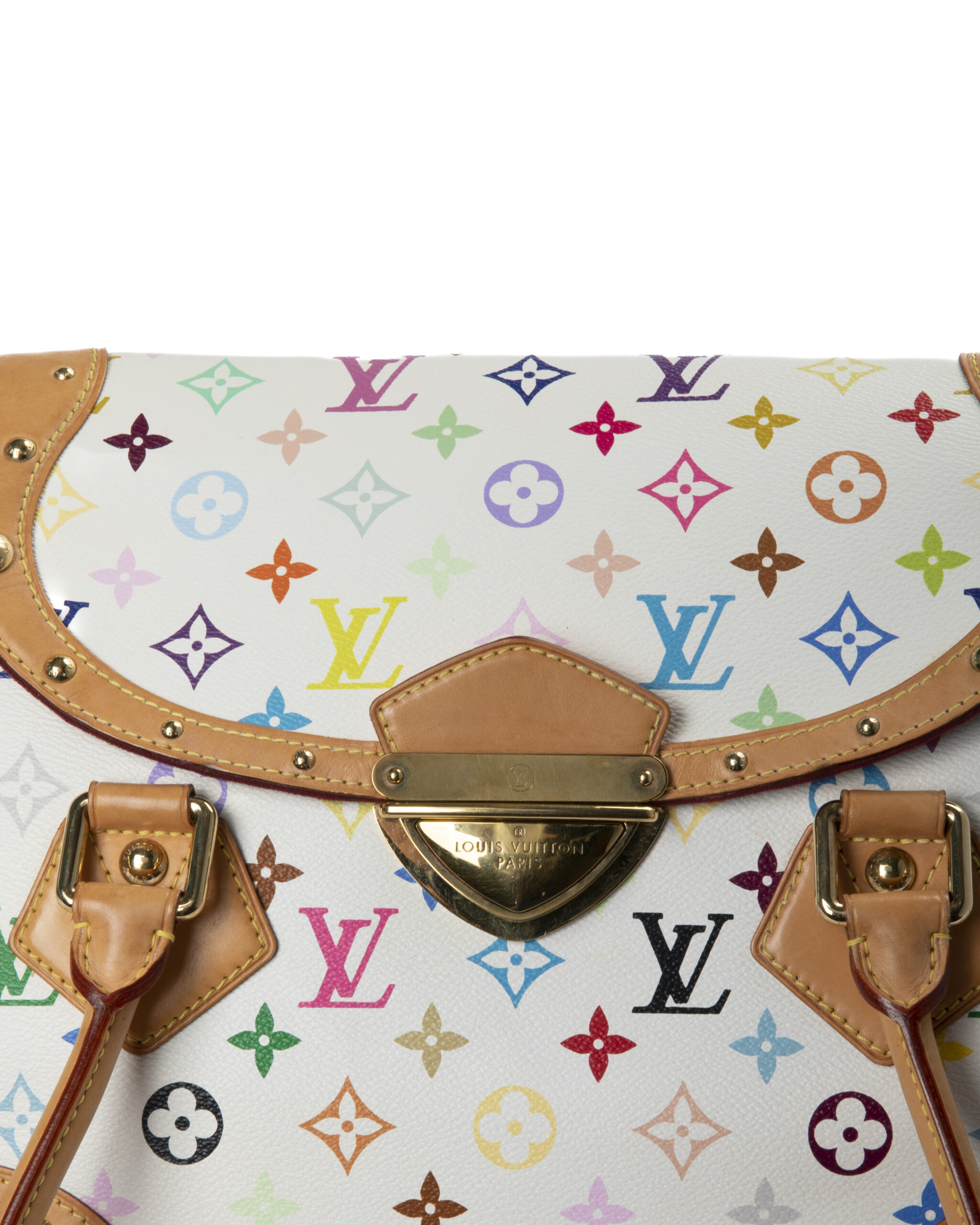 Borsa firmata Louis Vuitton, modello Beverly nella misura GM,i n edizione limitata in collaborazione con Takashi Murakami. Realizzata in tela bianca con la classica fantasia multicolor e inserti in vacchetta con hardware dorato. Dotata di una patta con chiusura ad incastro, internamente rivestita in tessuto scamosciato bordeaux con comode tasche, la borsa è abbastanza capiente. Munita di doppio manico in vacchetta, per una comoda portata a spalla o a mano. L'articolo si presenta in buone condizioni, con segni su usura sulla vacchetta.