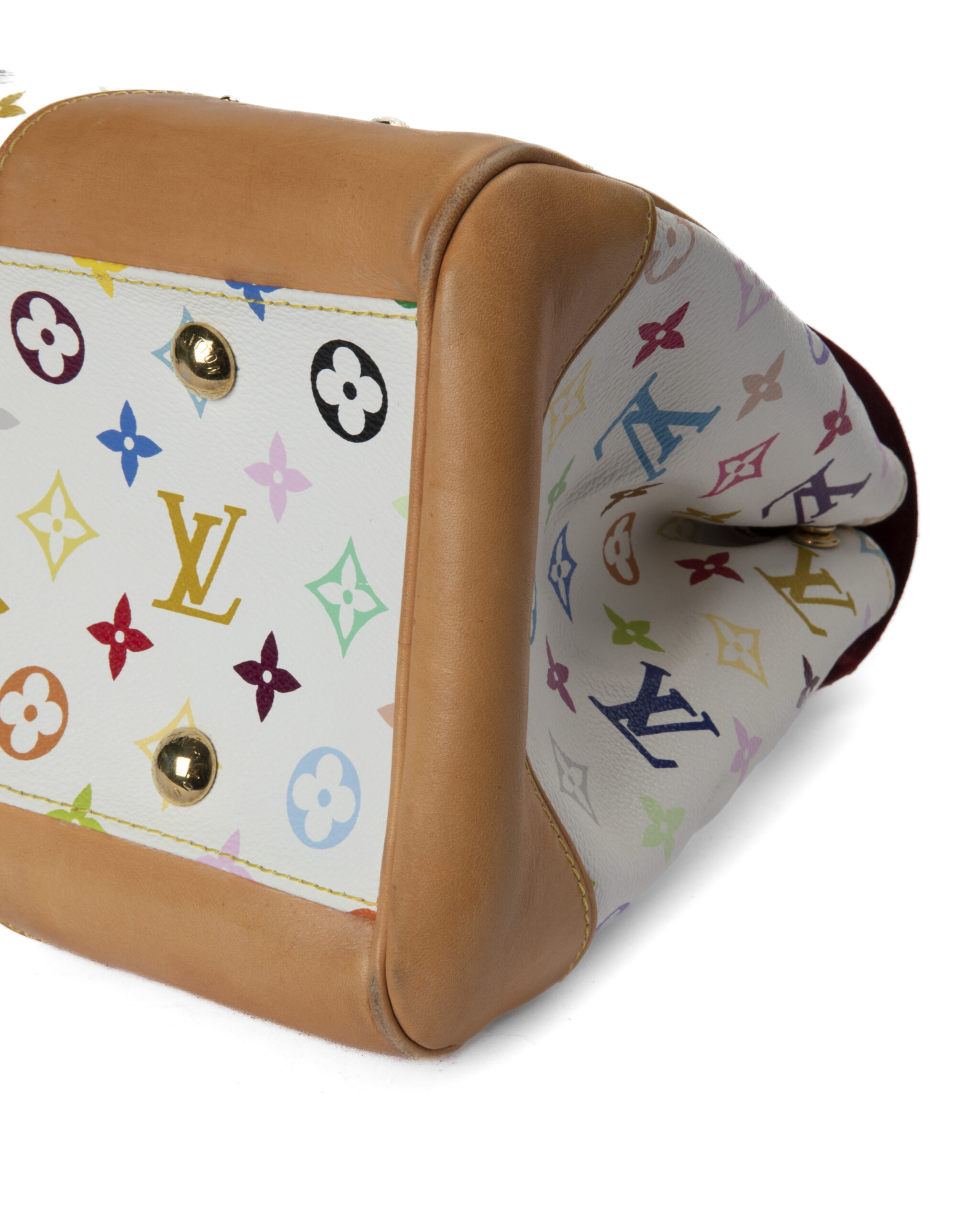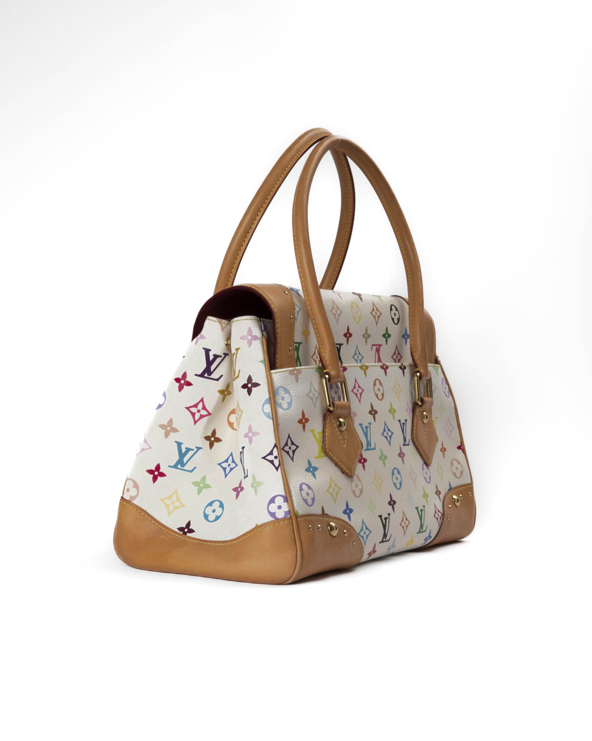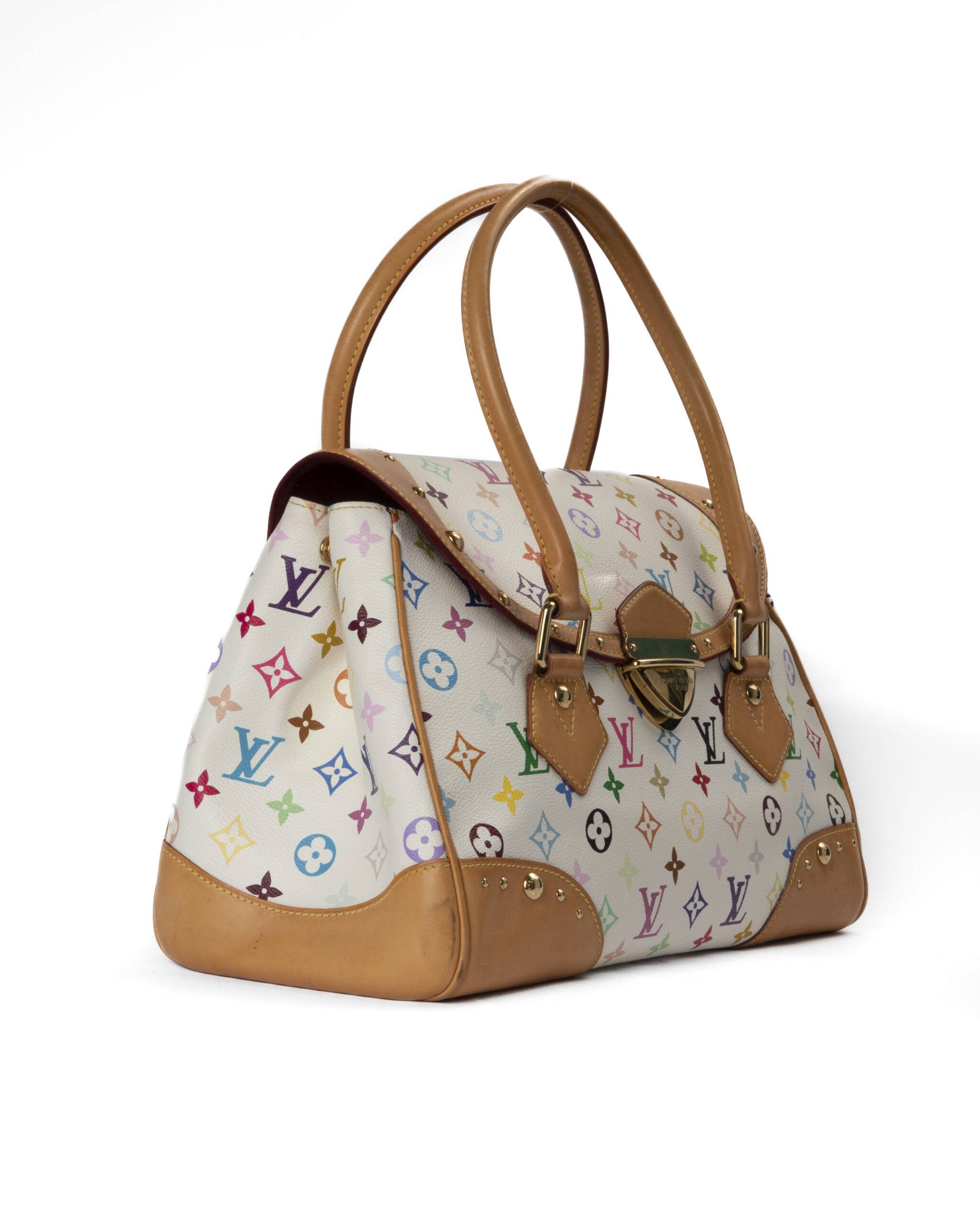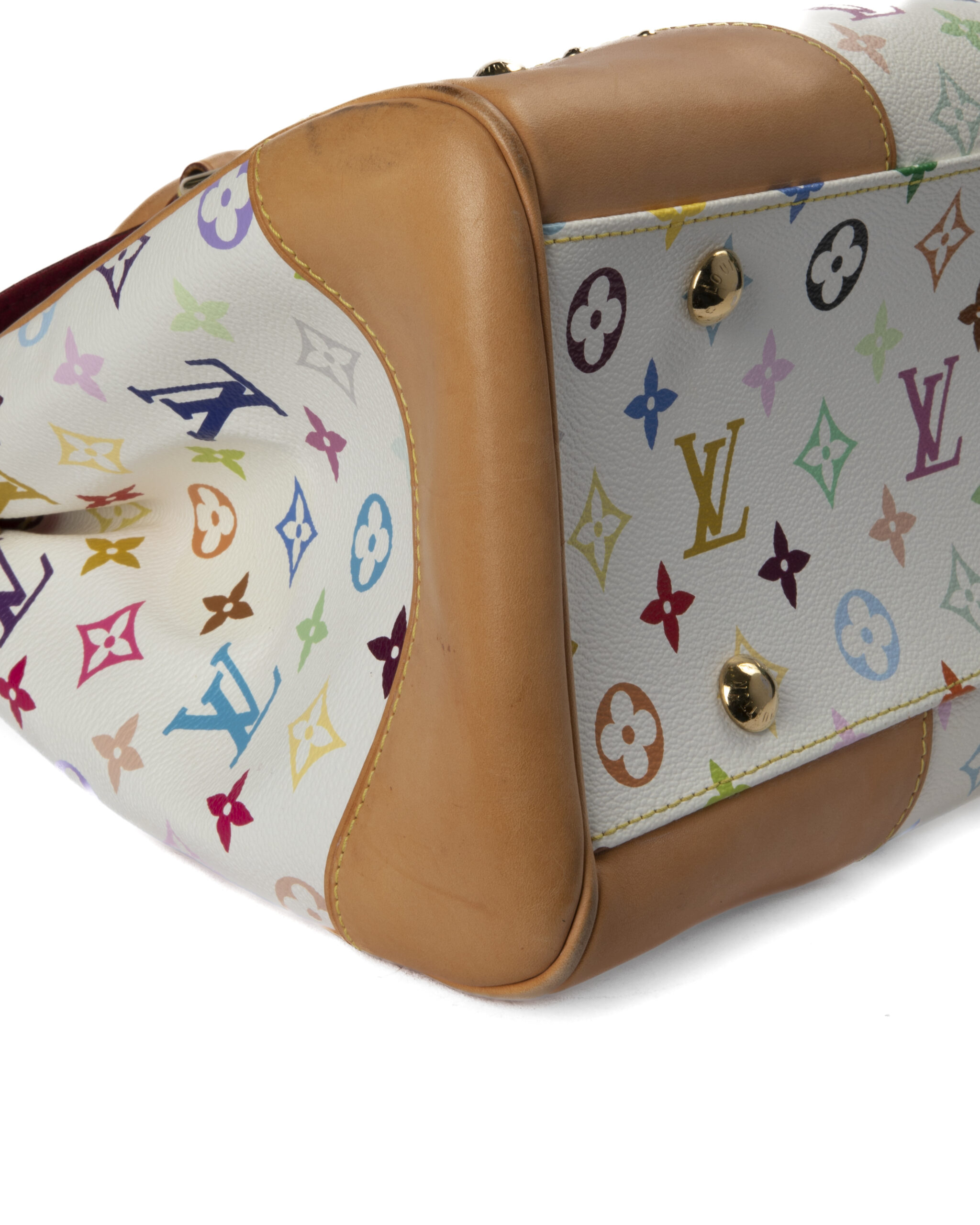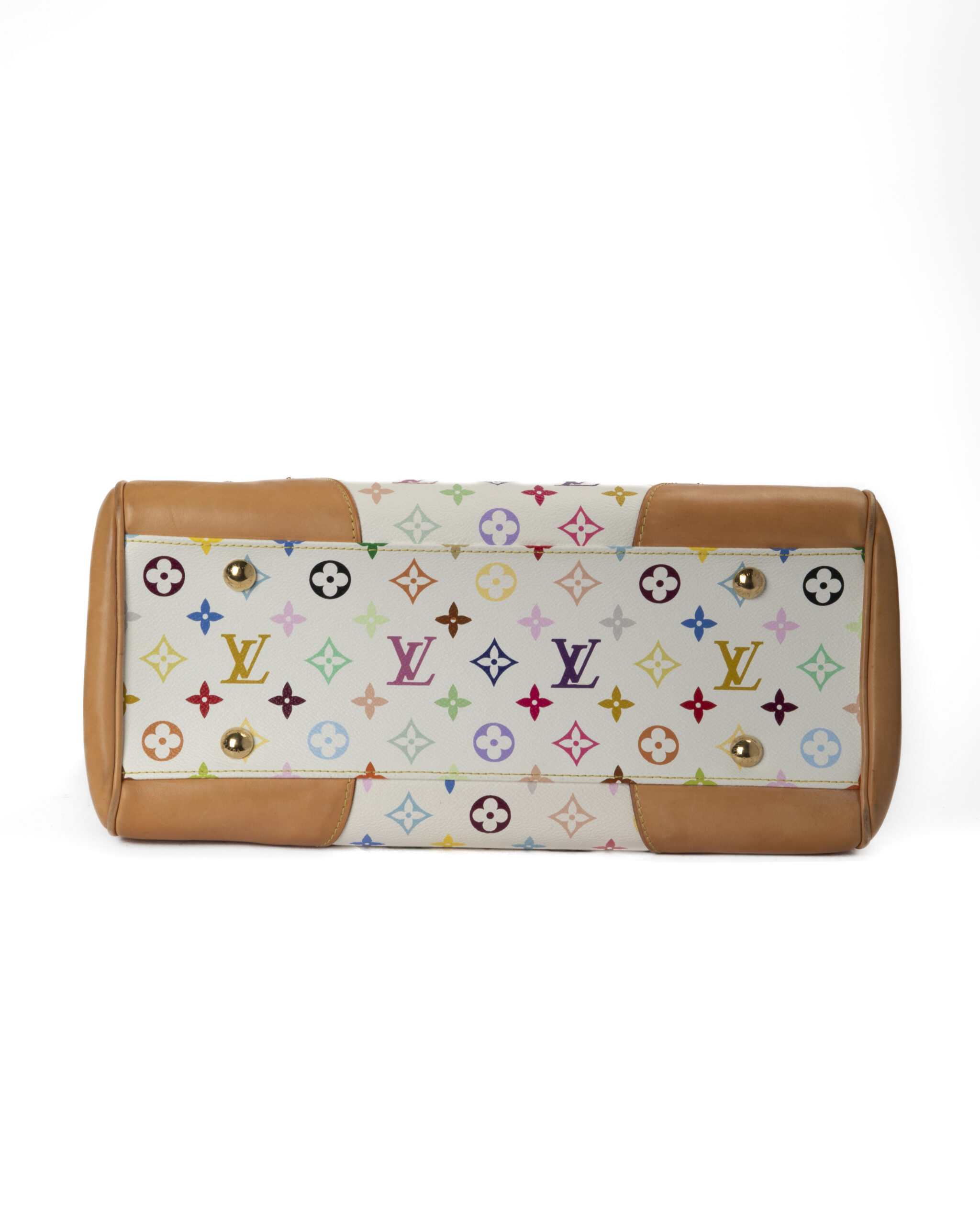 Borsa firmata Louis Vuitton, modello Beverly nella misura GM,i n edizione limitata in collaborazione con Takashi Murakami. Realizzata in tela bianca con la classica fantasia multicolor e inserti in vacchetta con hardware dorato. Dotata di una patta con chiusura ad incastro, internamente rivestita in tessuto scamosciato bordeaux con comode tasche, la borsa è abbastanza capiente. Munita di doppio manico in vacchetta, per una comoda portata a spalla o a mano. L'articolo si presenta in buone condizioni, con segni su usura sulla vacchetta.