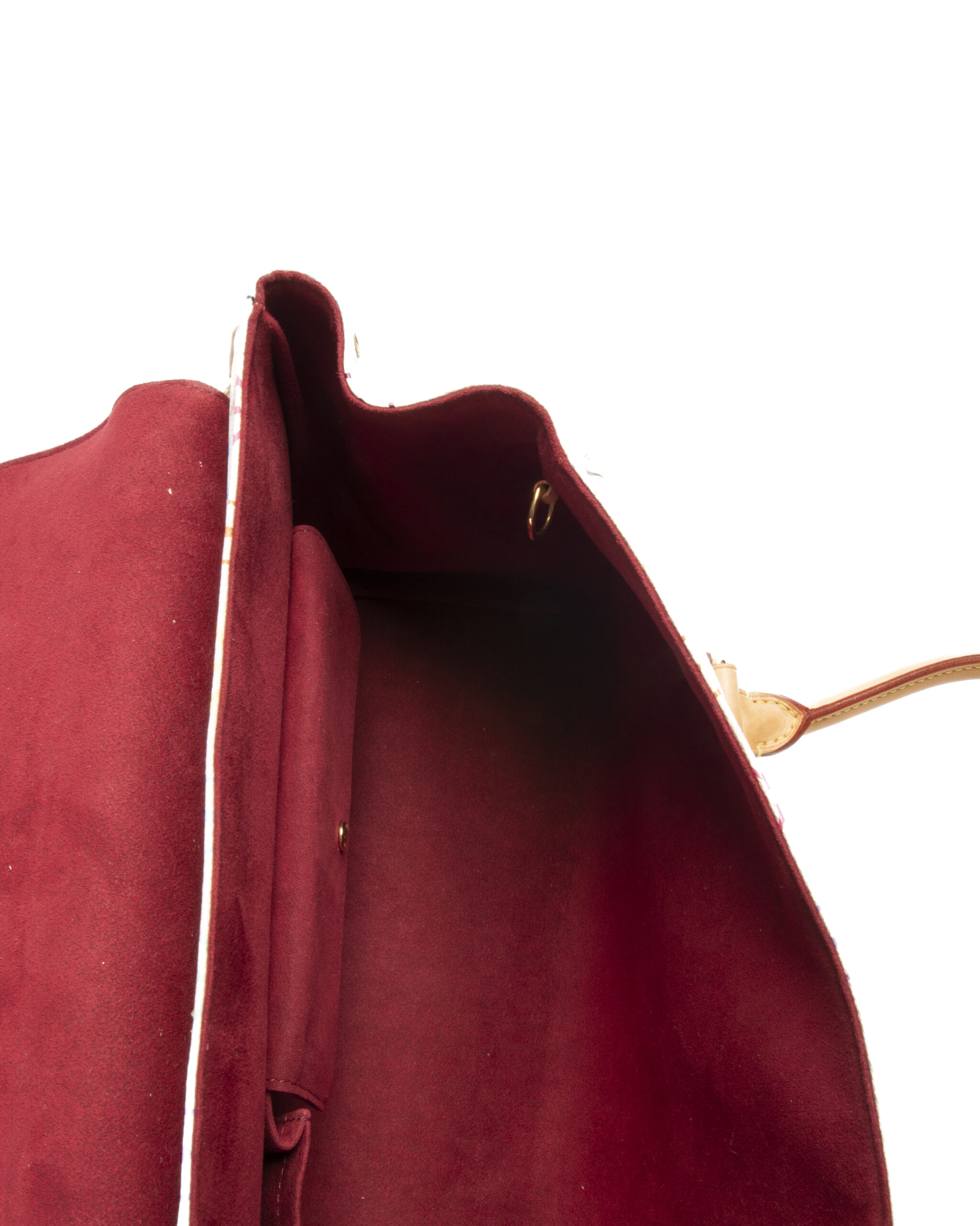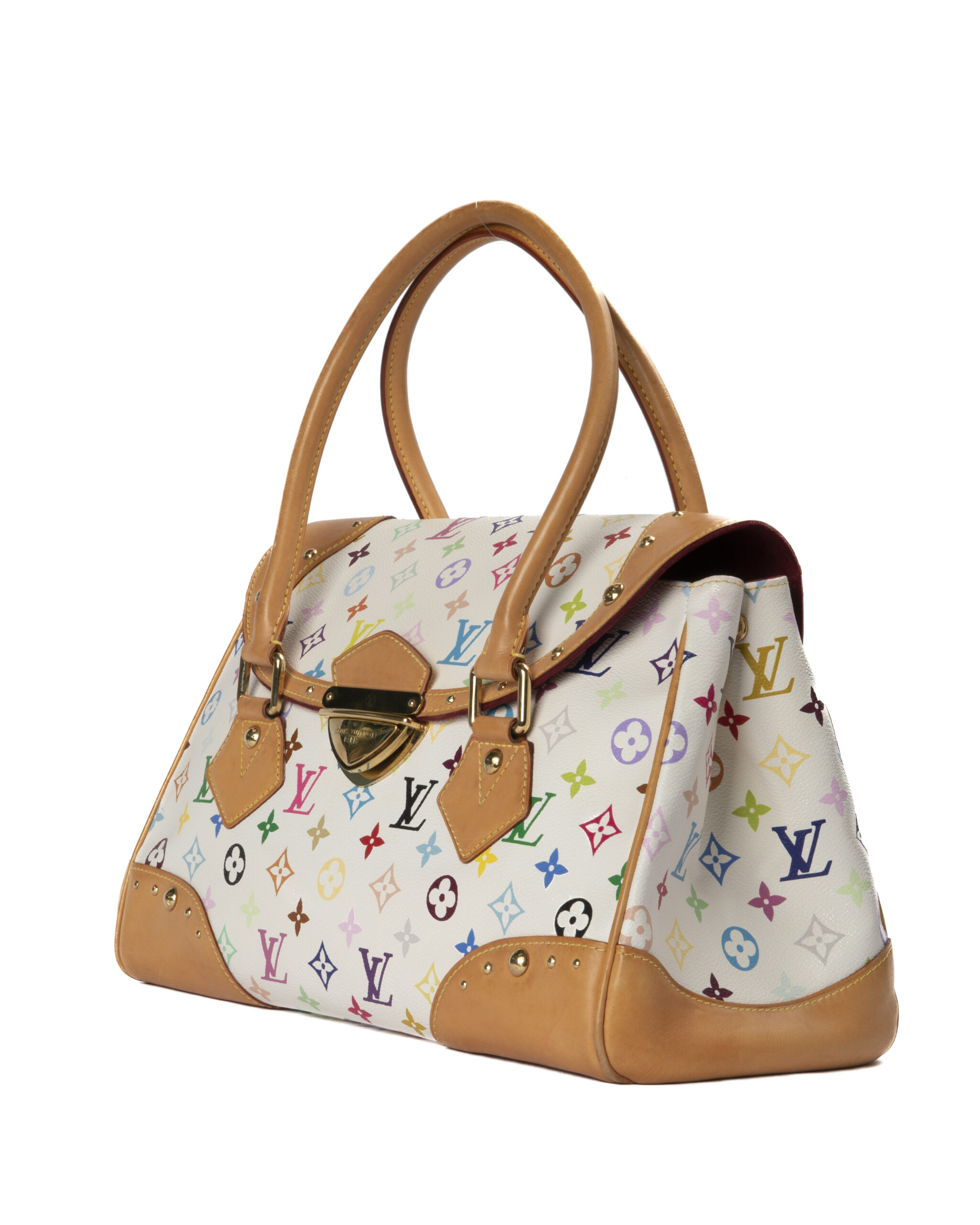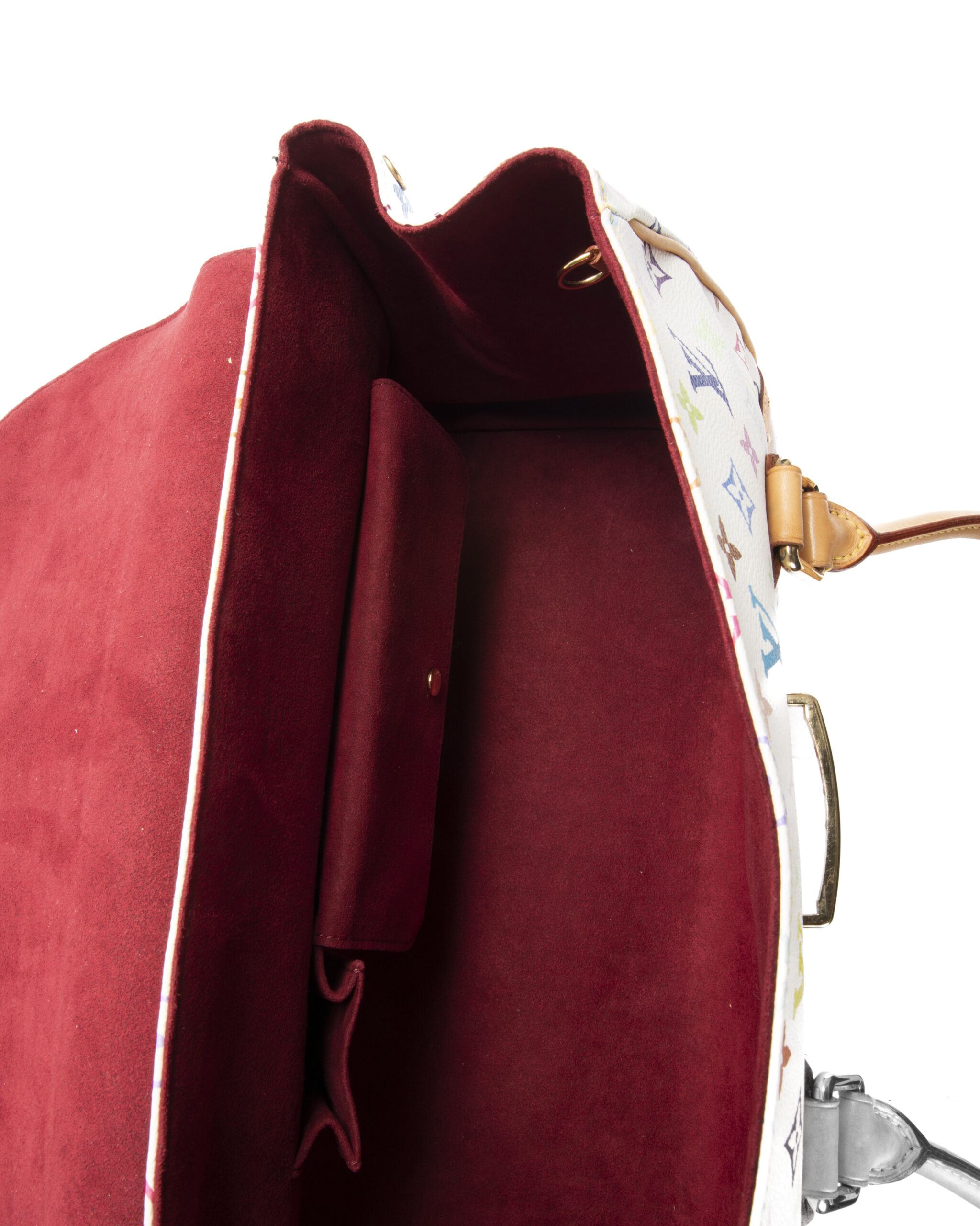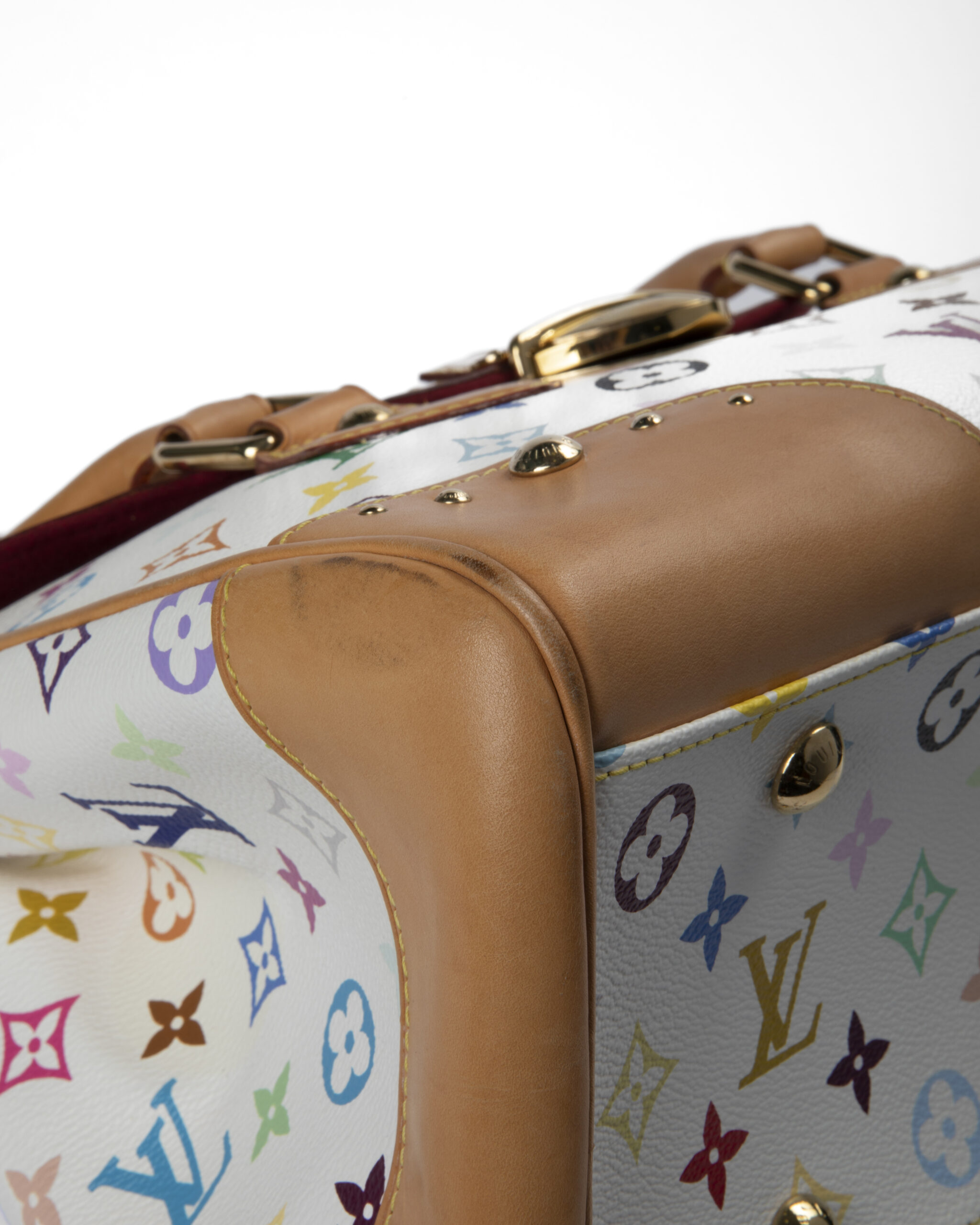 Borsa firmata Louis Vuitton, modello Beverly nella misura GM,i n edizione limitata in collaborazione con Takashi Murakami. Realizzata in tela bianca con la classica fantasia multicolor e inserti in vacchetta con hardware dorato. Dotata di una patta con chiusura ad incastro, internamente rivestita in tessuto scamosciato bordeaux con comode tasche, la borsa è abbastanza capiente. Munita di doppio manico in vacchetta, per una comoda portata a spalla o a mano. L'articolo si presenta in buone condizioni, con segni su usura sulla vacchetta.