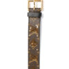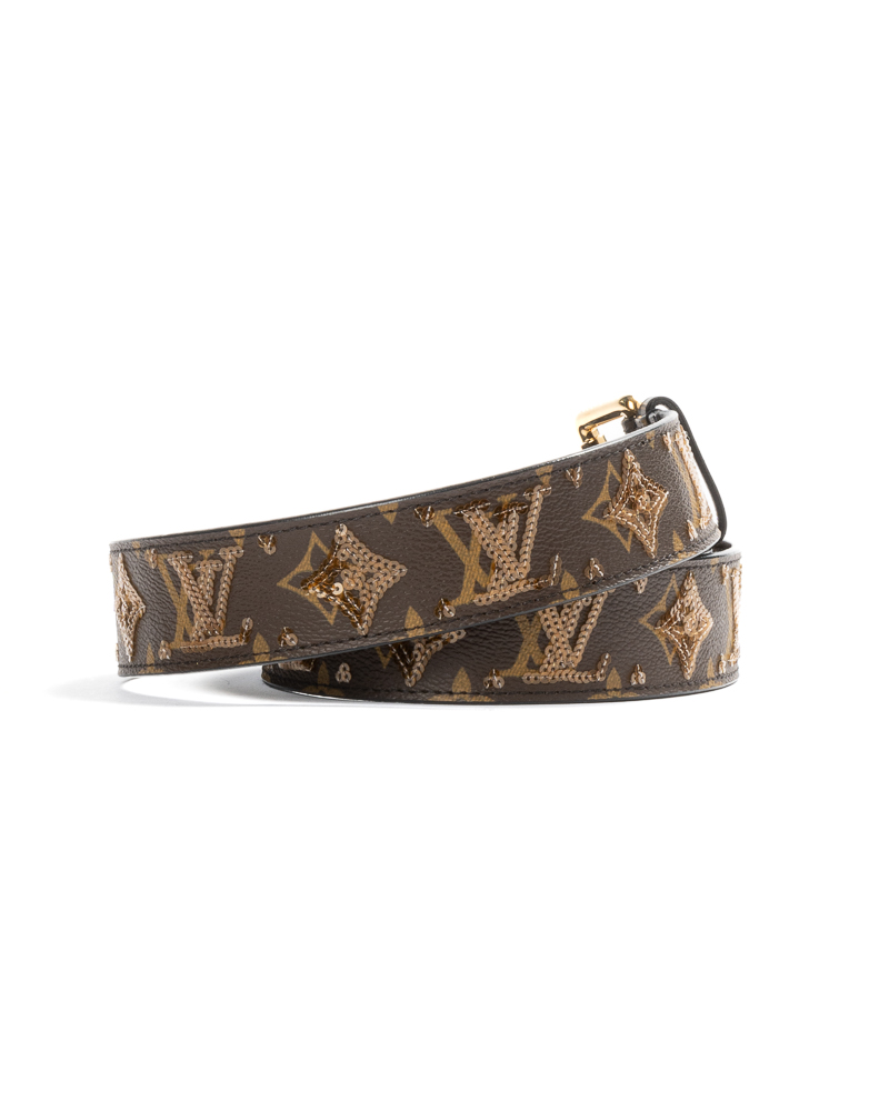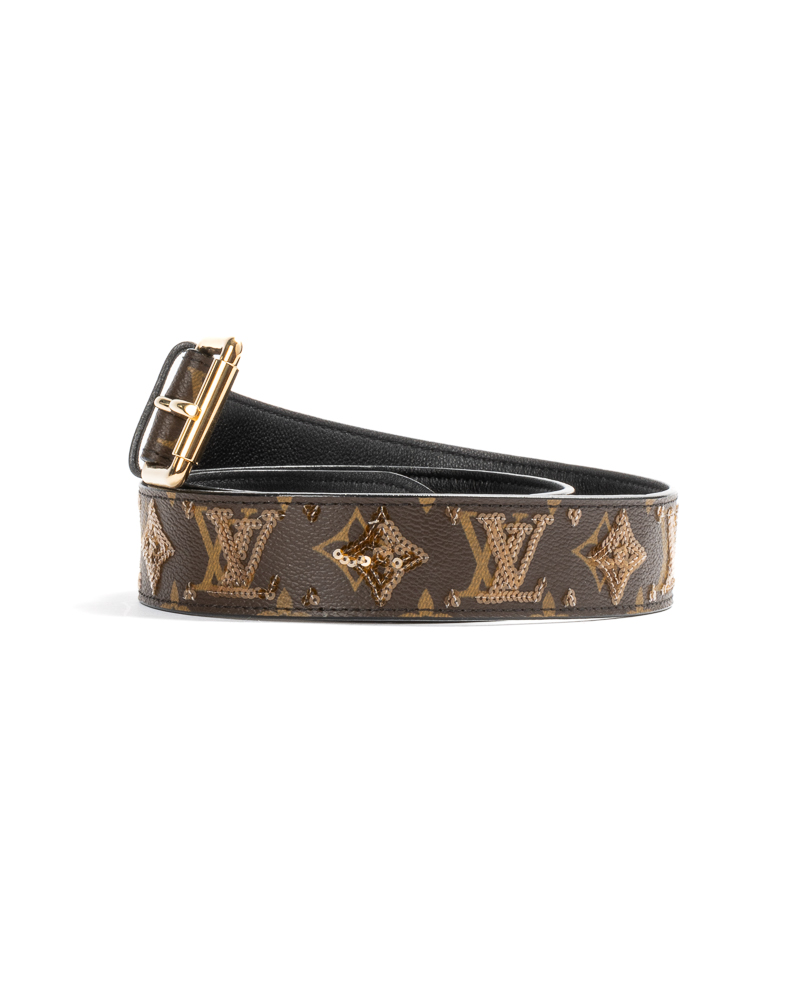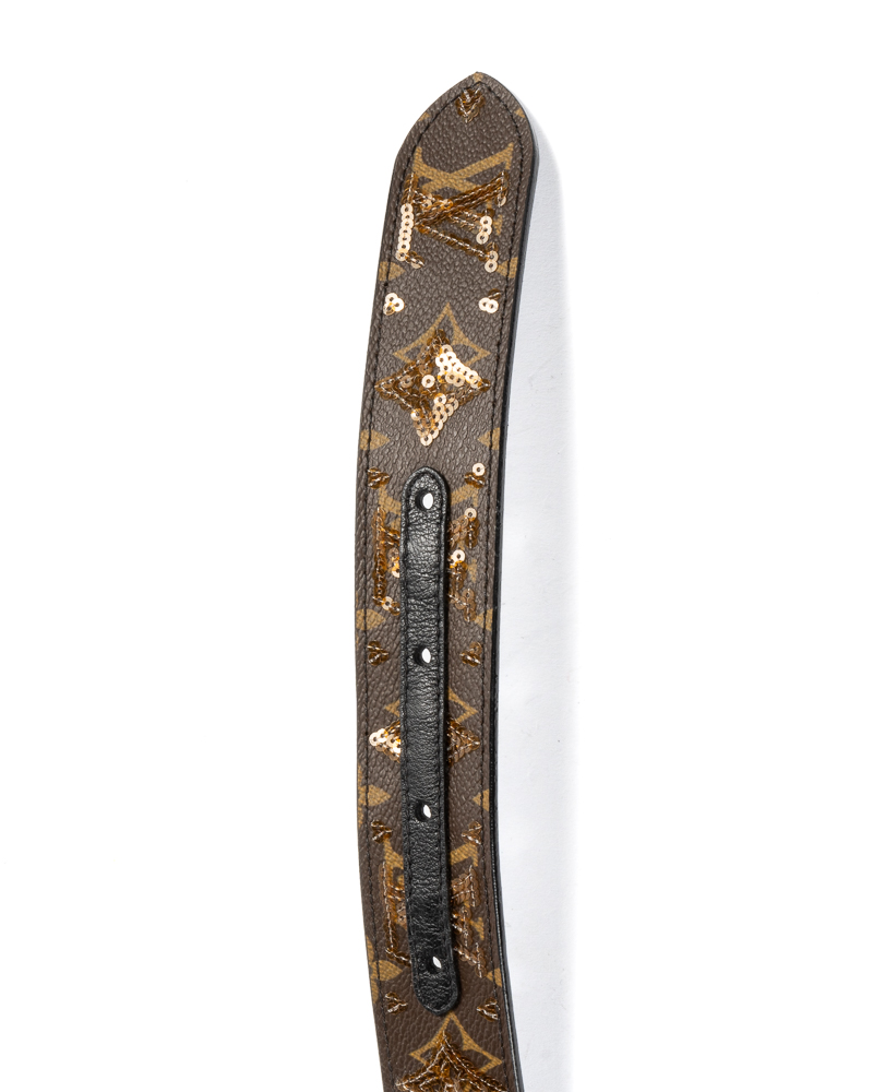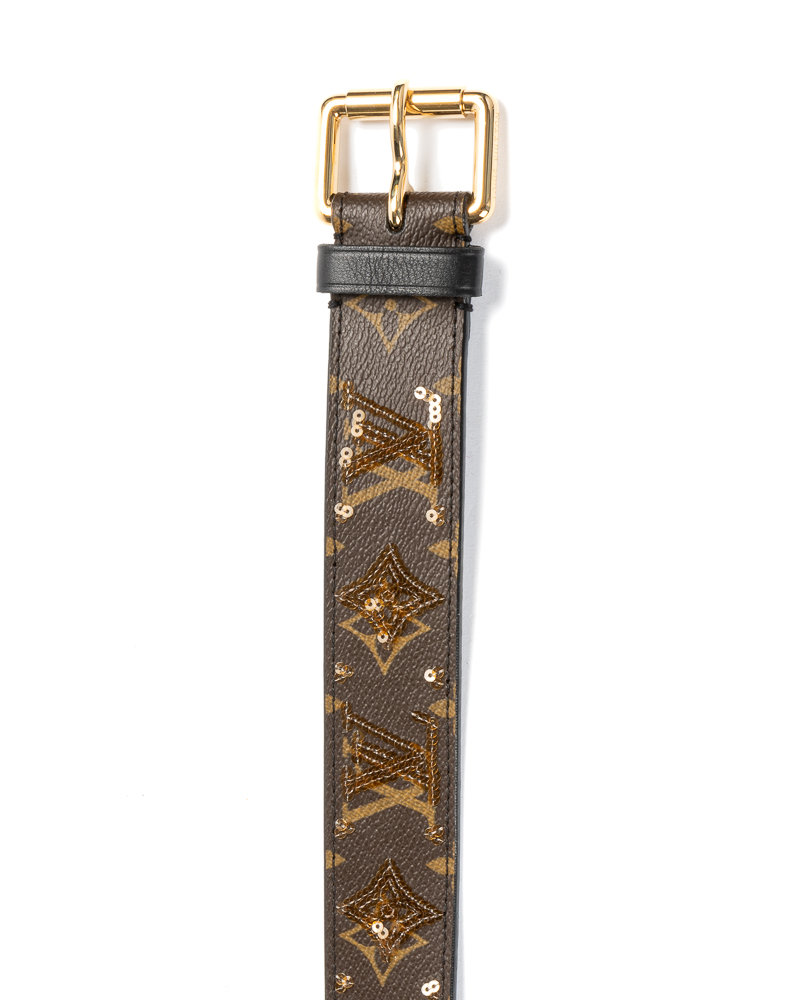 Cintura firmata Louis Vuitton, realizzata in tela marrone nella classica fantasia monogram arricchita da Pailettes e hardware dorato. Misura 90 centimetri di lunghezza e 3,5 centimetri di altezza. L’articolo si presenta in ottime condizioni.