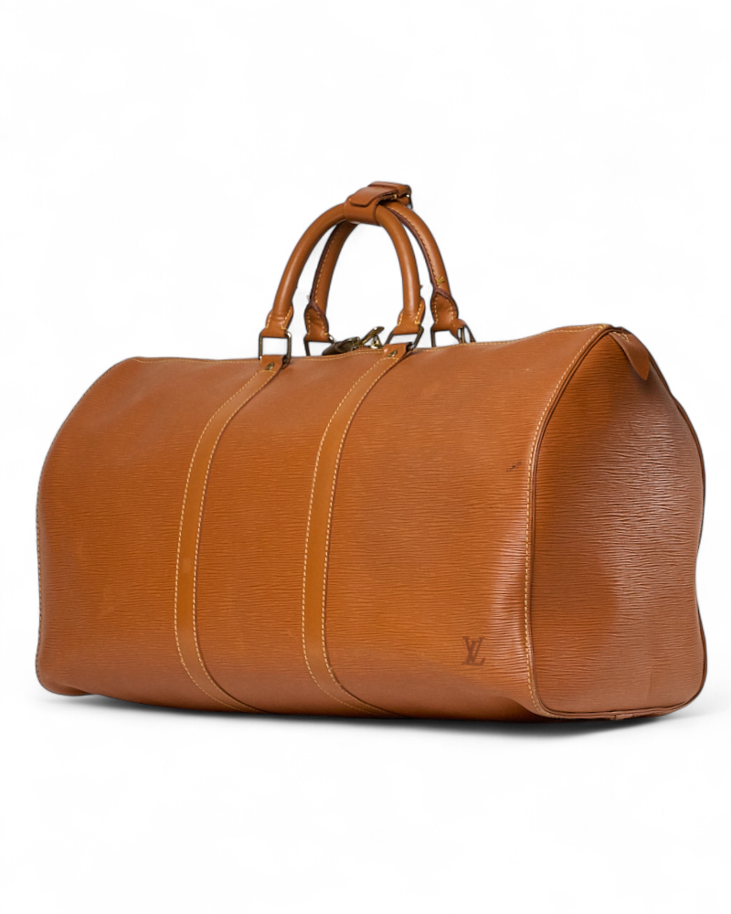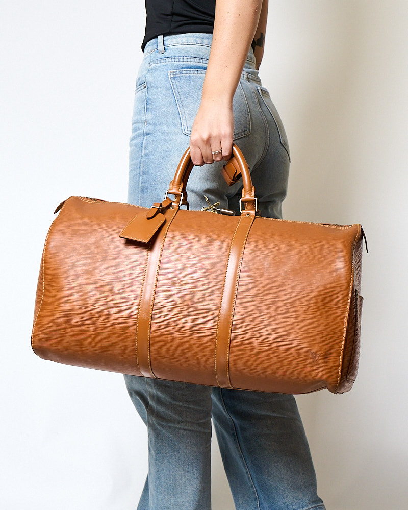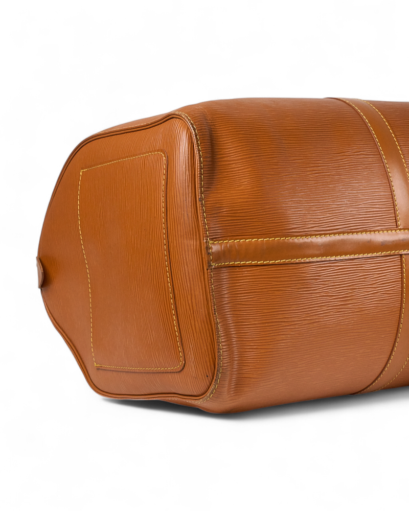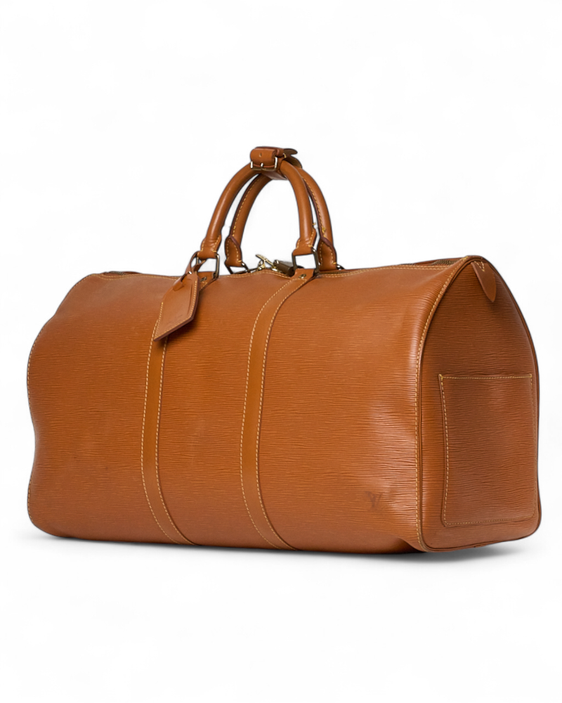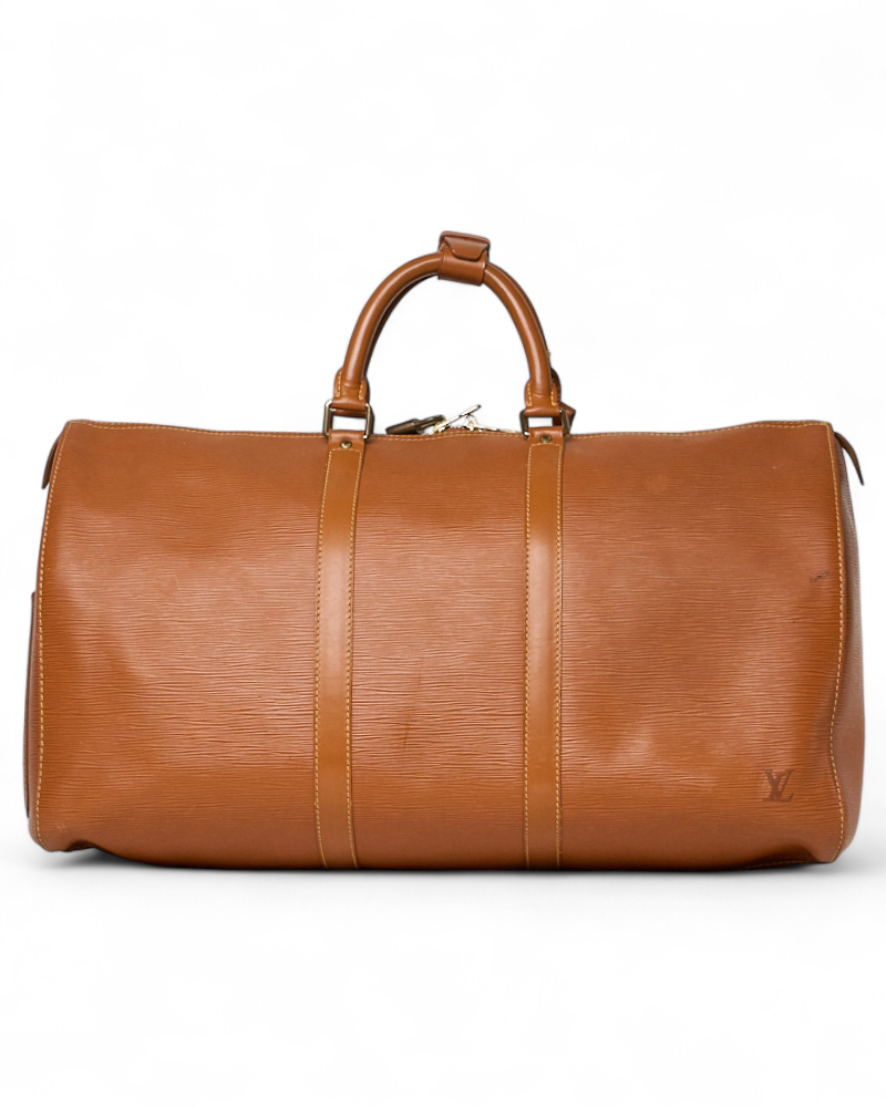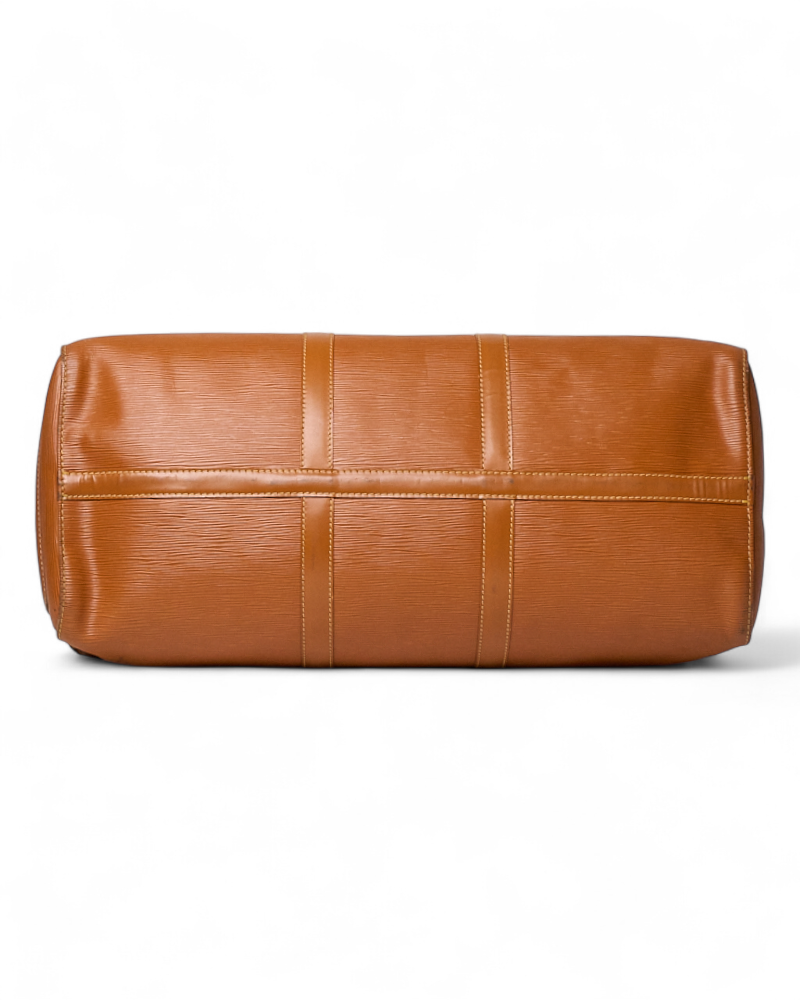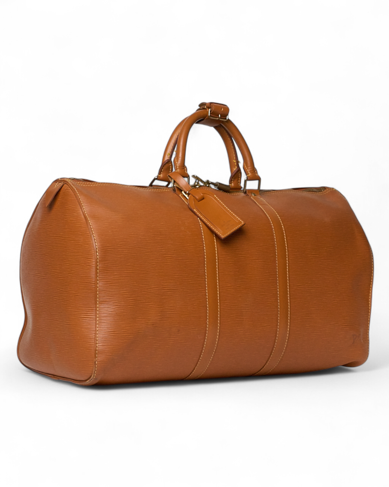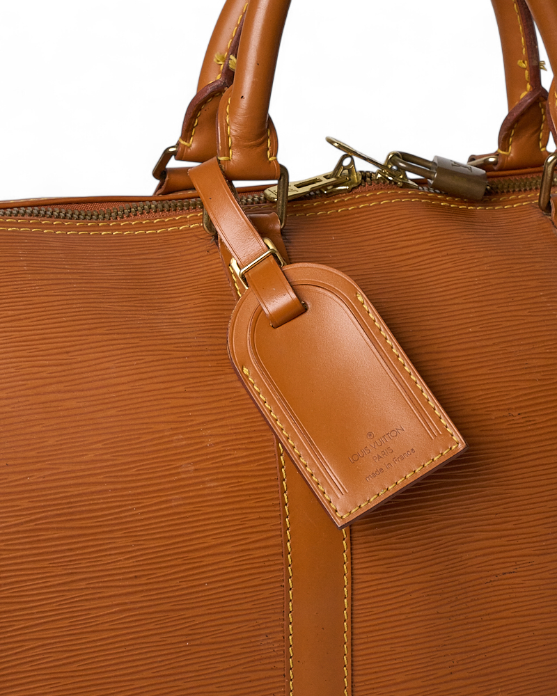Borsone da viaggio firmato Louis Vuitton, modello Keepall nella misura 50, realizzato in pelle epi nella colorazione miele con hardware dorato. Dotato di una chiusura superiore a zip con doppio cursore, internamente rivestito in tela tono su tono, il borsone è abbastanza capiente. Munito di doppio manico in pelle, per una comoda portata a mano. Completo di Porta-Addresse e Lucchetto. L’articolo si presenta in buone condizioni, con segni di usura.