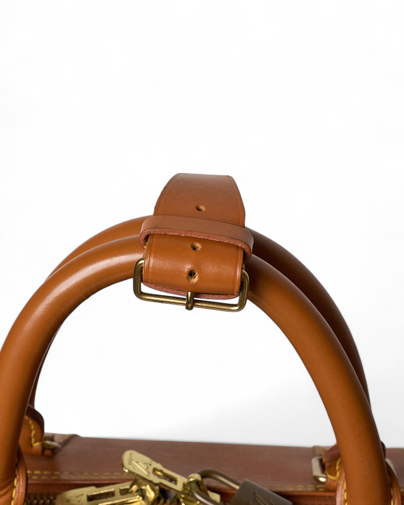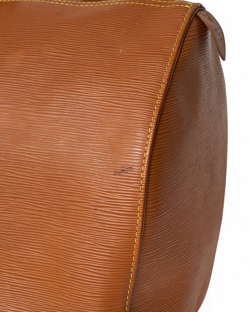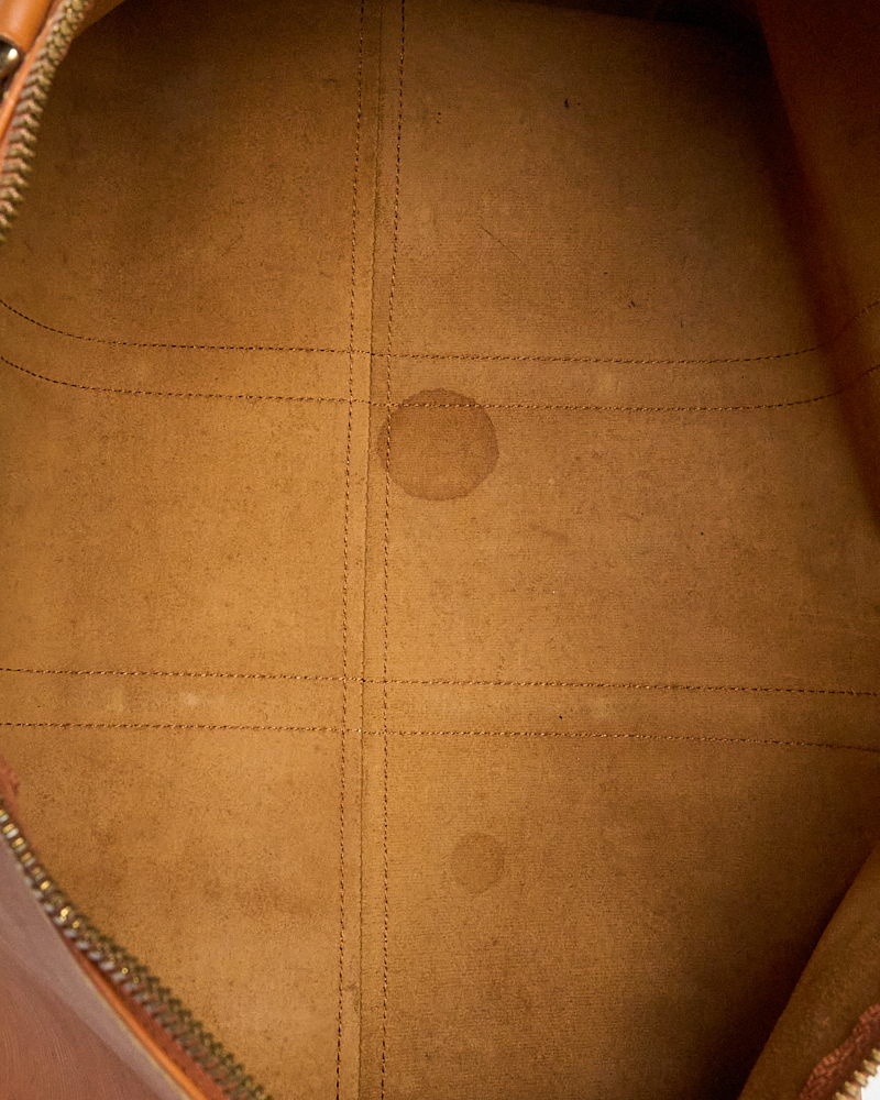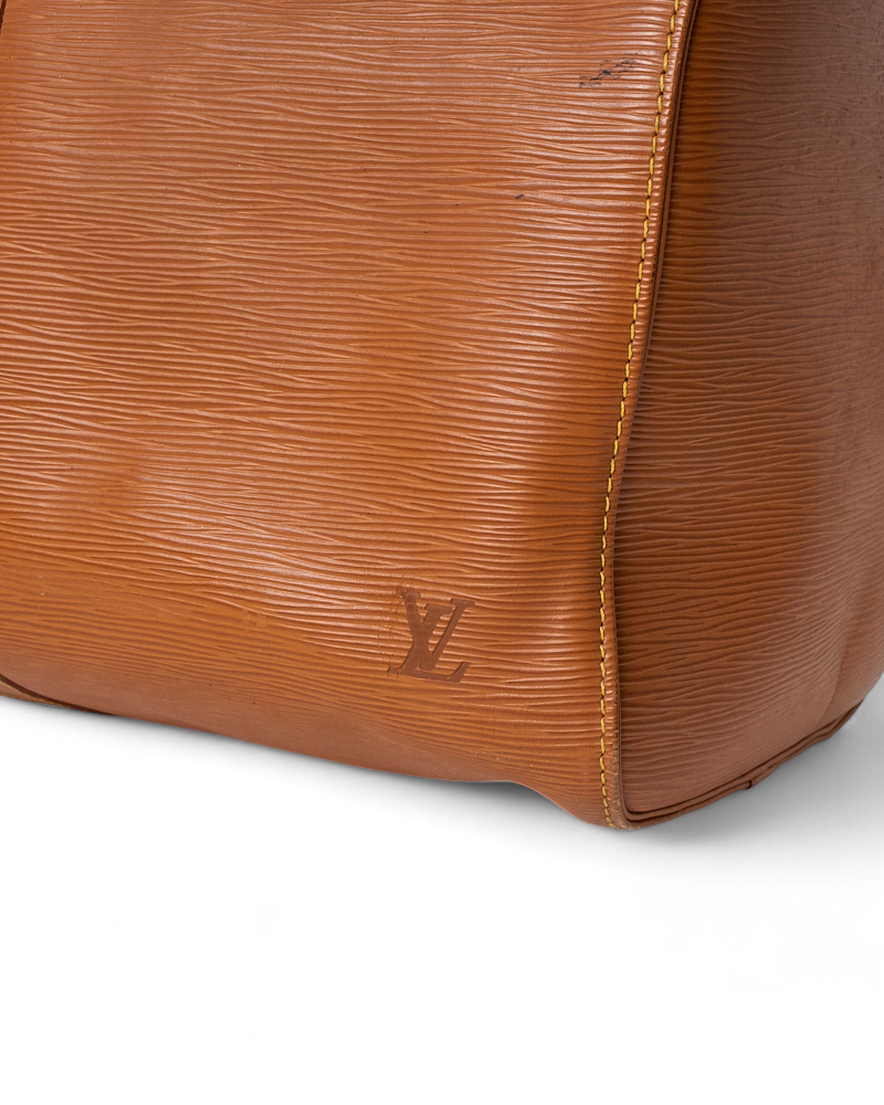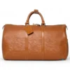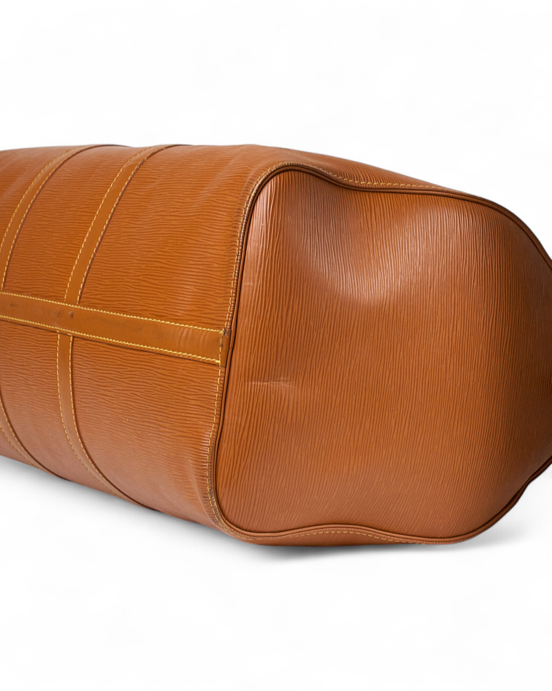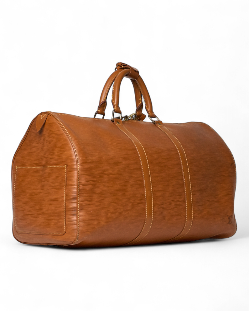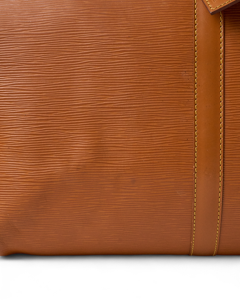 Borsone da viaggio firmato Louis Vuitton, modello Keepall nella misura 50, realizzato in pelle epi nella colorazione miele con hardware dorato. Dotato di una chiusura superiore a zip con doppio cursore, internamente rivestito in tela tono su tono, il borsone è abbastanza capiente. Munito di doppio manico in pelle, per una comoda portata a mano. Completo di Porta-Addresse e Lucchetto. L’articolo si presenta in buone condizioni, con segni di usura.
