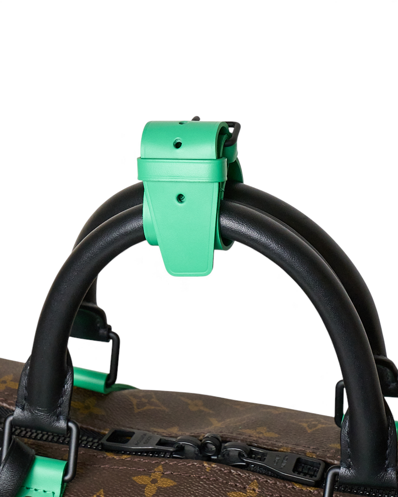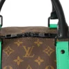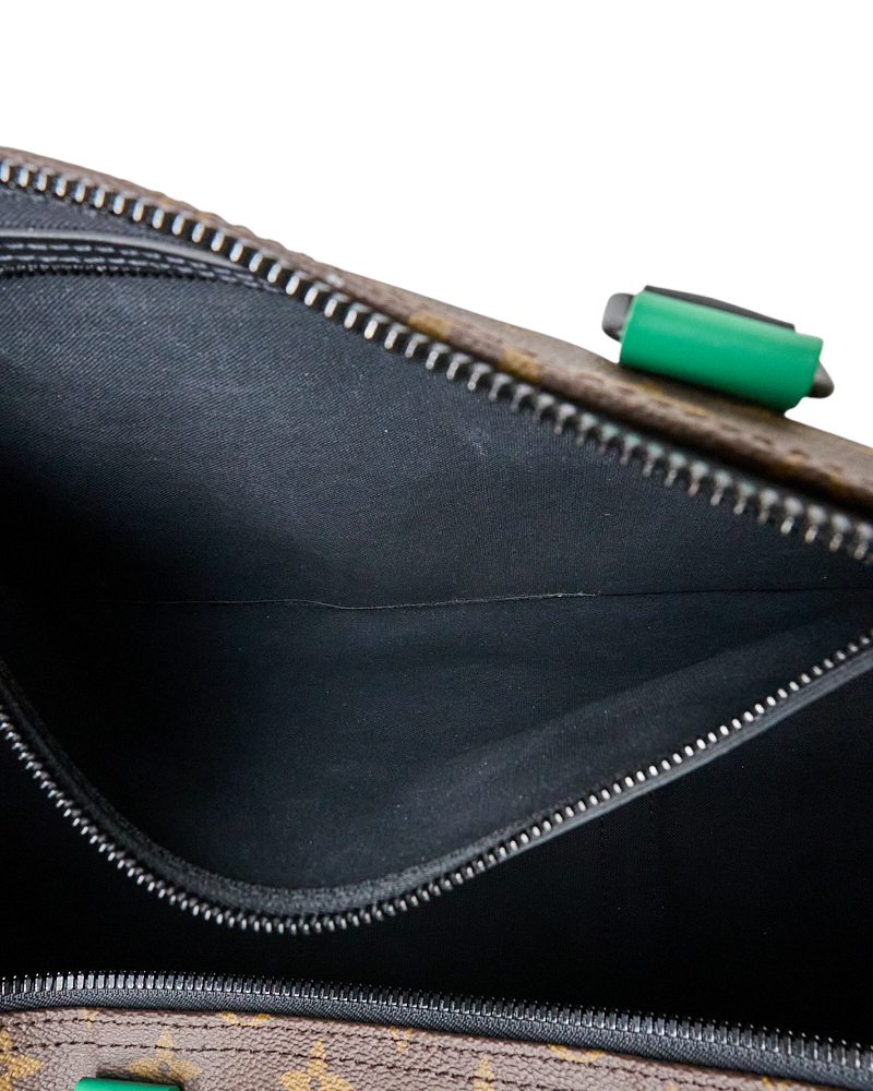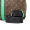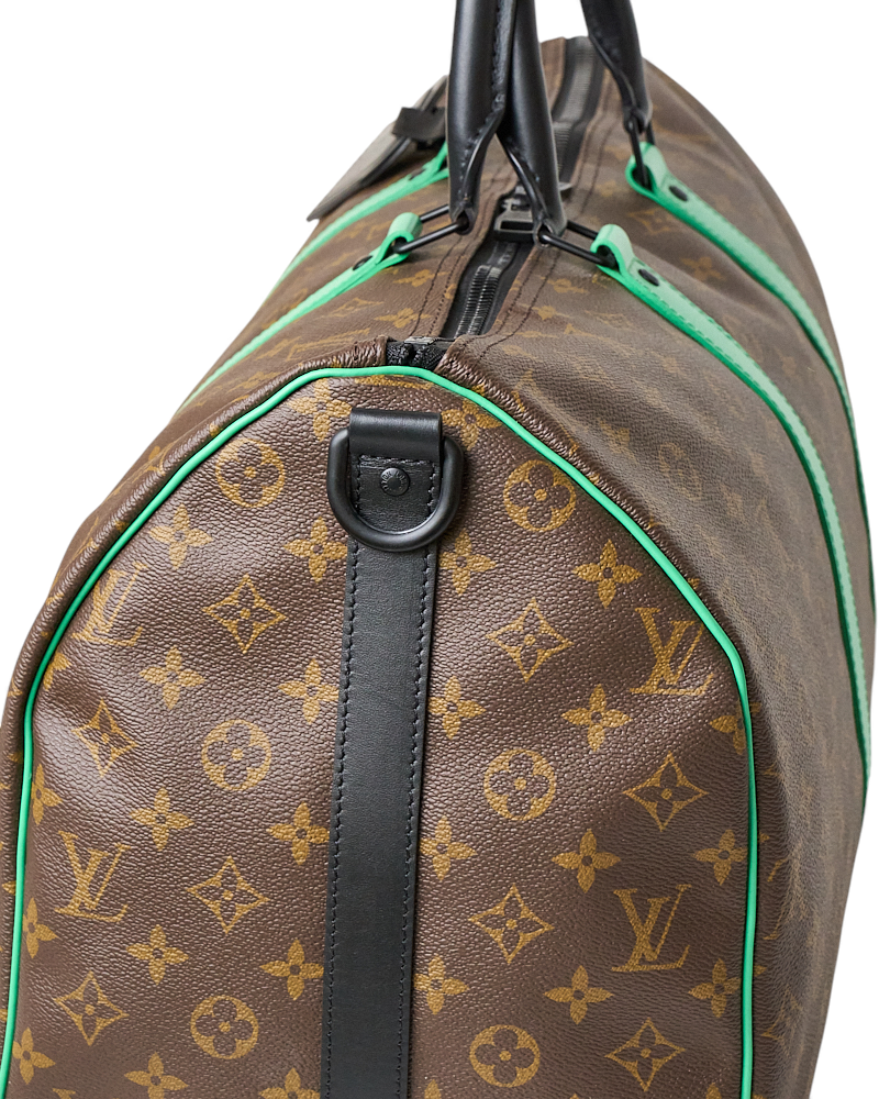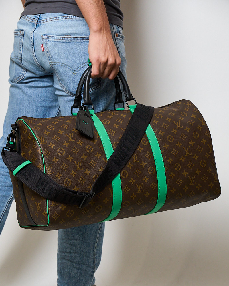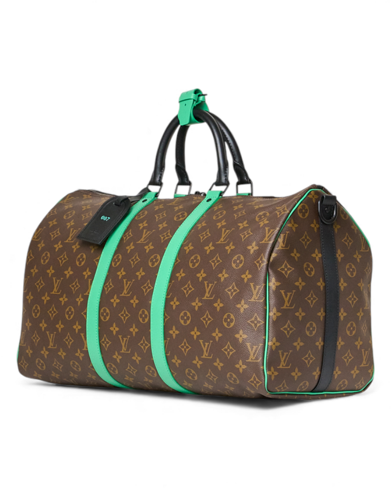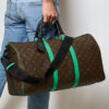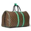 Borsone da Viaggio firmato Louis Vuitton, modello Keepall nella misura 50, realizzato in tela marrone nella classica fantasia monogram con inserti in pelle verde e hardware neri. Dotato di una chiusura a zip con doppio cursore, internamente rivestito in tela nera con comoda tasca, il borsone è molto capiente. Munito di doppio manico in pelle e di una tracolla rimovibile e regolabile in tessuto, per una comoda portata a spalla o a mano. Completo di Porta-Addresse con personalizzazione “007”, chiavi e lucchetto. L’articolo si presenta in ottime condizioni.