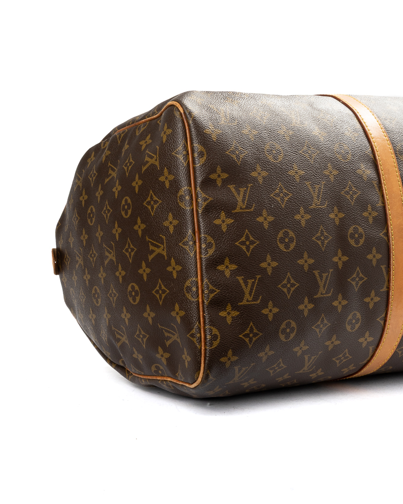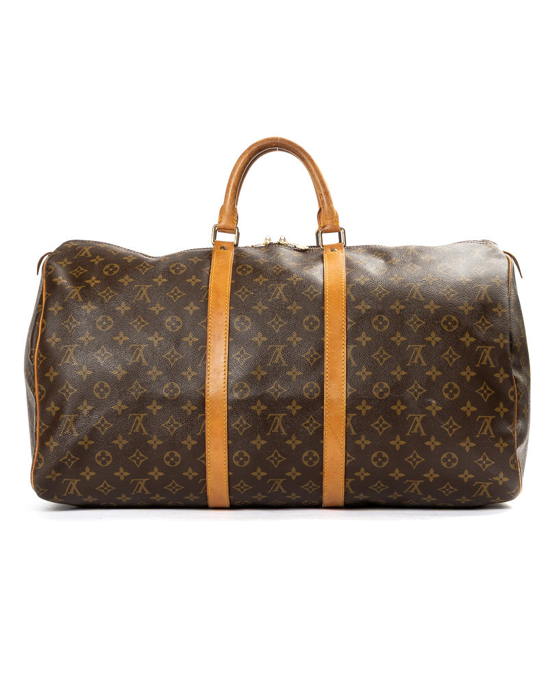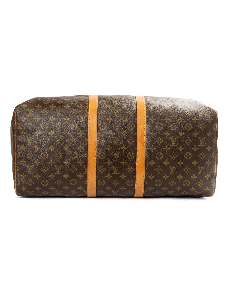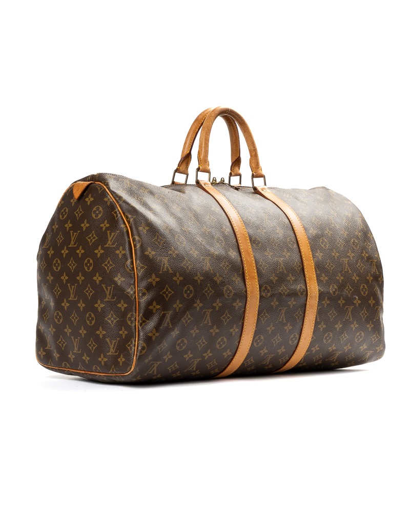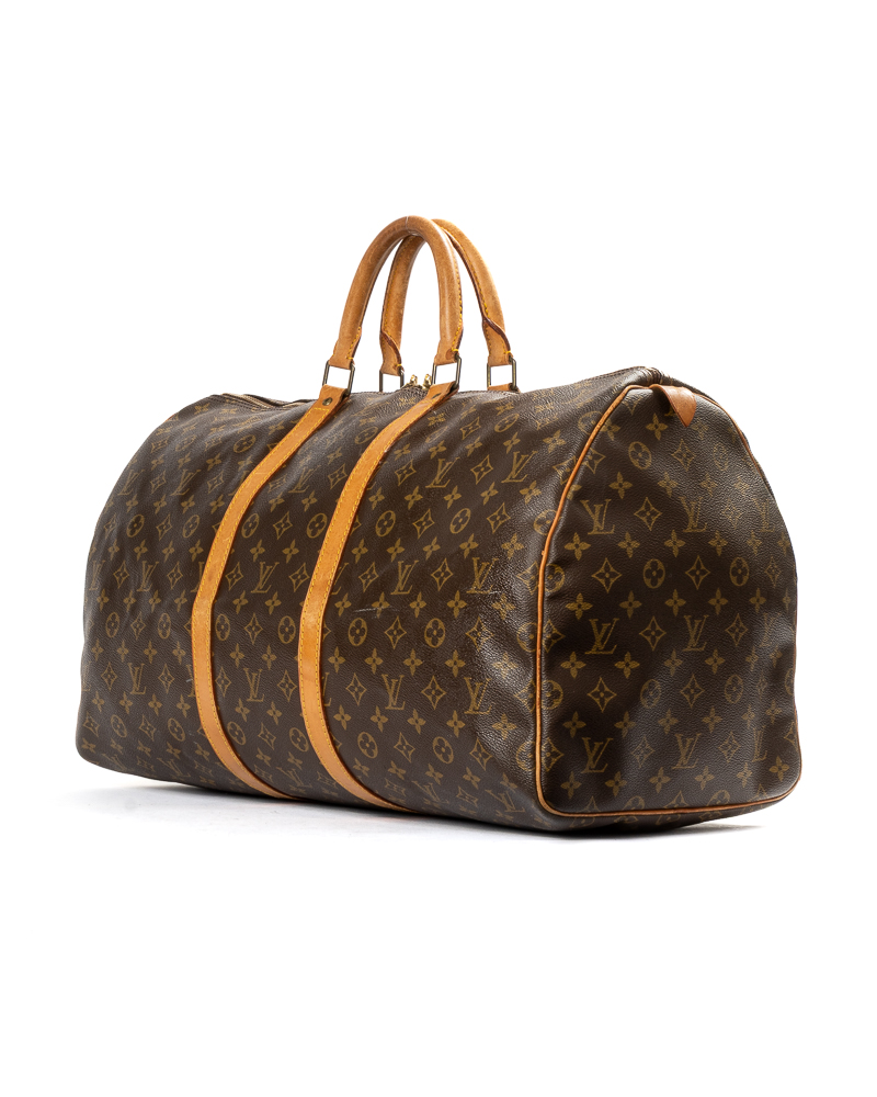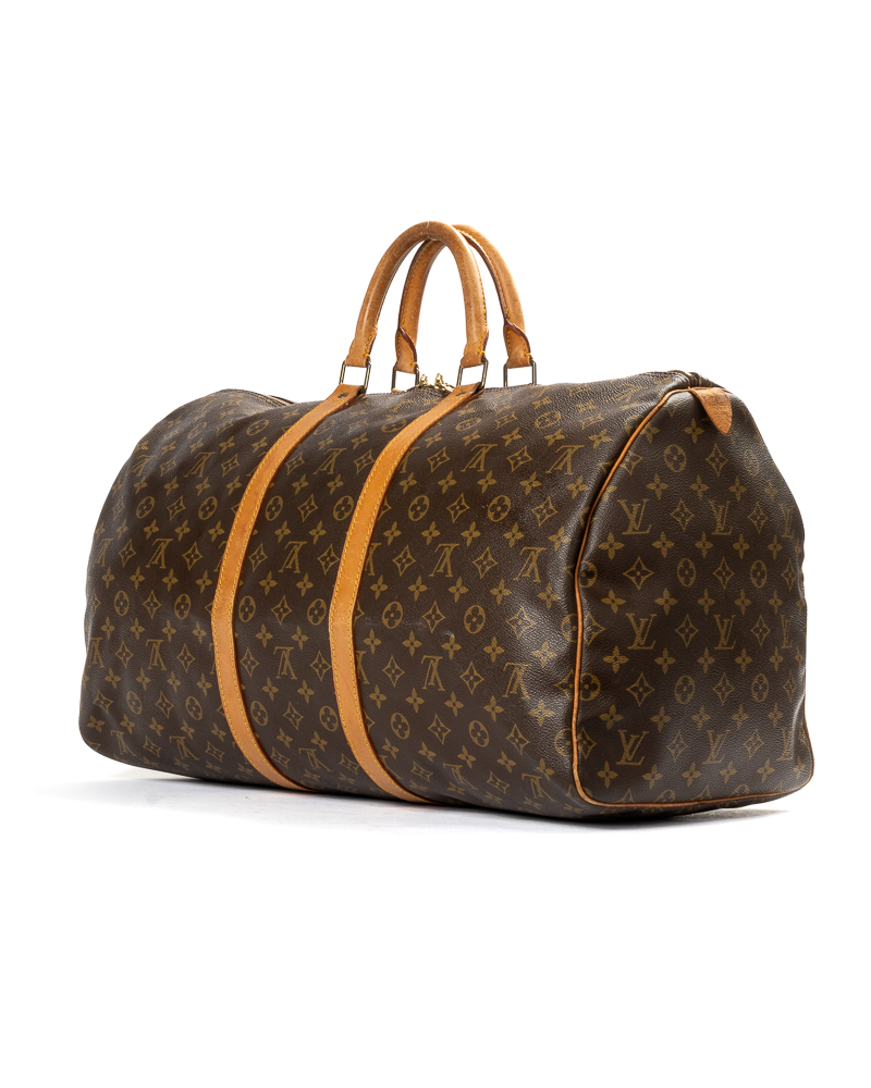 Borsone da Viaggio firmato Louis Vuitton, modello Keepall nella misura 55, realizzato in tela marrone nella classica fantasia monogram con inserti in vacchetta e hardware dorato. Dotato di una chiusura superiore a zip con doppio cursore, internamente rivestito in tela marrone, il borsone è molto capiente. Munito di doppio manico in vacchetta, per una comoda portata a mano. L’articolo si presenta in buone condizioni, con segni di usura visibili in foto.