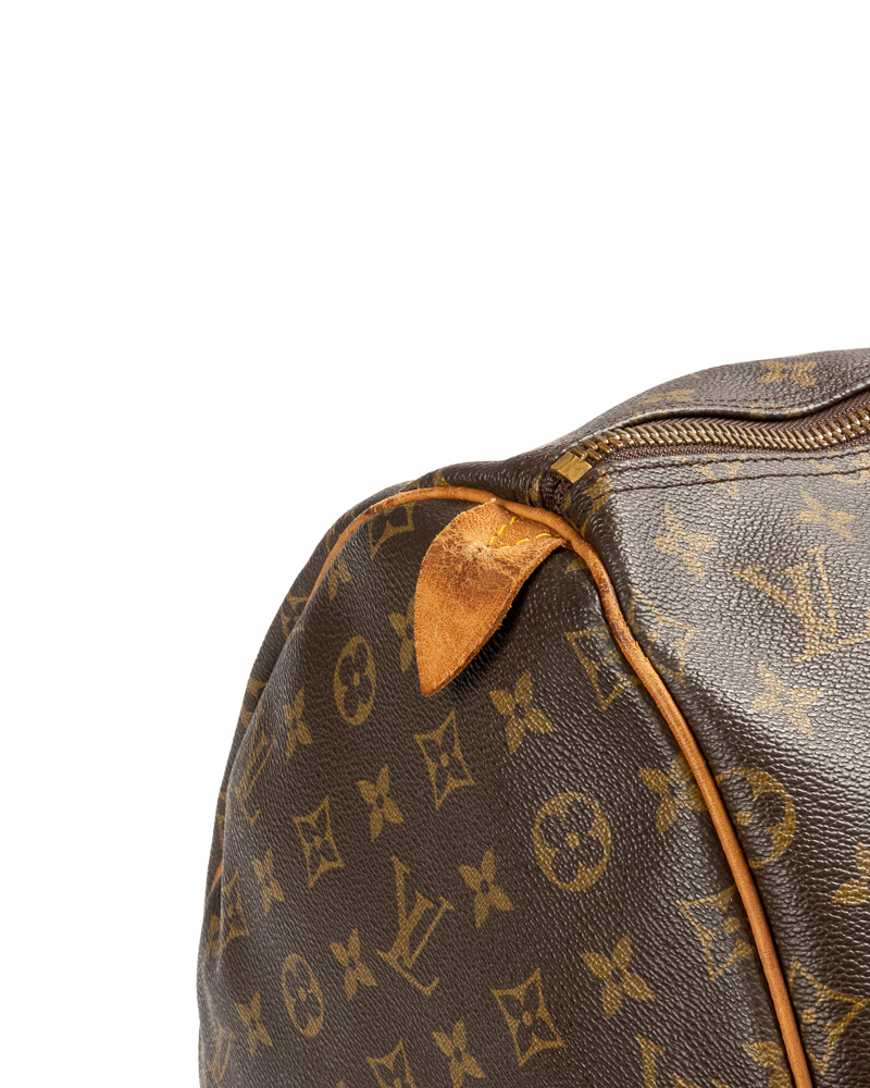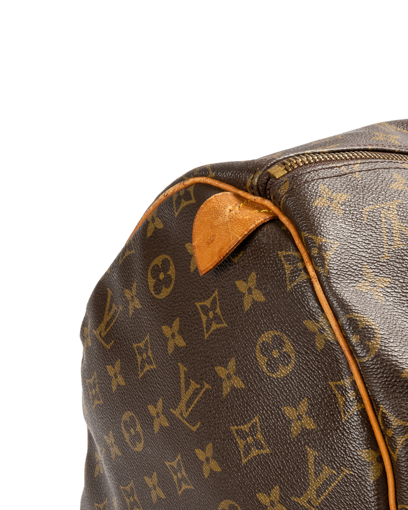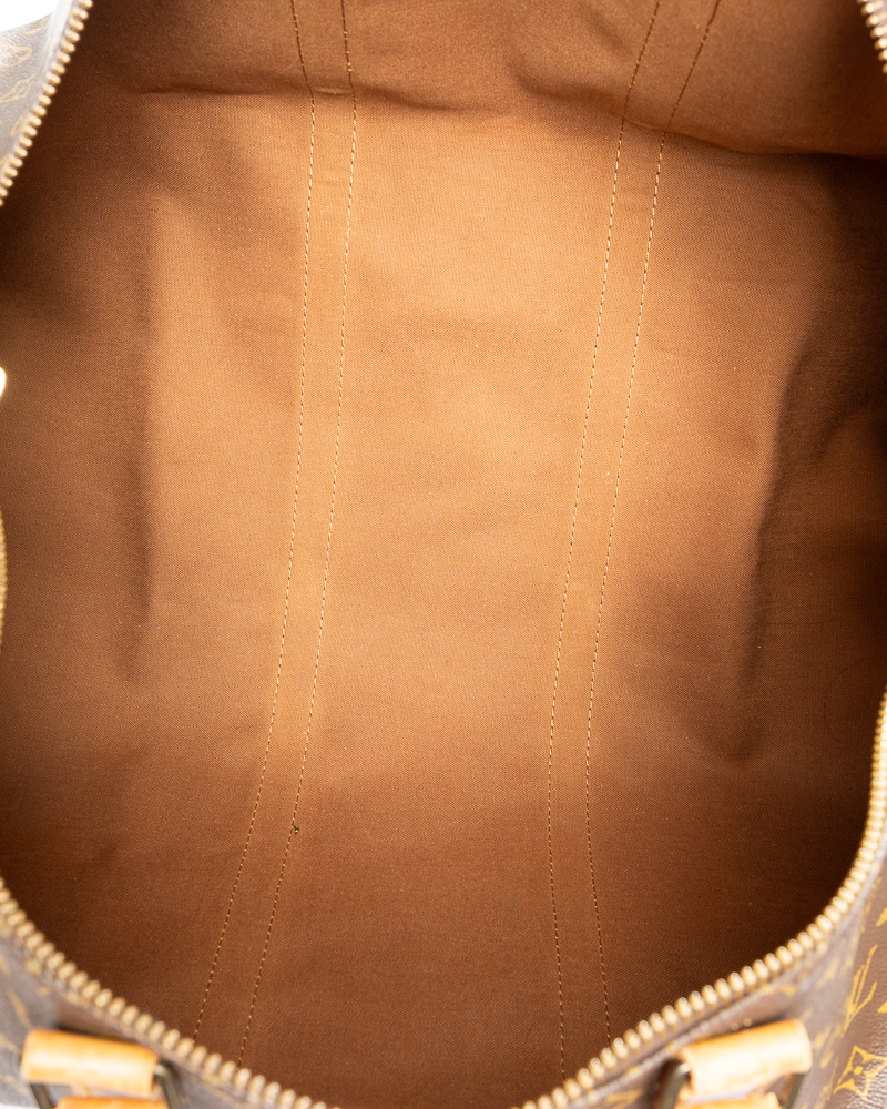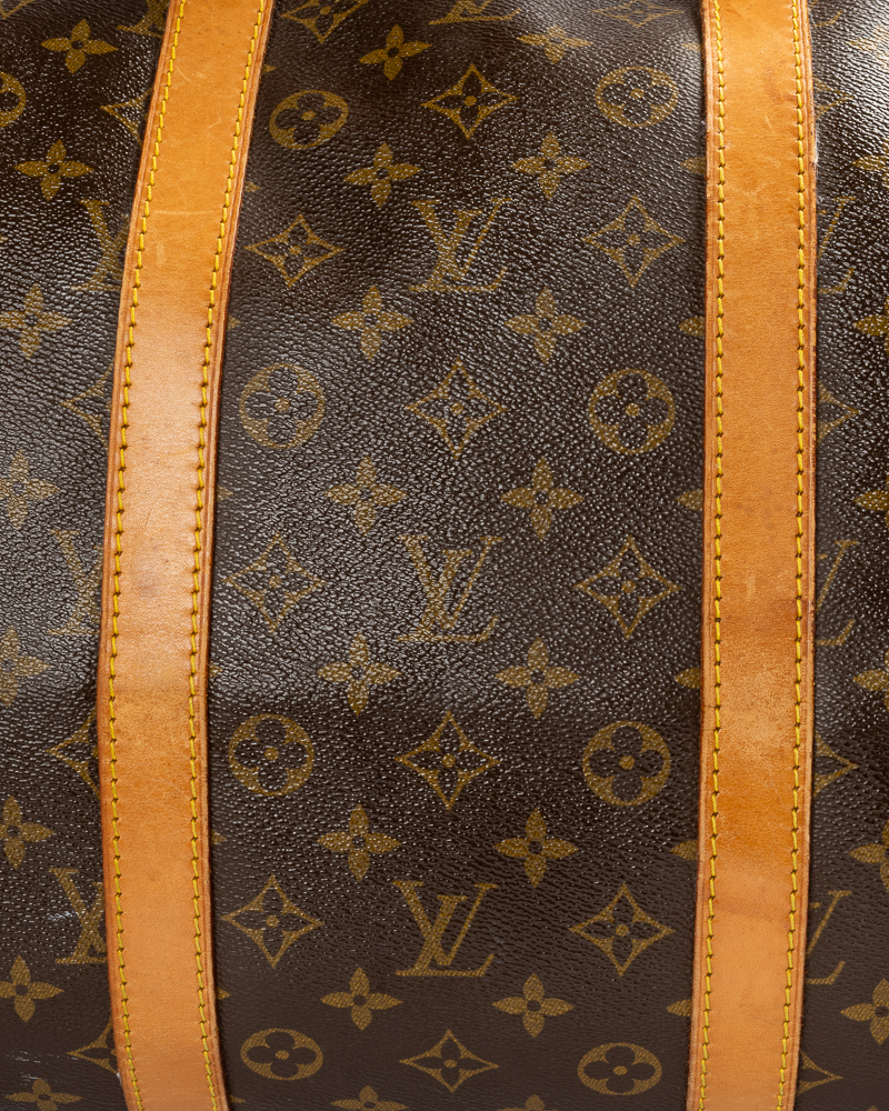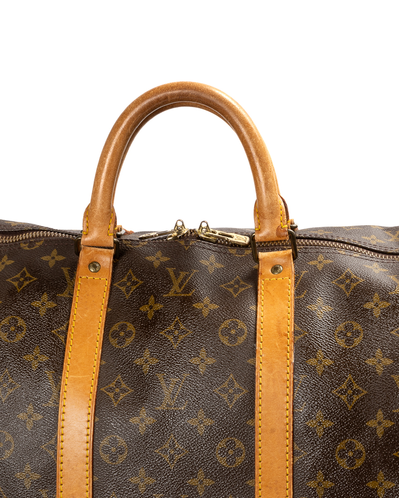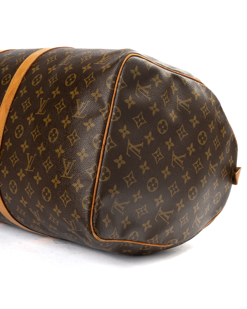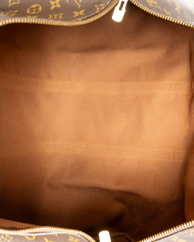Borsone da Viaggio firmato Louis Vuitton, modello Keepall nella misura 55, realizzato in tela marrone nella classica fantasia monogram con inserti in vacchetta e hardware dorato. Dotato di una chiusura superiore a zip con doppio cursore, internamente rivestito in tela marrone, il borsone è molto capiente. Munito di doppio manico in vacchetta, per una comoda portata a mano. L’articolo si presenta in buone condizioni, con segni di usura visibili in foto.
