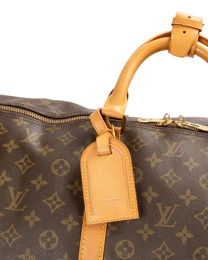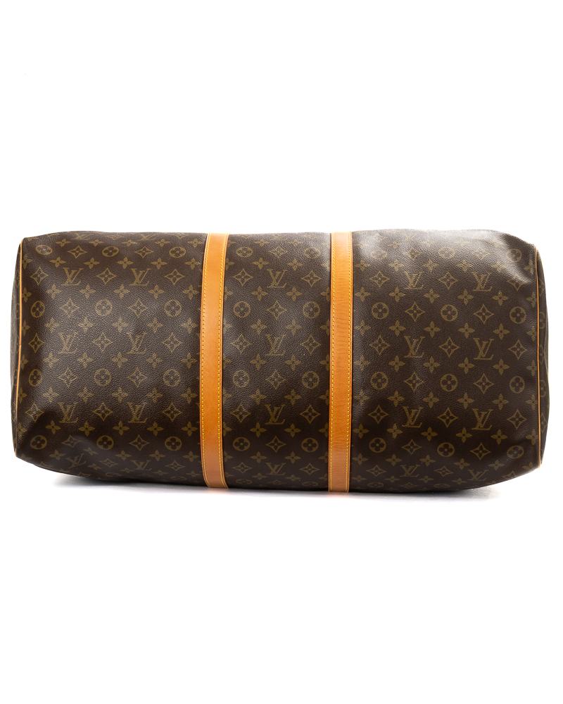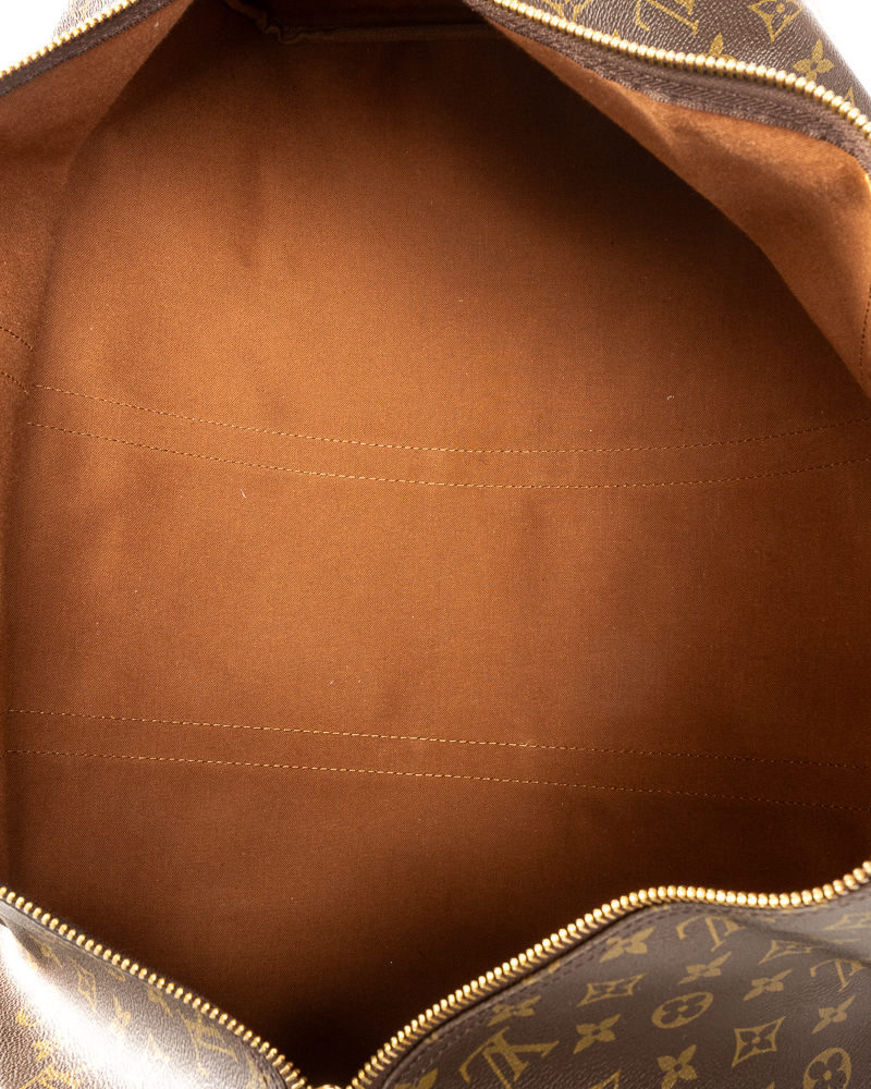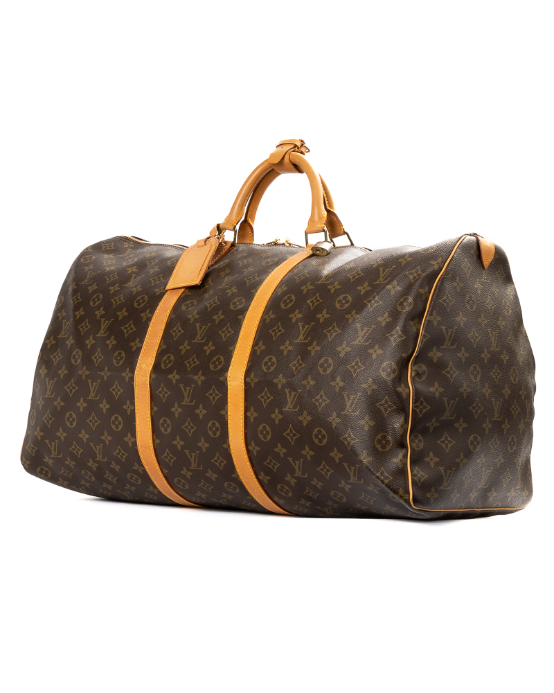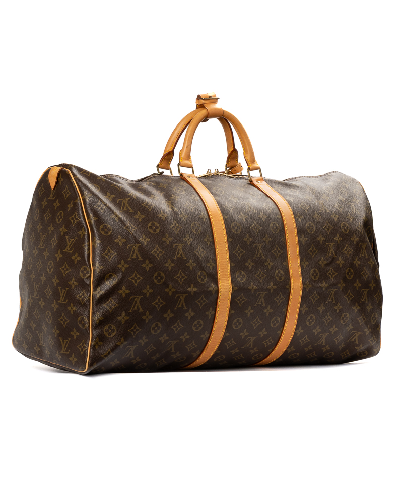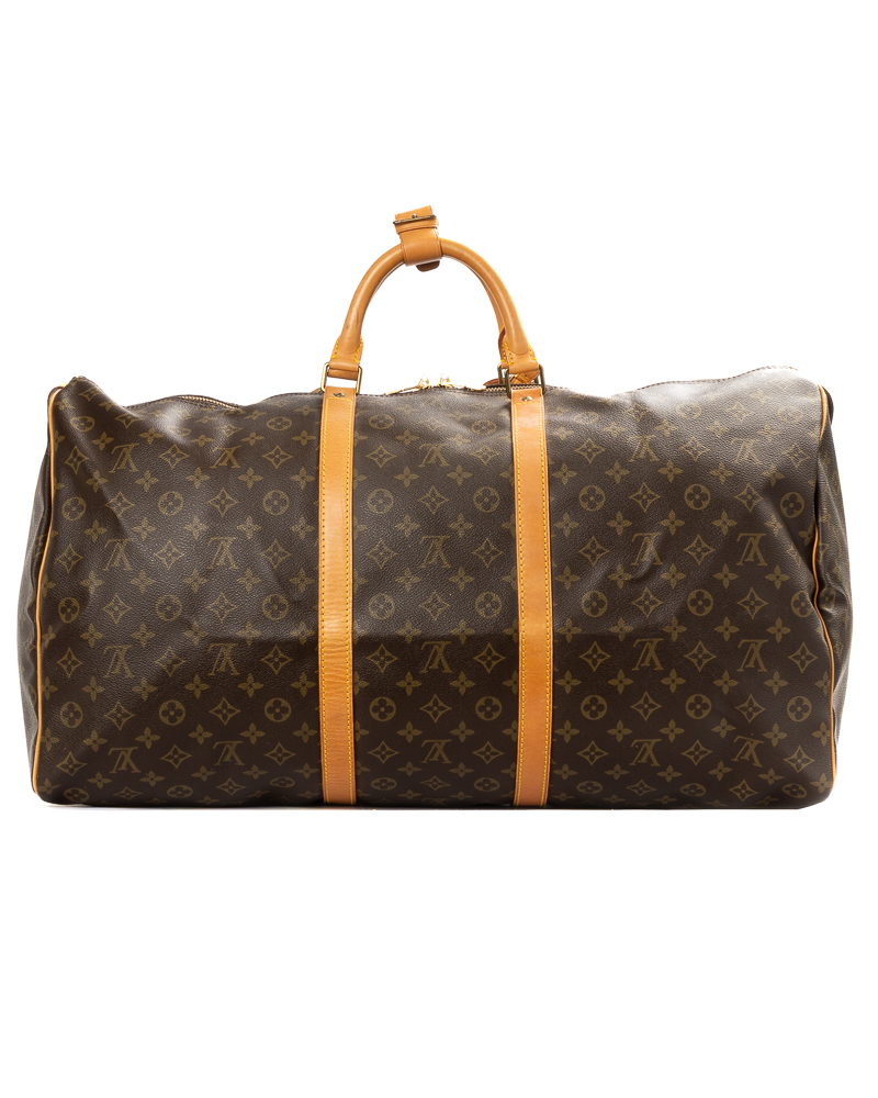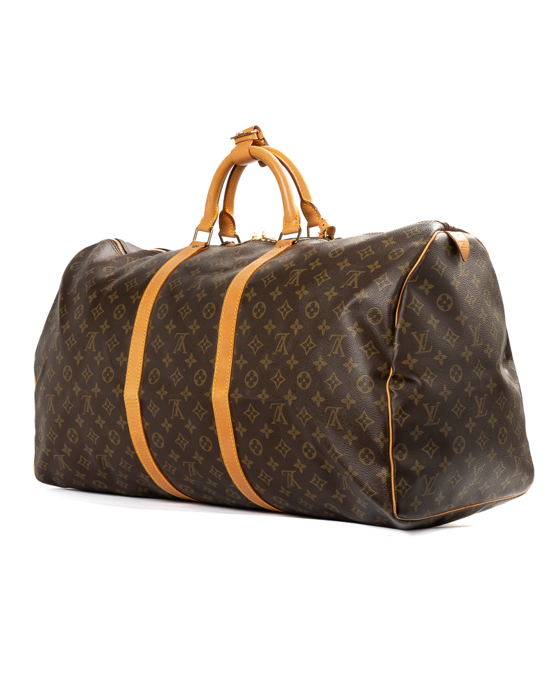 Borsone da viaggio firmato Louis Vuitton, modello Keepall nella misura 60, realizzato in tela marrone nella classica fantasia monogram con inserti in vacchetta e hardware dorato. Dotata di una chiusura superiore a zip con doppio cursore, internamente rivestita in tela marrone, il borsone è molto capiente. Munito di doppio manico in pelle, per una comoda portata a mano. Completo di lucchetto, senza chiavi.  L'articolo si presenta in ottime condizioni.
