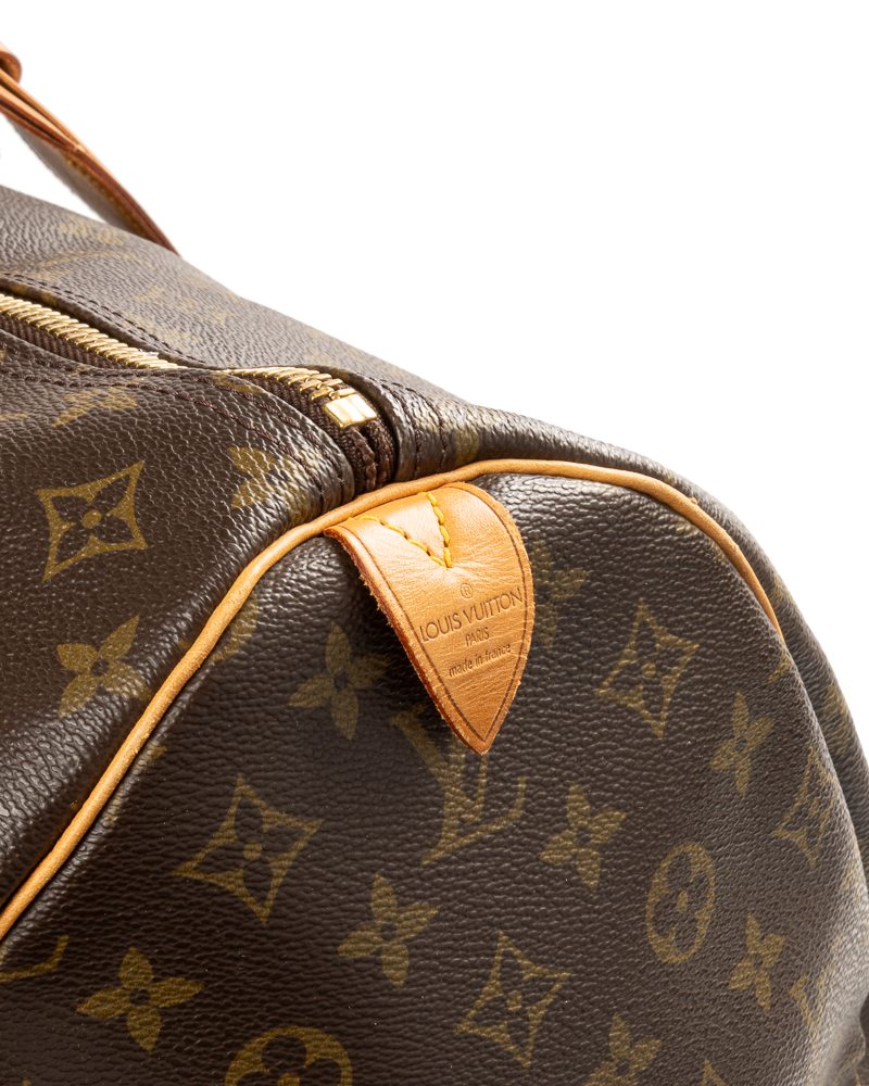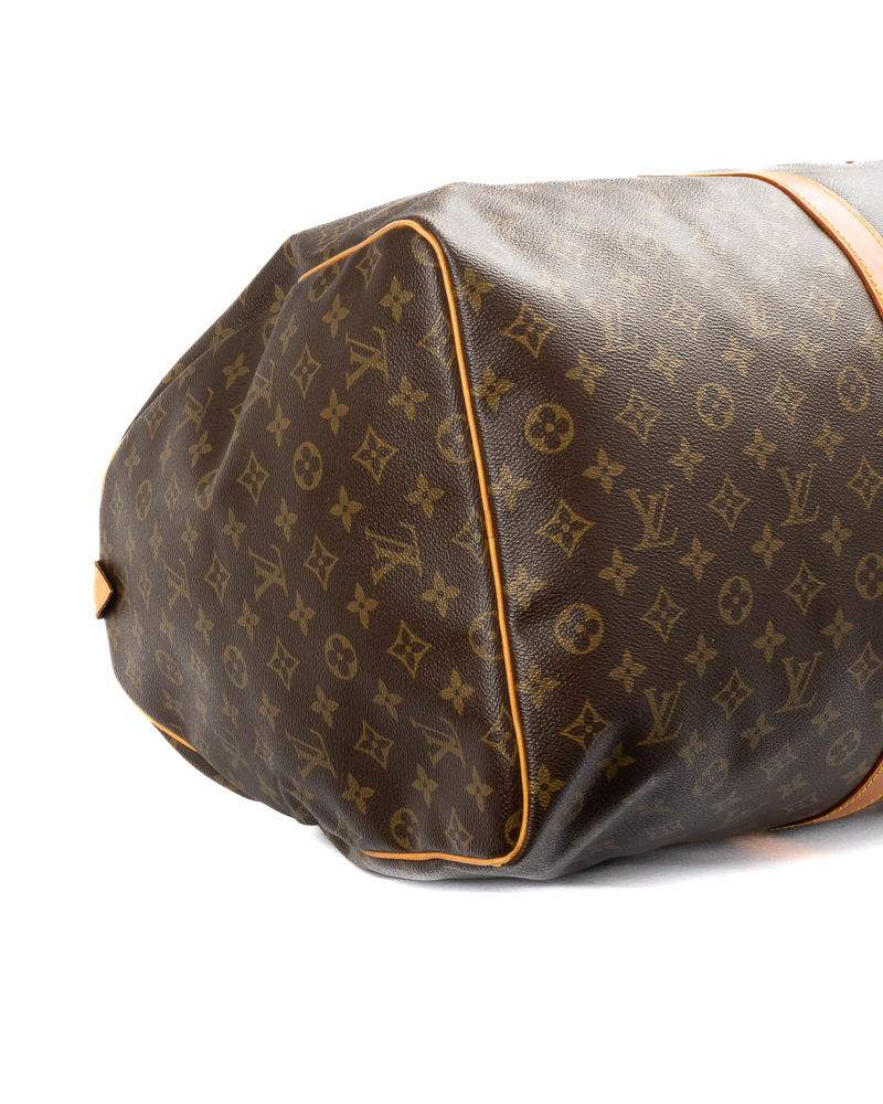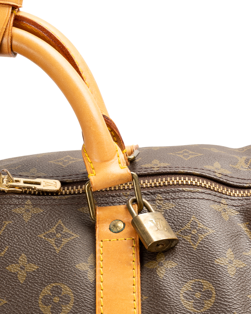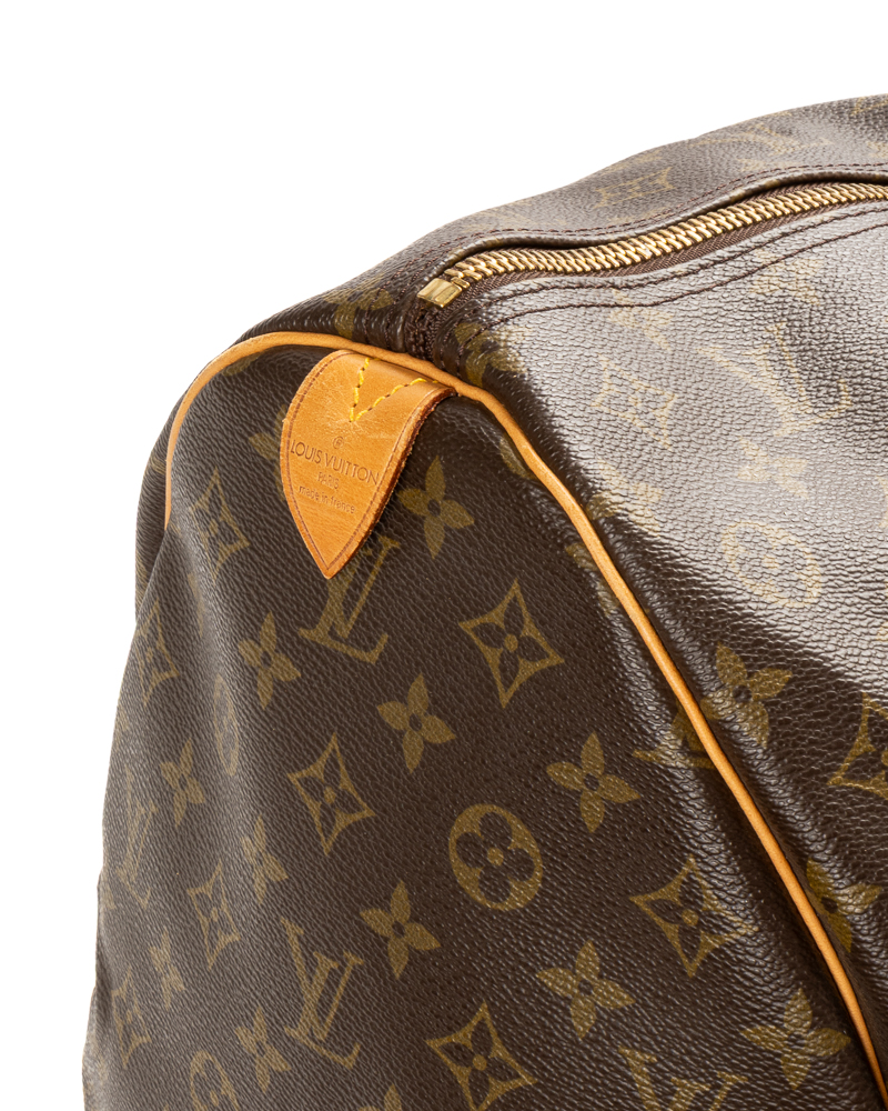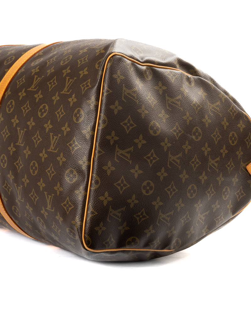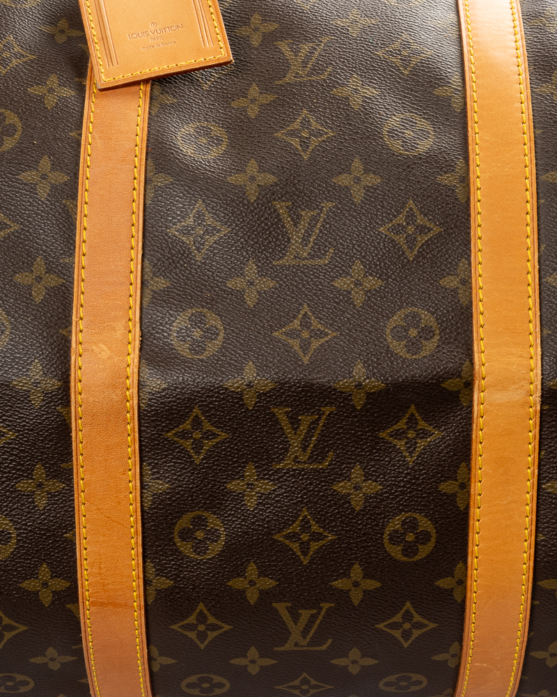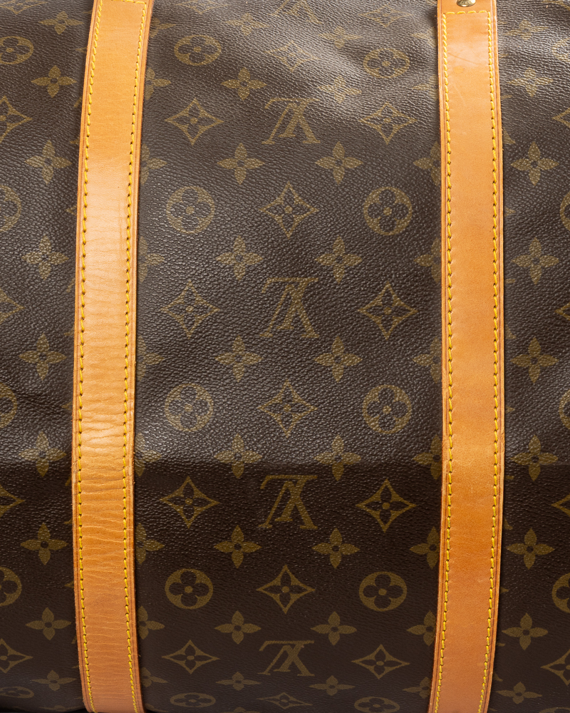 Borsone da viaggio firmato Louis Vuitton, modello Keepall nella misura 60, realizzato in tela marrone nella classica fantasia monogram con inserti in vacchetta e hardware dorato. Dotata di una chiusura superiore a zip con doppio cursore, internamente rivestita in tela marrone, il borsone è molto capiente. Munito di doppio manico in pelle, per una comoda portata a mano. Completo di lucchetto, senza chiavi.  L'articolo si presenta in ottime condizioni.