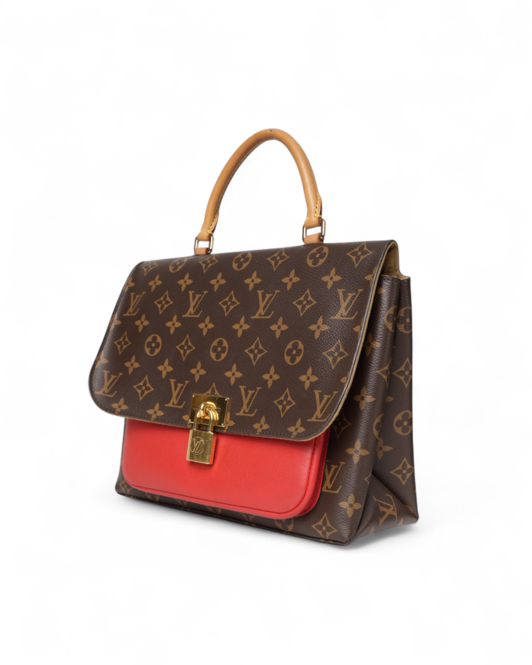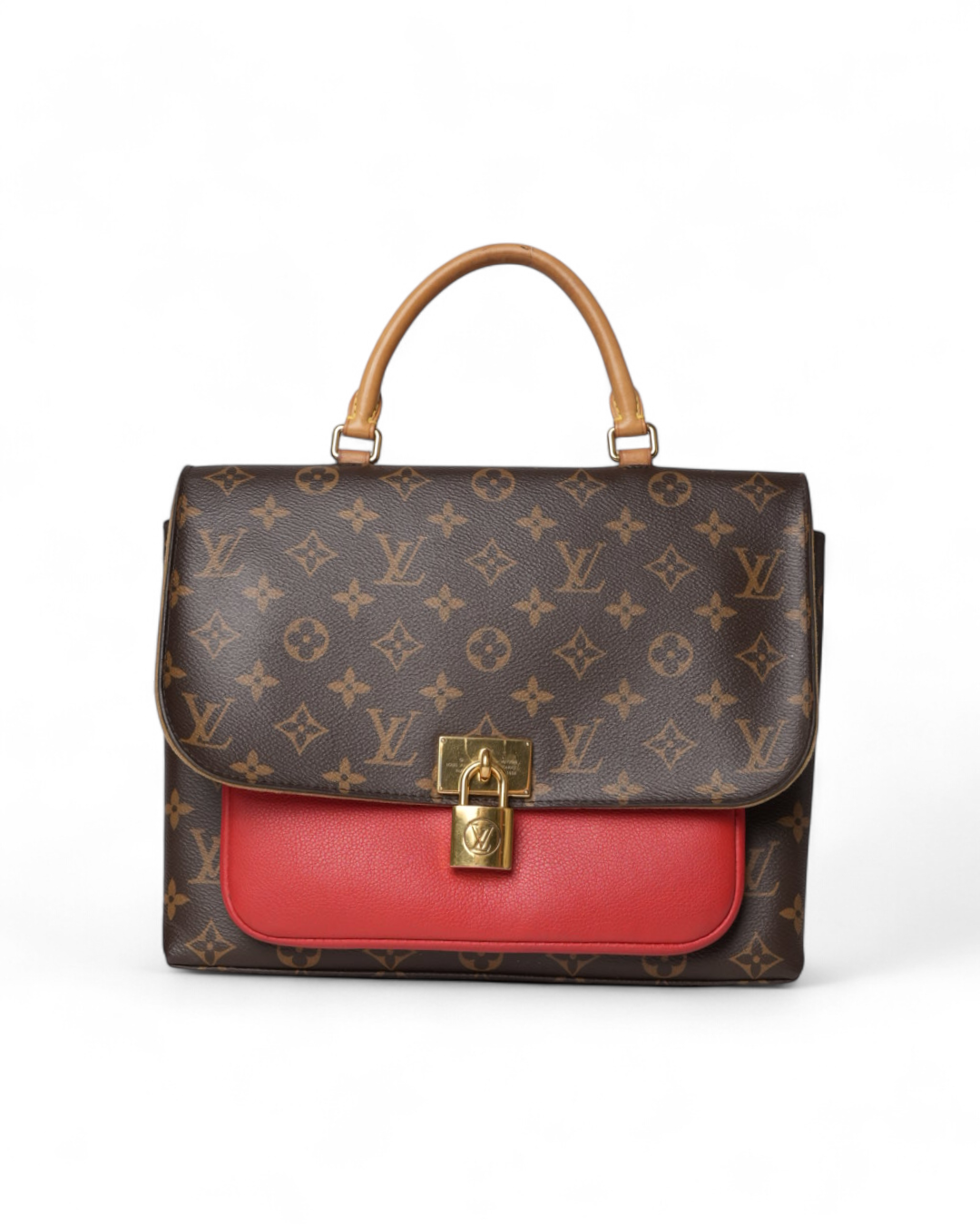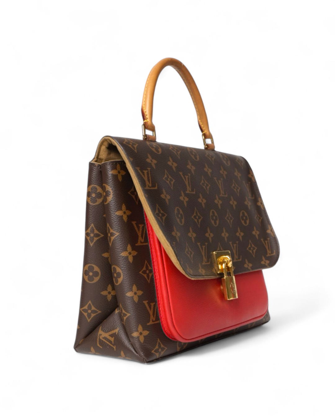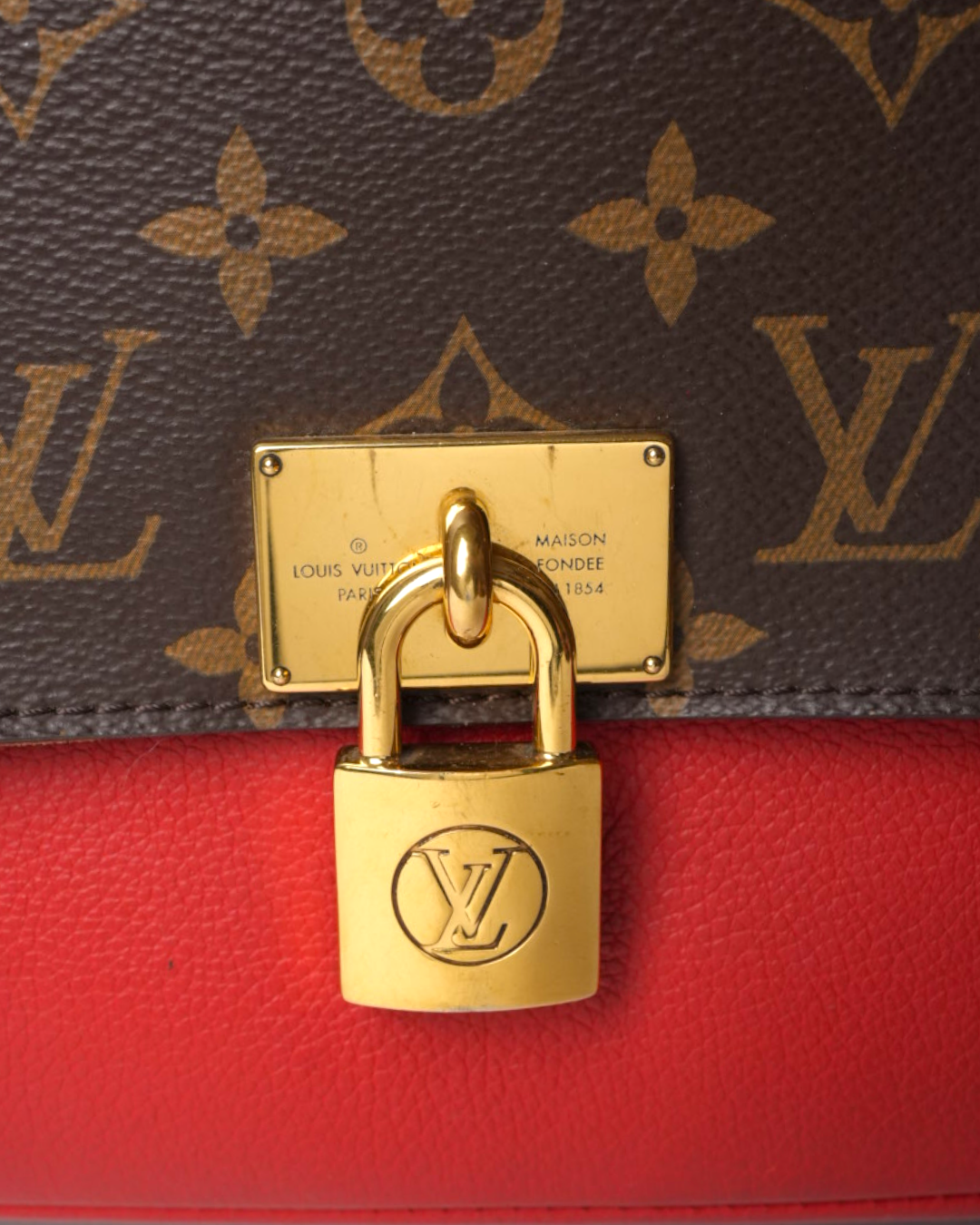 Borsa firmata Louis Vuitton, modello Marignan nella misura MM, realizzata in tela marrone nella classica fantasia monogram con inserti in pelle rossa e hardware dorato. Dotata di una patta con iconico lucchetto “LV” e chiusura calamitata, internamente rivestita in tessuto scamosciato beige con comode tasche, la borsa è abbastanza capiente. Munita di un manico in vacchetta e di una tracolla rimovibile e regolabile, per una comoda portata a mano o a spalla. L’articolo si presenta in buone condizioni.