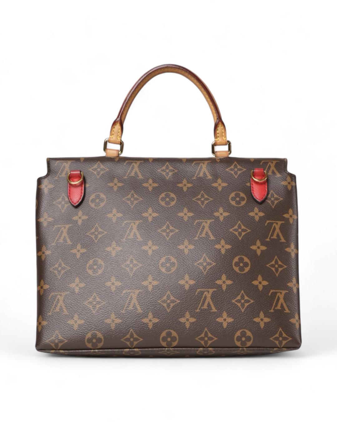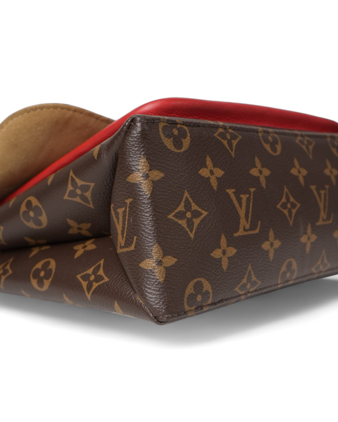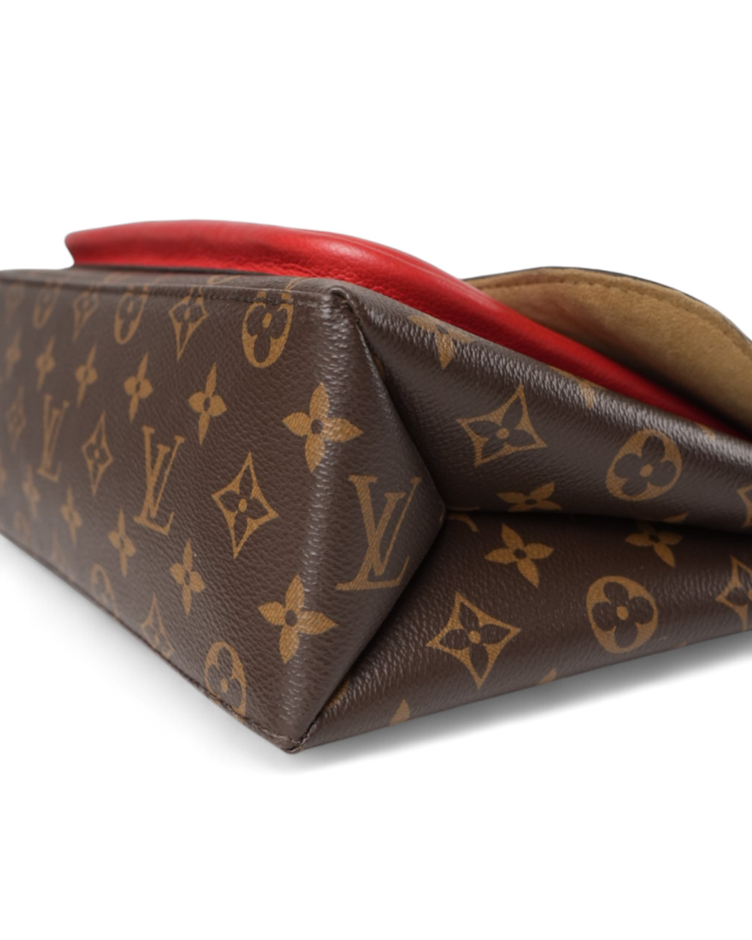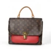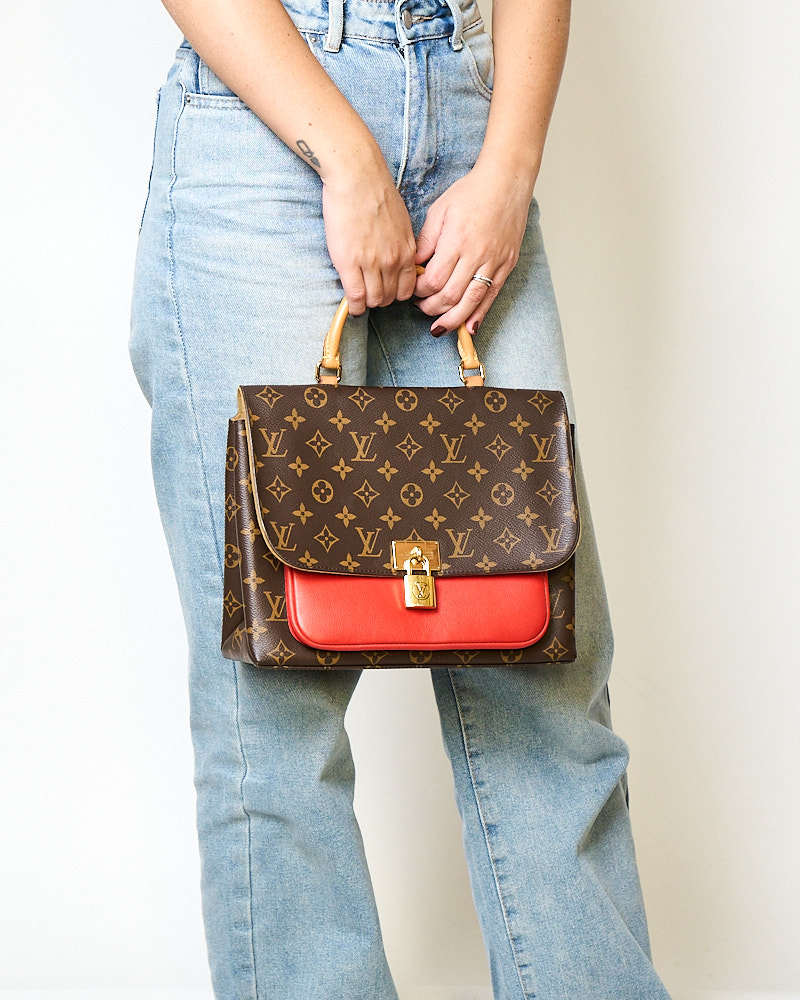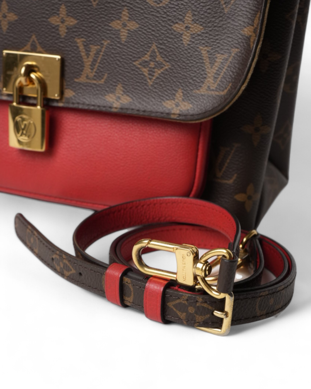 Borsa firmata Louis Vuitton, modello Marignan nella misura MM, realizzata in tela marrone nella classica fantasia monogram con inserti in pelle rossa e hardware dorato. Dotata di una patta con iconico lucchetto “LV” e chiusura calamitata, internamente rivestita in tessuto scamosciato beige con comode tasche, la borsa è abbastanza capiente. Munita di un manico in vacchetta e di una tracolla rimovibile e regolabile, per una comoda portata a mano o a spalla. L’articolo si presenta in buone condizioni.