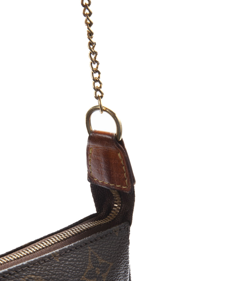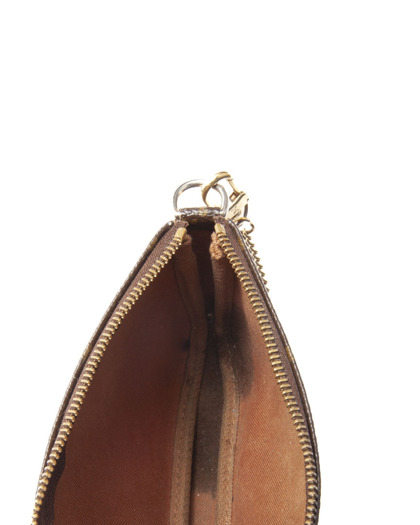 Pochette firmata Louis Vuitton, misura Mini, realizzata in tela marrone nella classica fantasia monogram con inserti in vacchetta e hardware dorato. Dotata di una chiusura superiore a zip, internamente rivestita in tela marrone, la borsa è capiente per l’essenziale. Munita di un manico in catena, per una comoda portata a mano o da inserire in qualche borsa. L’articolo si presenta in buone condizioni, con segni di usura visibili in foto.