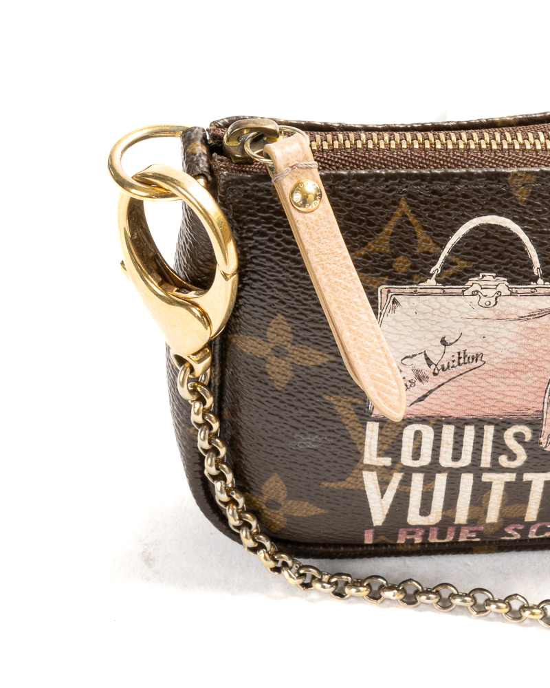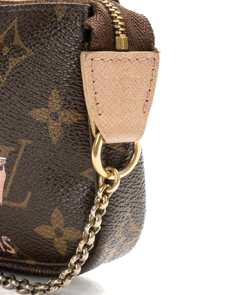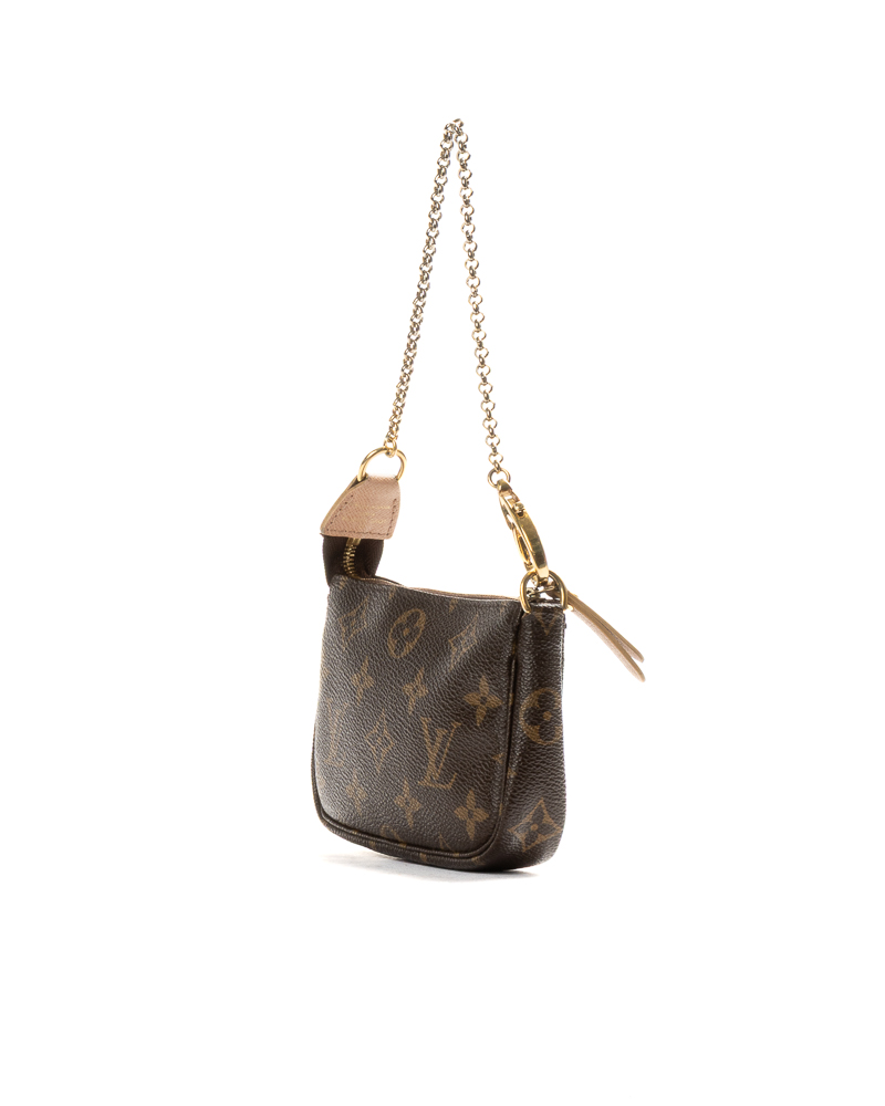 Borsa firmata Louis Vuitton, modello Mini Accessoires, realizzata in tela marrone nella classica fantasia monogram arricchita da patch e hardware dorato. Dotata di una chiusura superiore a zip, internamente rivestita in tela nera, la pochette è capiente per l'essenziale. Munita di un manico in catena, per una comoda portata a mano o da inserire in qualche borsa. L'articolo si presenta in ottime condizioni, con segni di usura sulle parti metalliche.