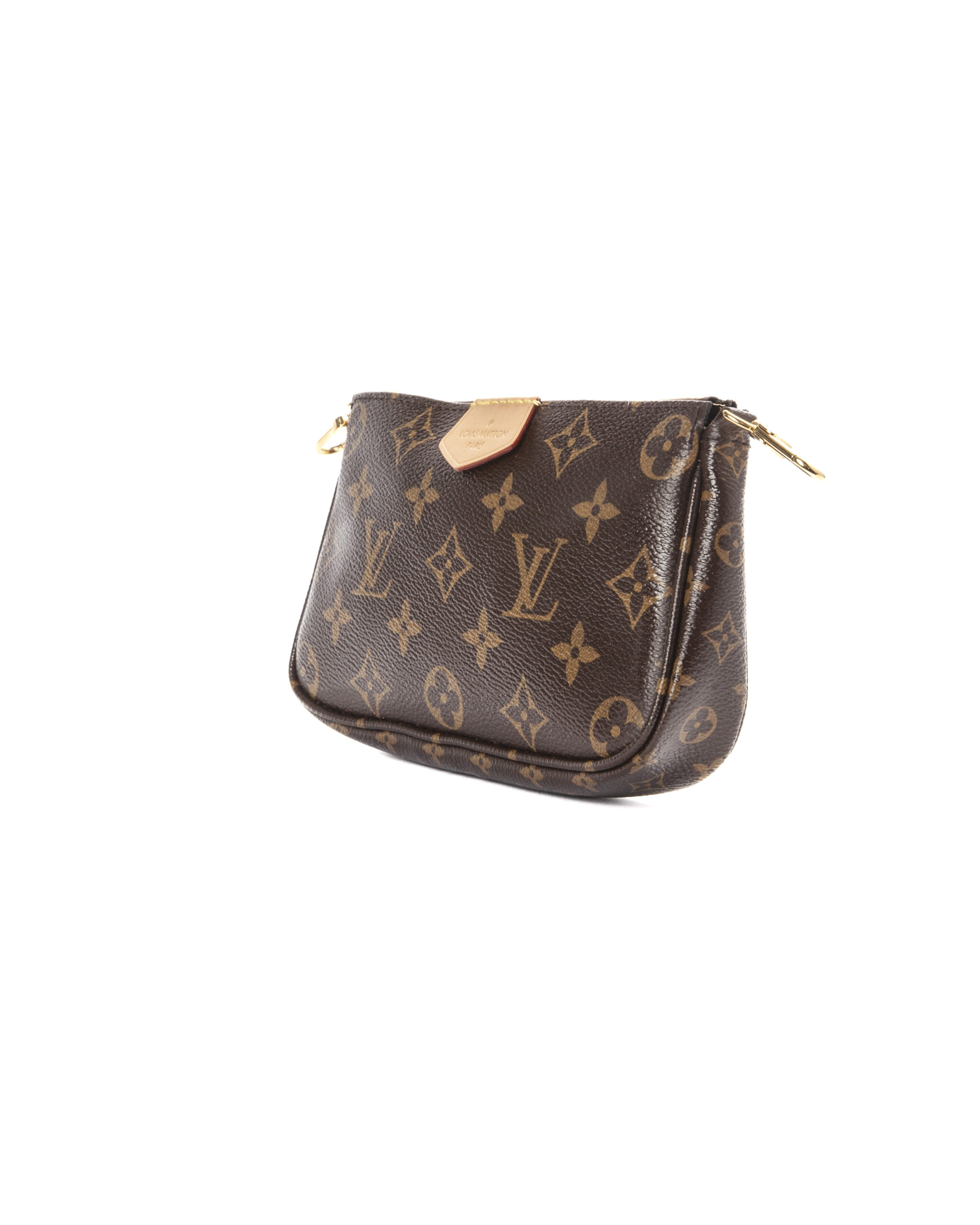 Borsa firmata Louis Vuitton, modello Multi Pochette Accessoires, realizzata in tela nella classica fantasia Monogram con inserti rosa e hardware dorato. Dotata di una chiusura superiore a zip, internamente rivestita in tela marrone. Il modello è arricchito da una mini pochette e un porta monete rotondo, entrambi rimovibili, che aggiungono versatilità e stile. Completa di un manico a catena e una tracolla in tessuto, regolabile e rimovibile, per una portata comoda a mano, a spalla o a tracolla. L’articolo si presenta in ottime condizioni.