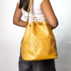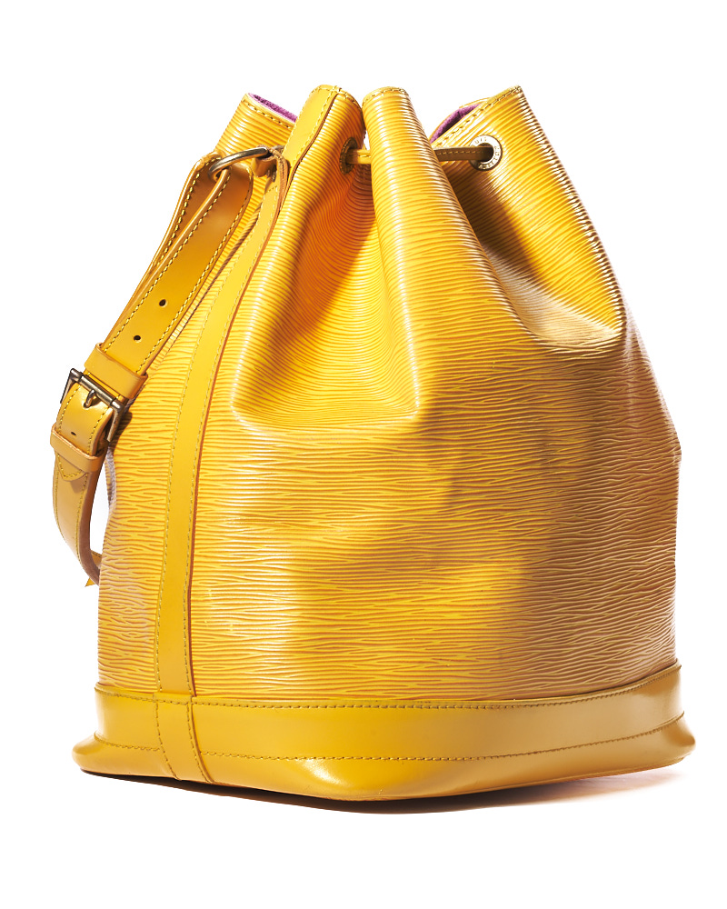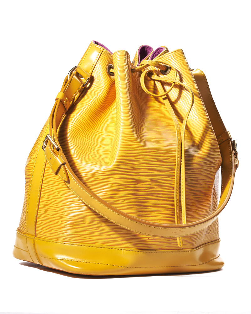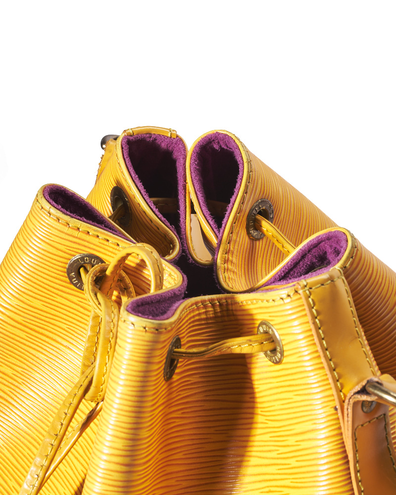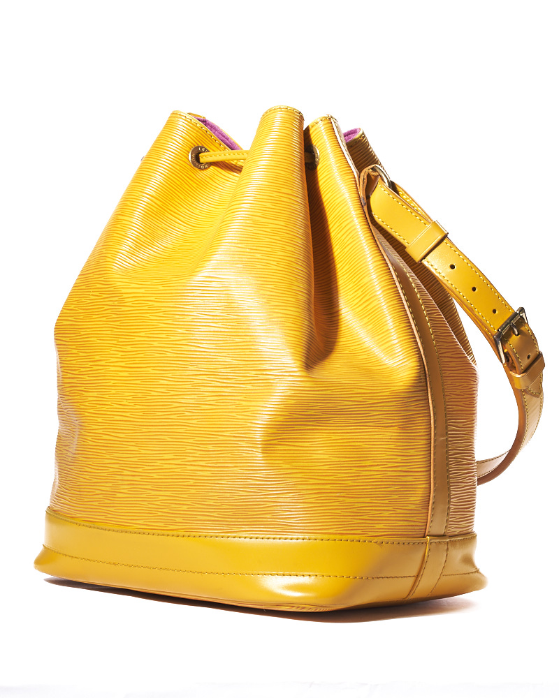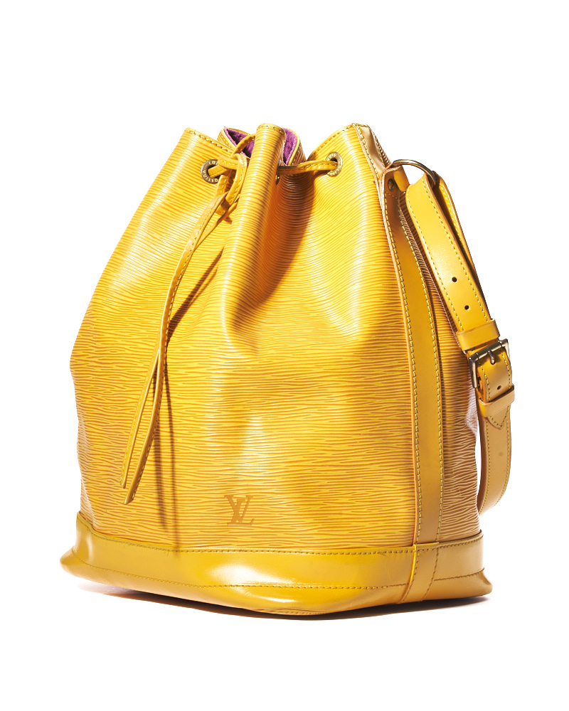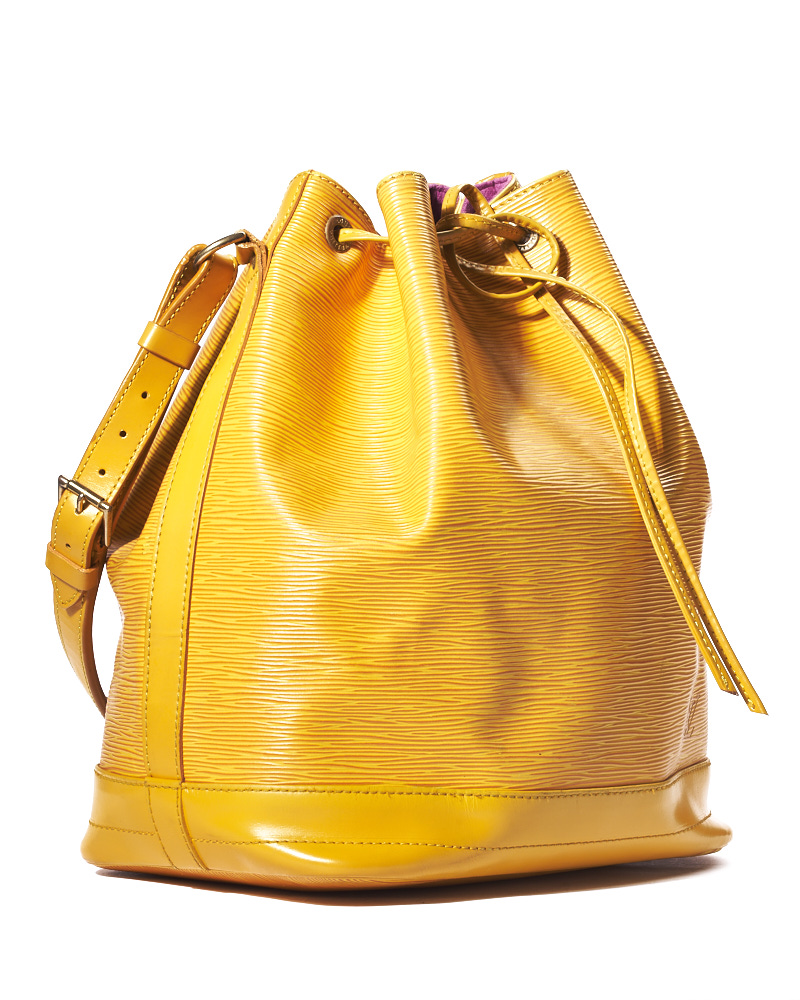 Borsa firmata Louis Vuitton, modello Noè nella misura GM, realizzata in pelle Epi gialla con hardware dorato. Dotata di una chiusura superiore a coulisse, internamente rivestita in tessuto scamosciato viola, la borsa è abbastanza capiente. Munita di un manico regolabile, per una comoda portata a mano o a spalla. L’articolo si presenta in buone condizioni, con segni di usura visibili in foto.