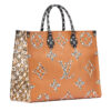 Borsa firmata Louis Vuitton, modello OnTheGo nella misura GM, realizzata in tela nella classica fantasia monogram giant leopard nera e marrone con hardware dorato. Dotata di una chiusura a gancio, internamente rivestita in tela marrone con comode tasche, la borsa è molto capiente. Munita di doppio manici toron, per una comoda portata a mano o a spalla. L’articolo si presenta in ottime condizioni.