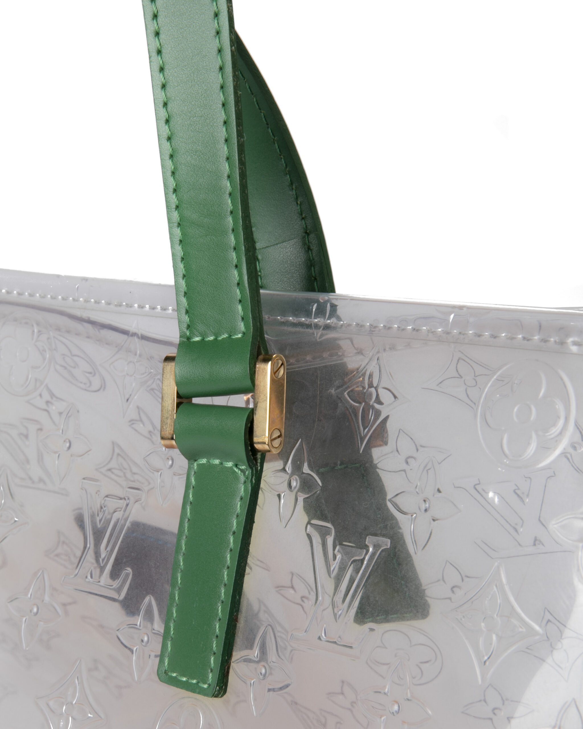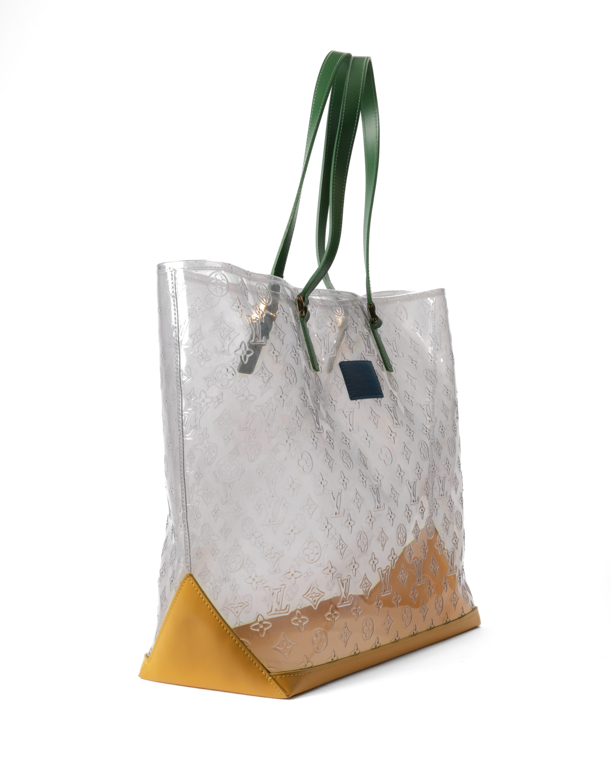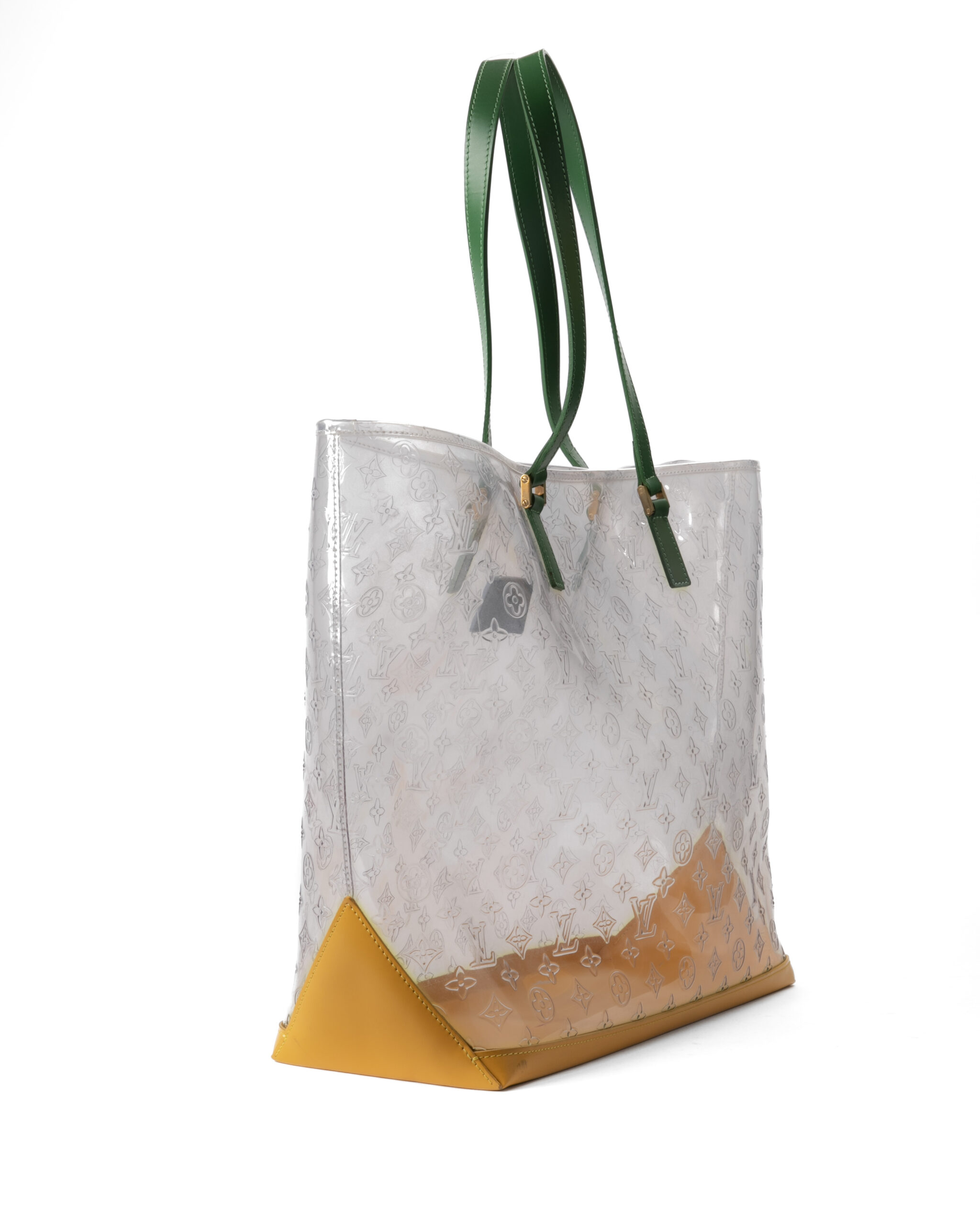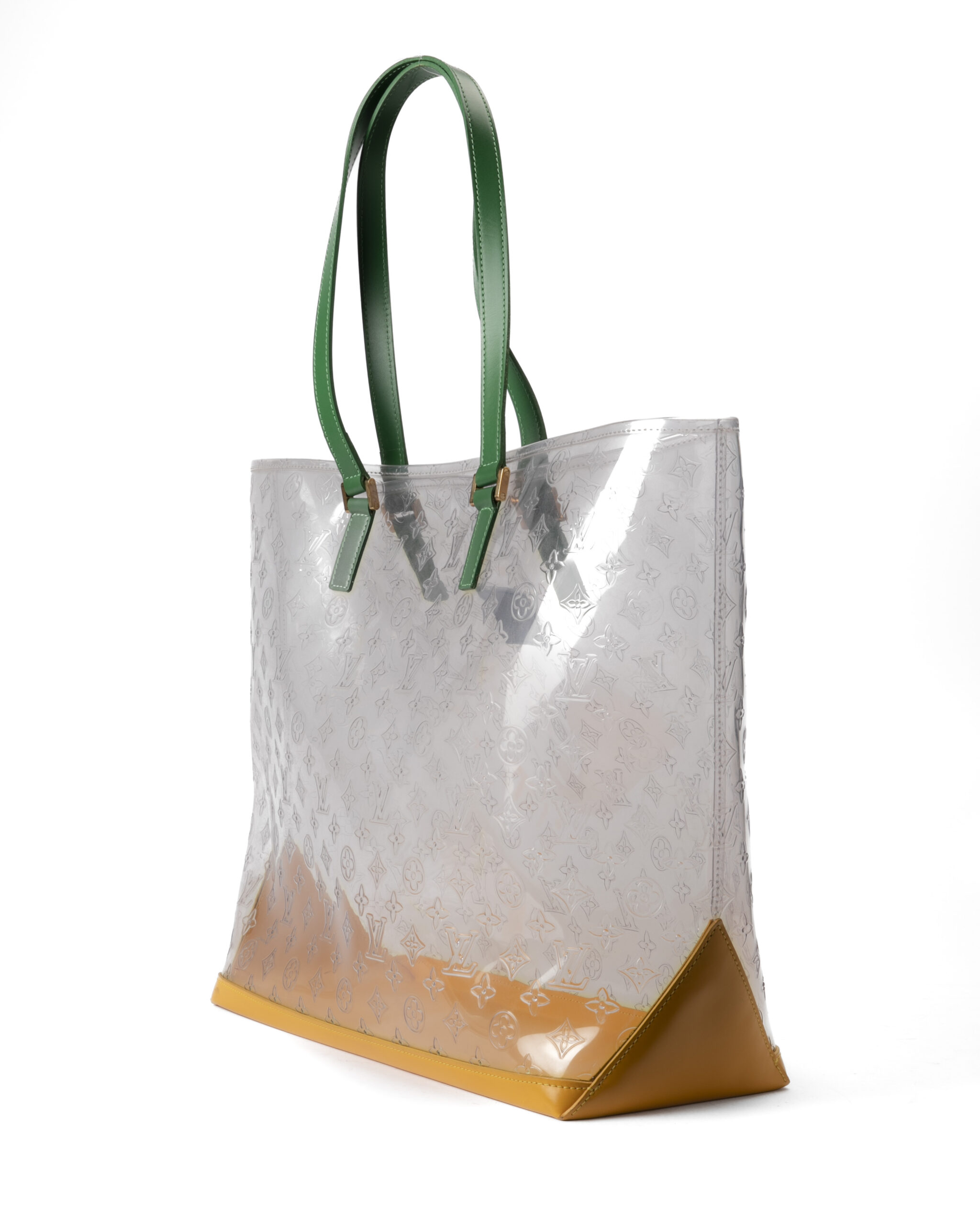 Borsa firmata Louis Vuitton, modello Piano nella misura GM, realizzata in pvc trasparente nella fantasia monogram con rifiniture in pelle e hardware dorato. Non è dotata di nessuna chiusura,  la borsa è molto capiente. Munita di doppio manico in pelle verde, per una comoda portata a spalla o a mano. L'articolo si presenta in buone condizioni, con segni di usura visibili in foto.