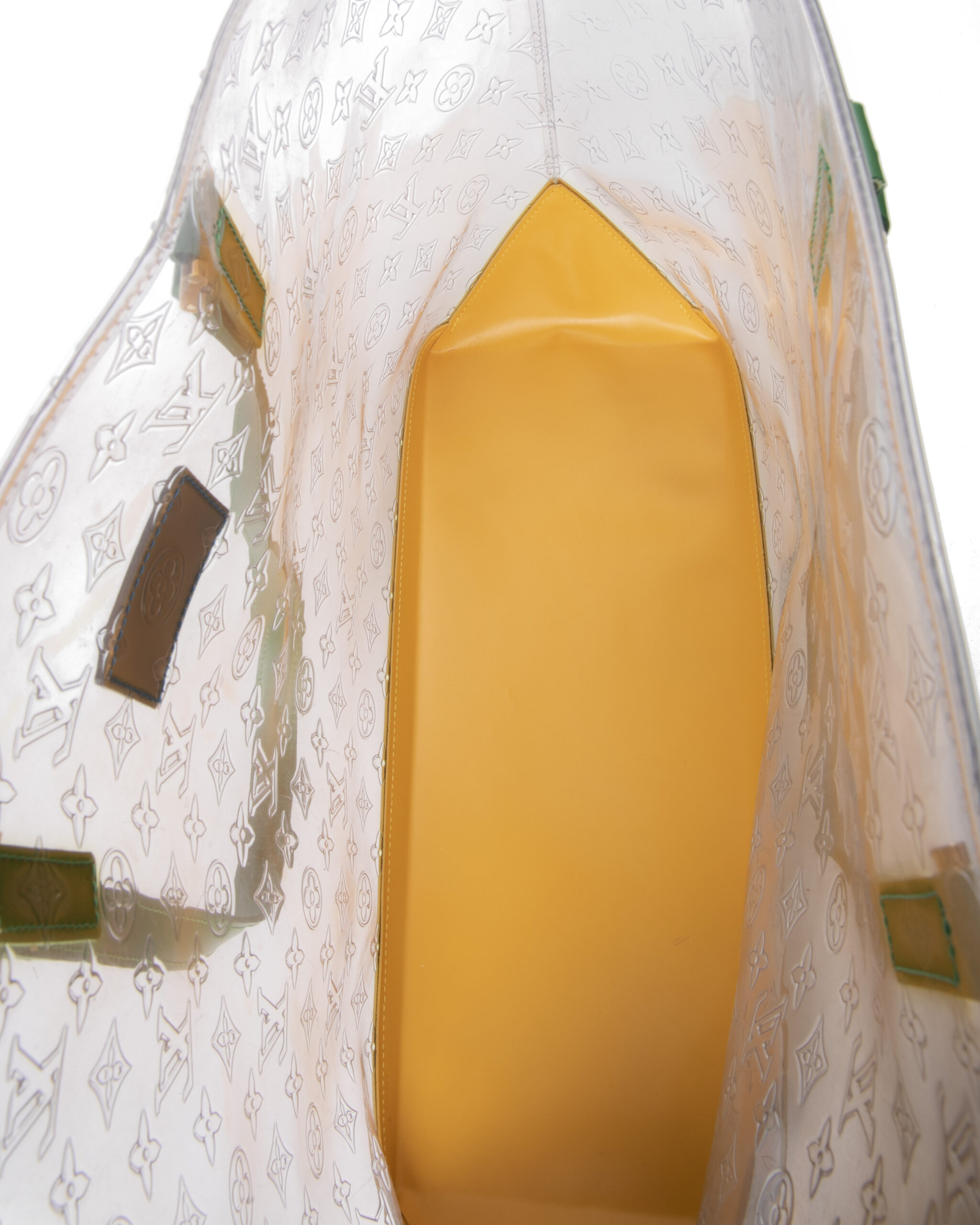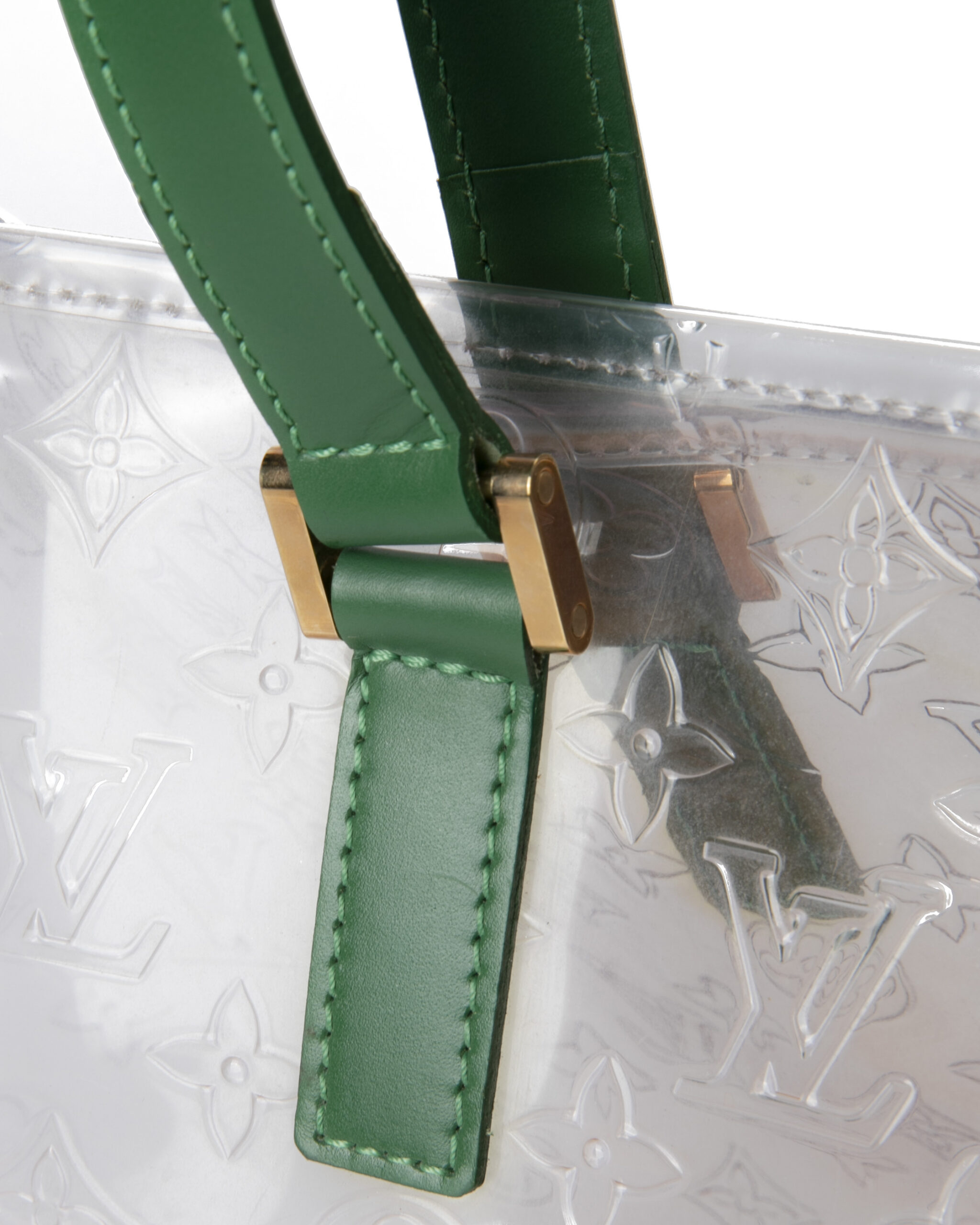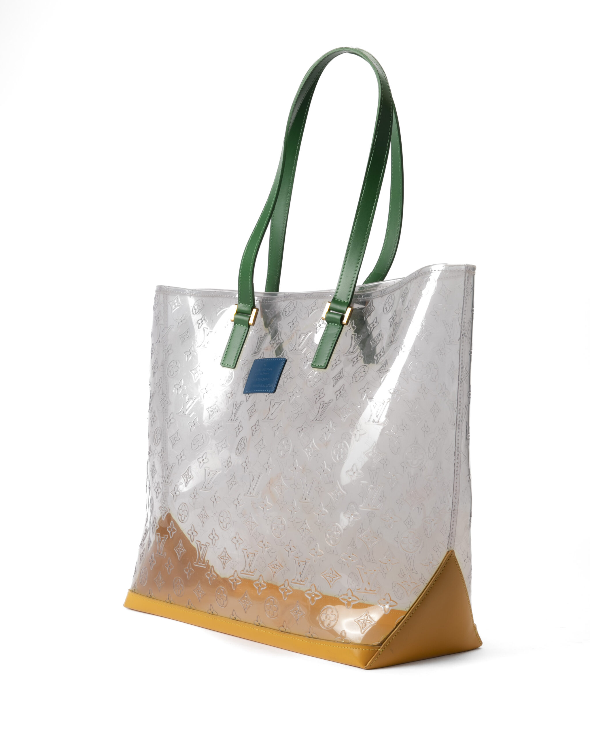 Borsa firmata Louis Vuitton, modello Piano nella misura GM, realizzata in pvc trasparente nella fantasia monogram con rifiniture in pelle e hardware dorato. Non è dotata di nessuna chiusura,  la borsa è molto capiente. Munita di doppio manico in pelle verde, per una comoda portata a spalla o a mano. L'articolo si presenta in buone condizioni, con segni di usura visibili in foto.