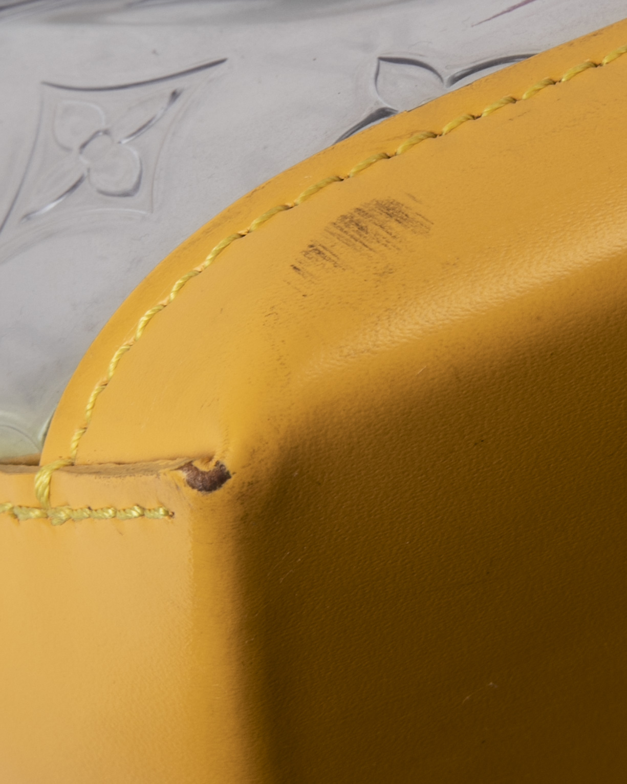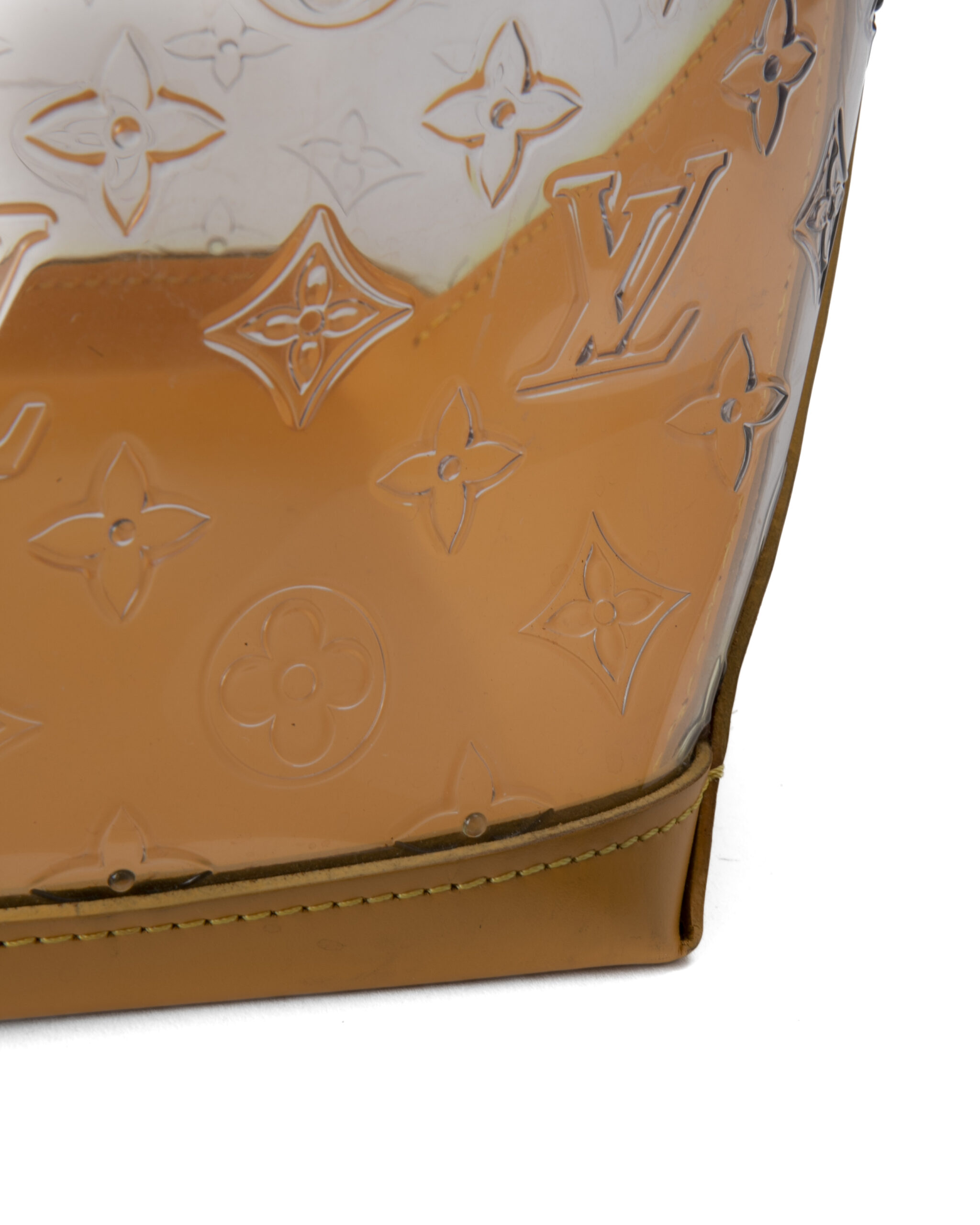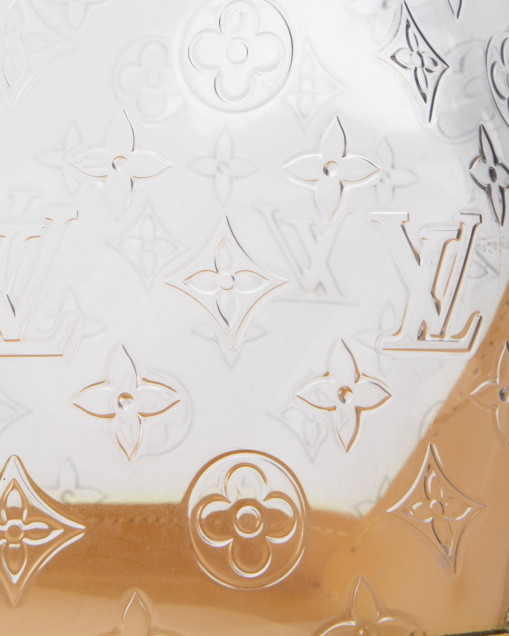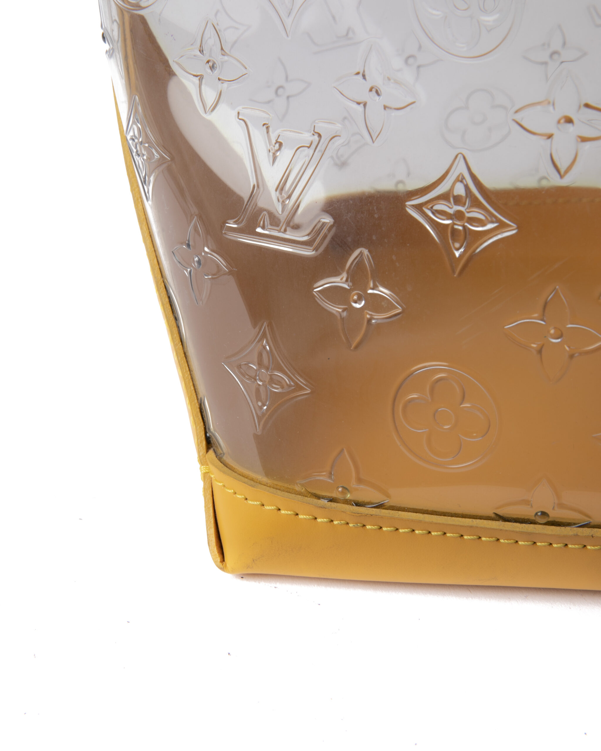 Borsa firmata Louis Vuitton, modello Piano nella misura GM, realizzata in pvc trasparente nella fantasia monogram con rifiniture in pelle e hardware dorato. Non è dotata di nessuna chiusura,  la borsa è molto capiente. Munita di doppio manico in pelle verde, per una comoda portata a spalla o a mano. L'articolo si presenta in buone condizioni, con segni di usura visibili in foto.