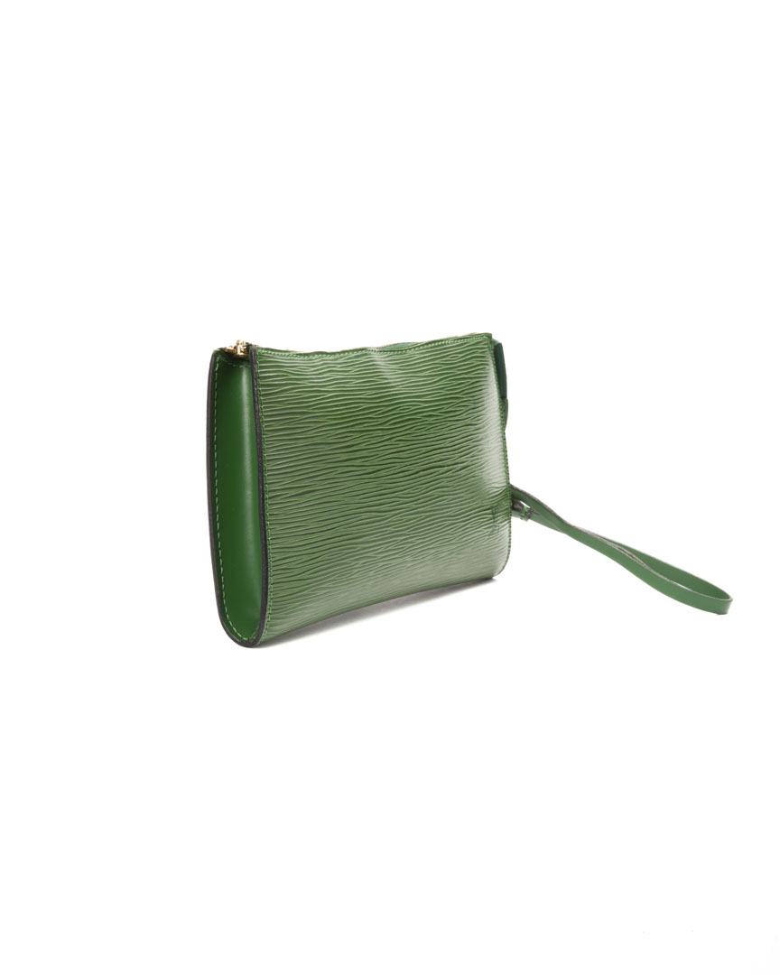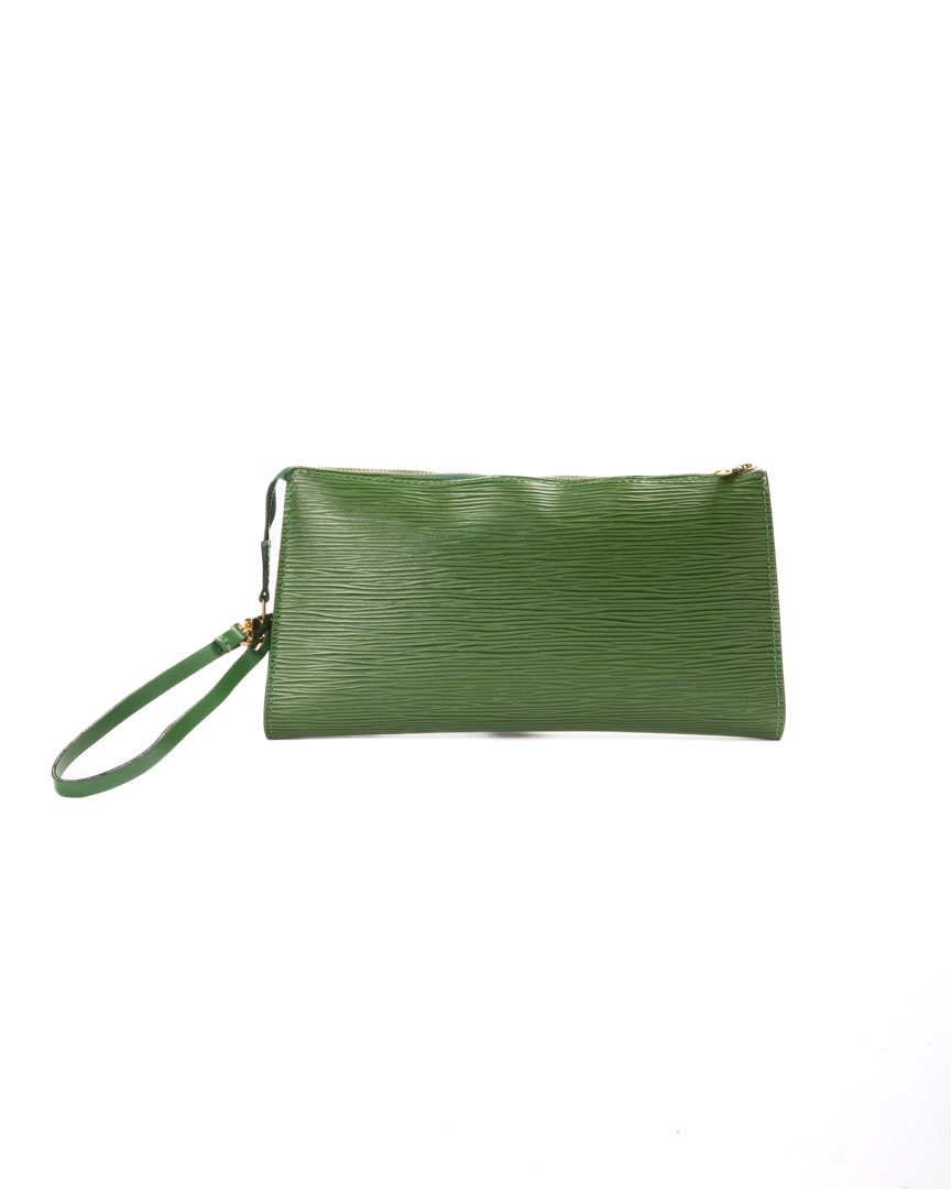 Pochette firmata Louis Vuitton, modello Accessoires nella misura MM, realizzata in pelle epi verde con hardware dorato. Dotata di una chiusura superiore a zip, internamente rivestita in tessuto scamosciato tono su tono, la pochette è capiente per l’essenziale. Munita di un polsino rimovibile in pelle, per una comoda portata a mano o a da inserire in qualche borsa. L’articolo si presenta in ottime condizioni.