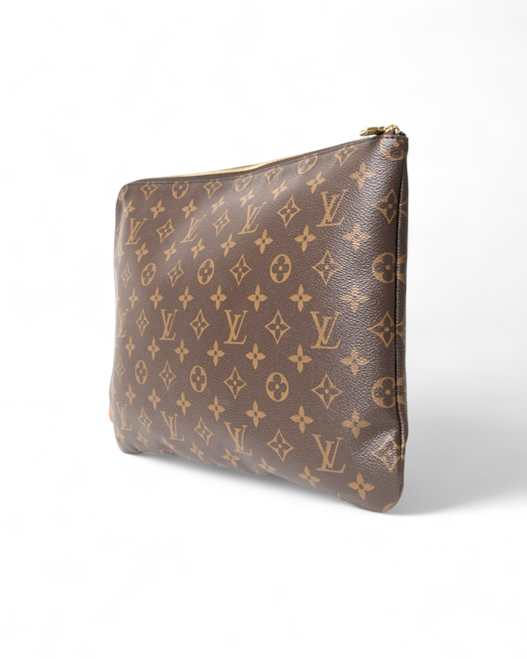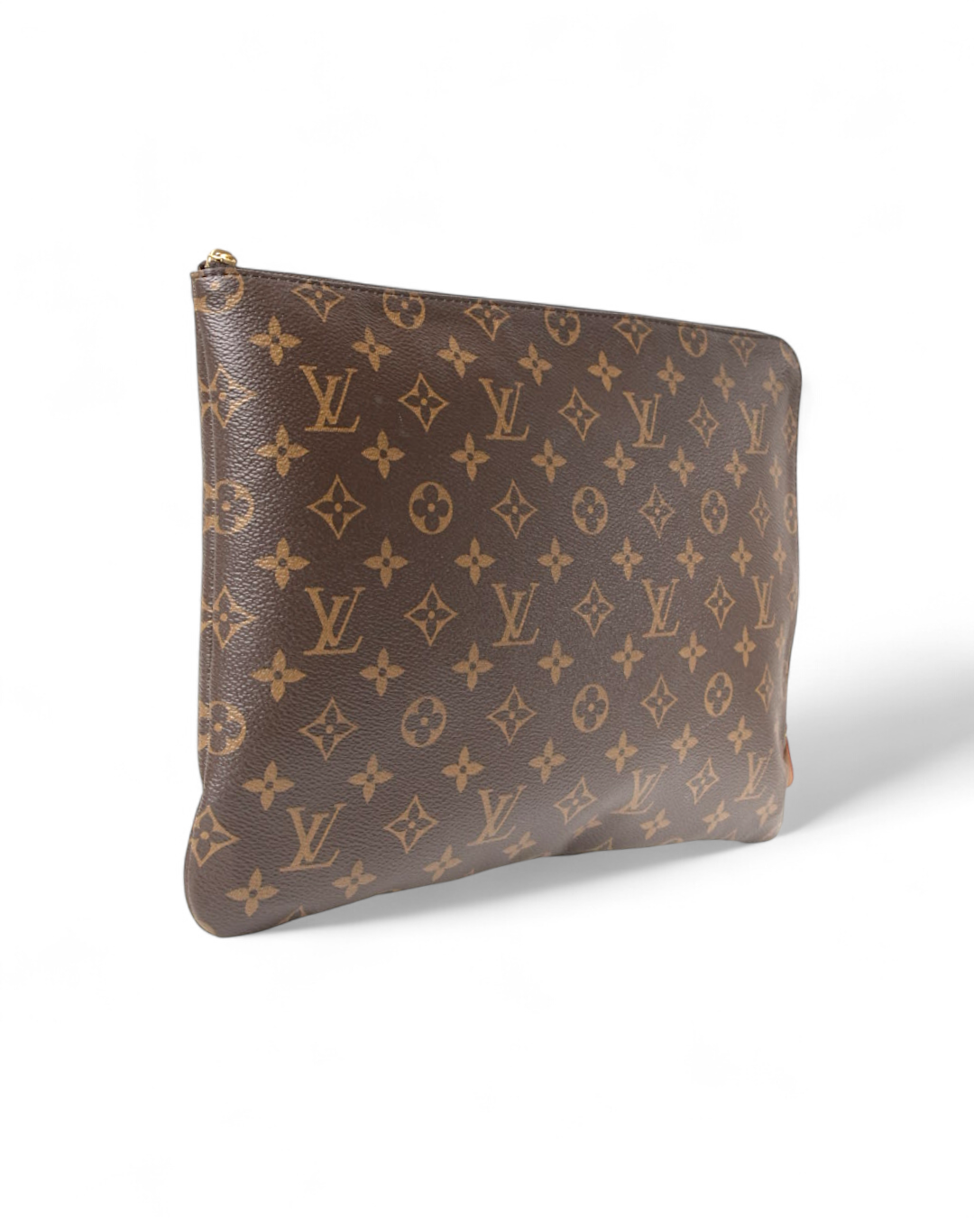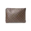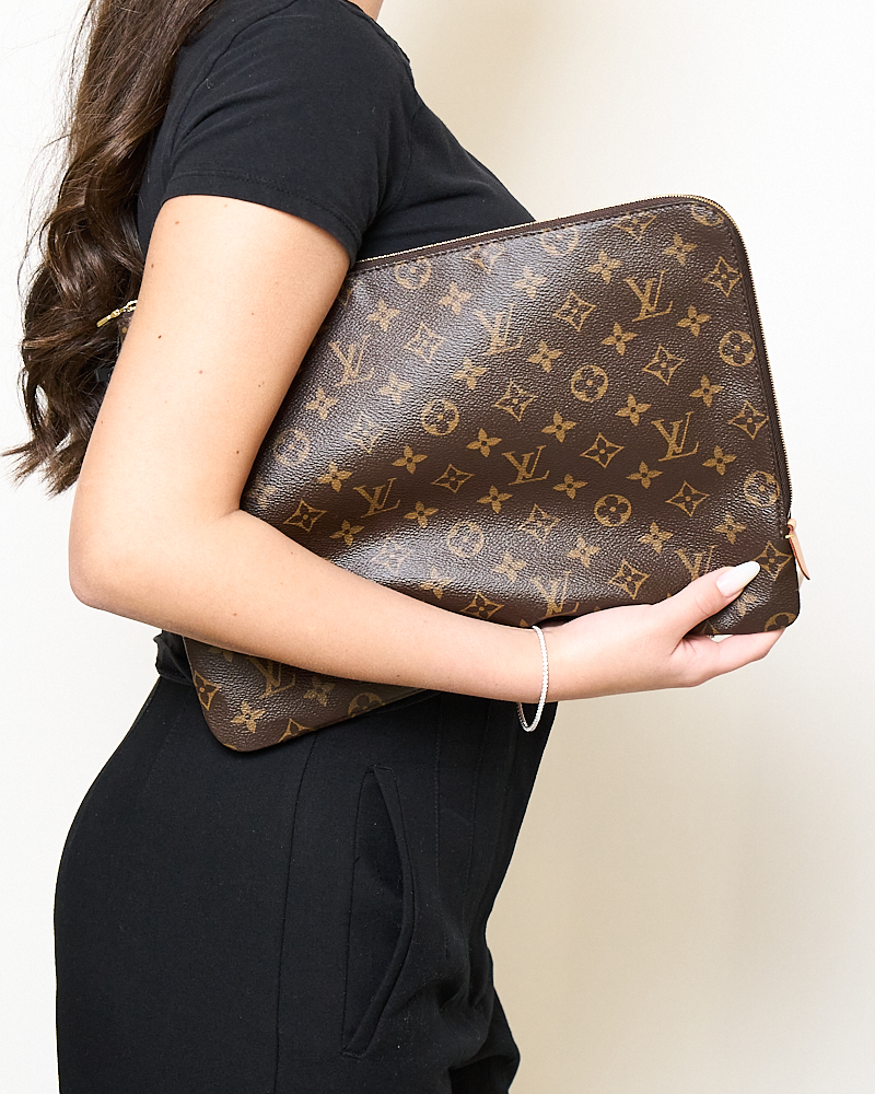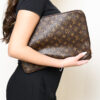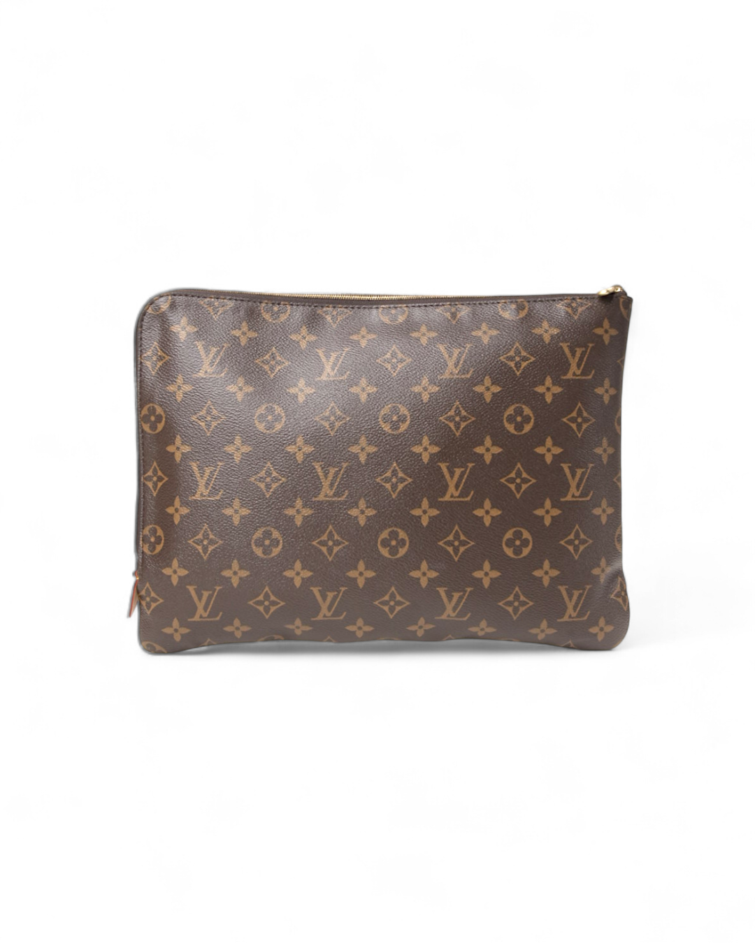 Pochette firmata Louis Vuitton, modello Etui Voyage, realizzata in tela marrone nella classica fantasia monogram con inserti in vacchetta e hardware dorato. Dotata di una chiusura semicircolare a zip, internamente rivestita in tela marrone con comoda tasca, la borsa è abbastanza capiente. L’articolo si presenta in ottime condizioni.