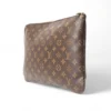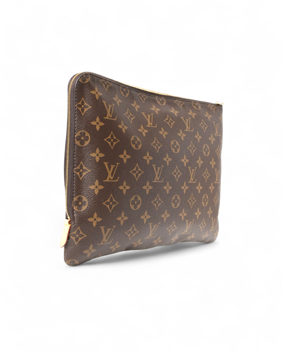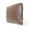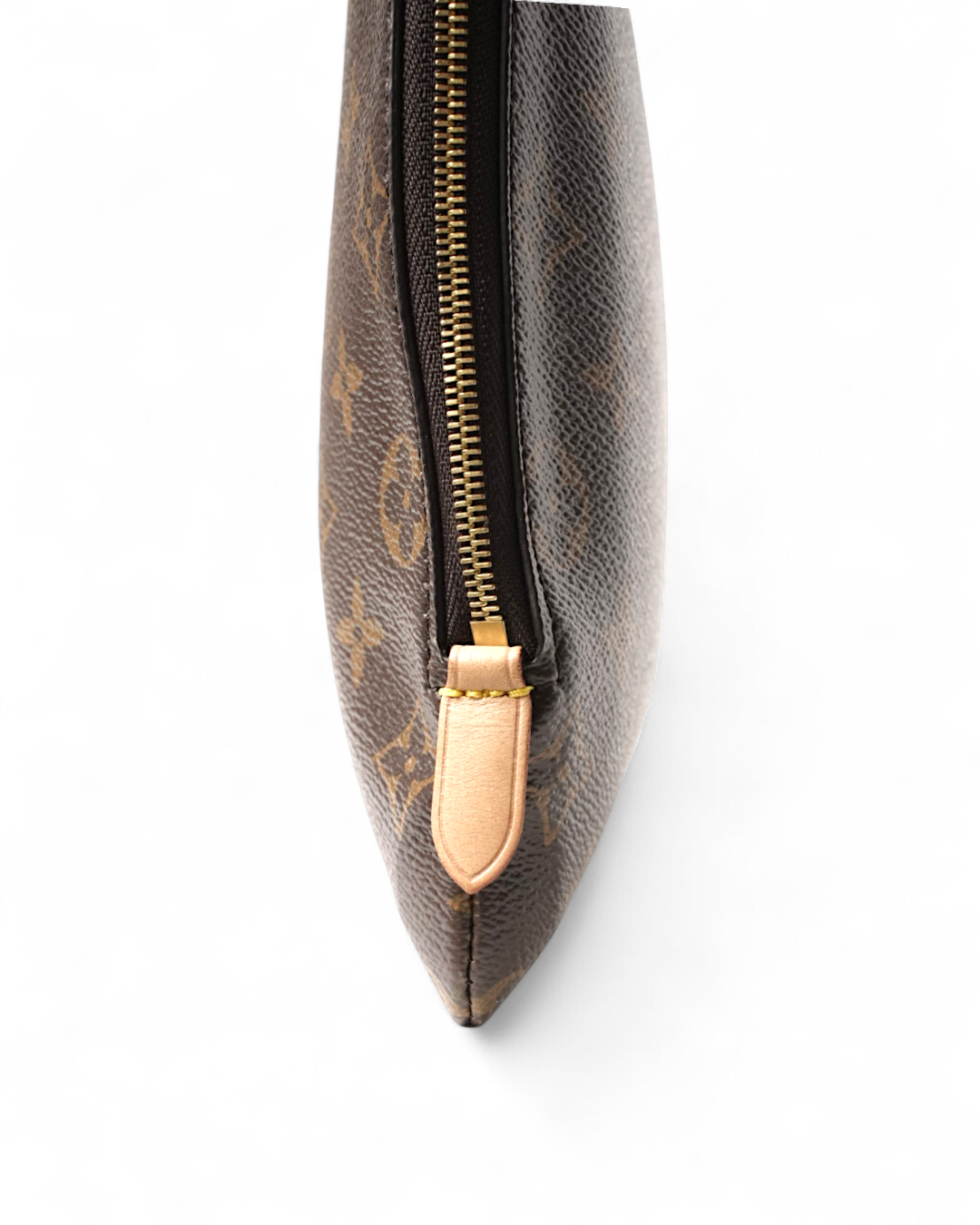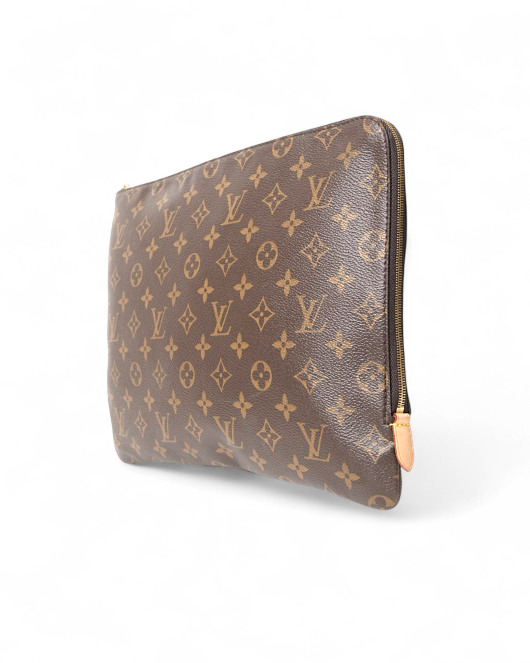 Pochette firmata Louis Vuitton, modello Etui Voyage, realizzata in tela marrone nella classica fantasia monogram con inserti in vacchetta e hardware dorato. Dotata di una chiusura semicircolare a zip, internamente rivestita in tela marrone con comoda tasca, la borsa è abbastanza capiente. L’articolo si presenta in ottime condizioni.
