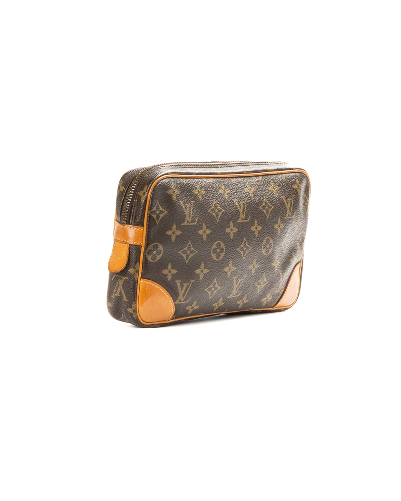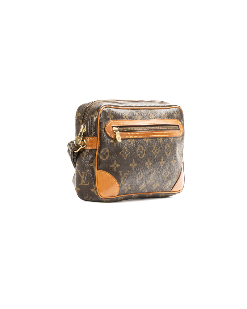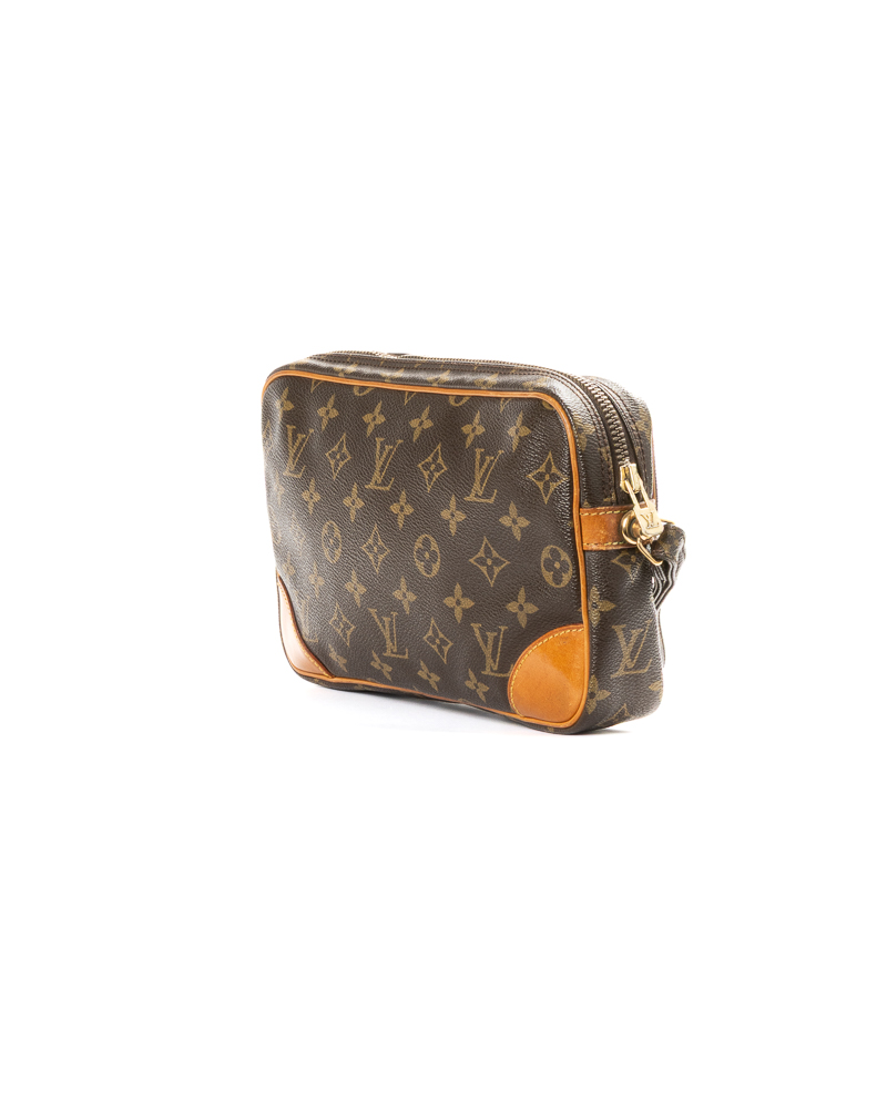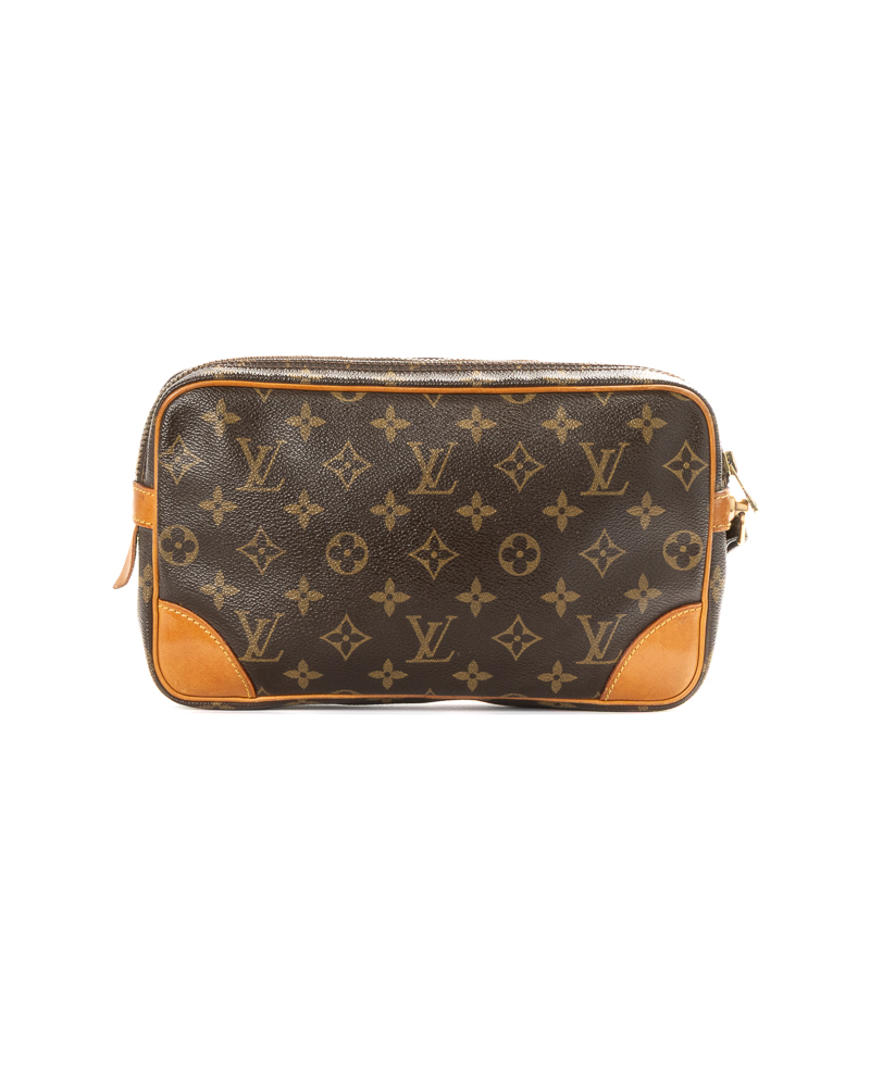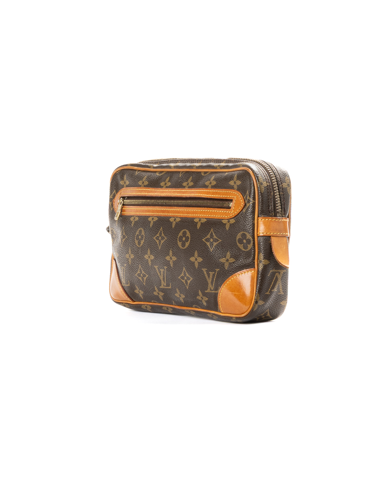 Pochette firmata Louis Vuitton, modello Marly nella misura MM, realizzata in tela marrone nella classica fantasia monogram con inserti in vacchetta e hardware dorato. Dotata di una chiusura superiore a zip, internamente rivestita in pelle marrone con comode tasche, la pochette è abbastanza capiente. Munita di un polsino, per una comoda portata a mano. Completa di una comoda tasca sulla parte frontale con chiusura a zip. L’articolo si presenta in buone condizioni, con tasche vulcanizzate, visibili in foto.