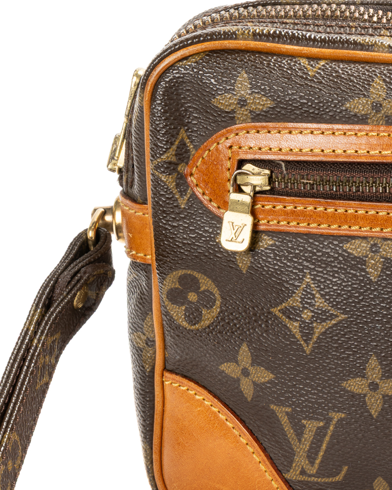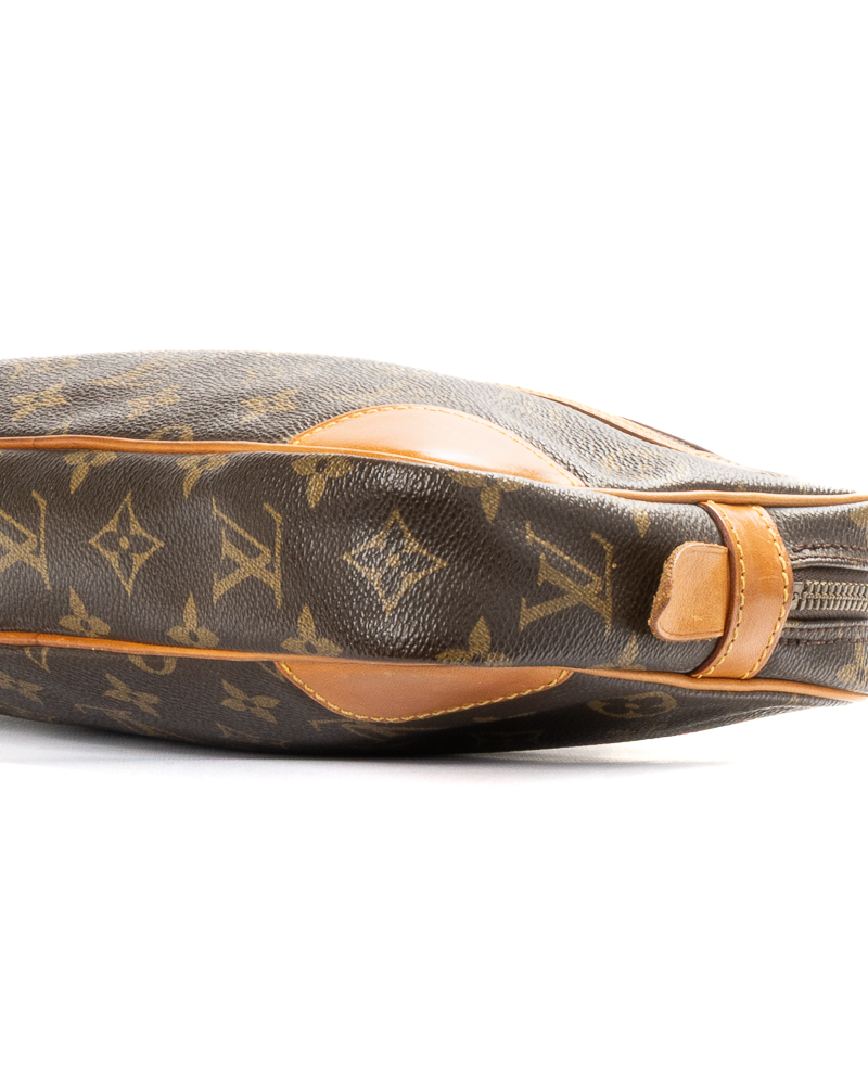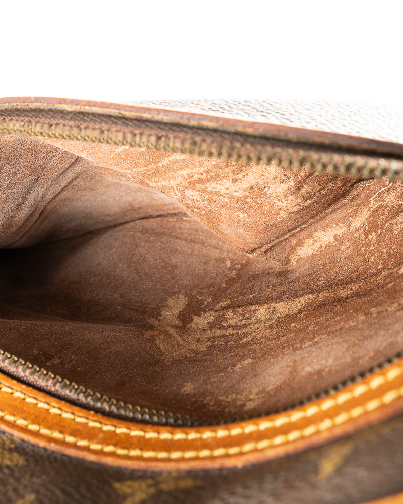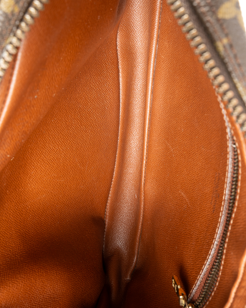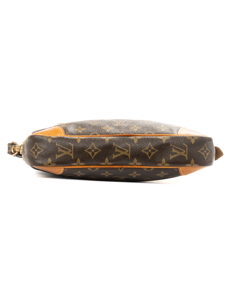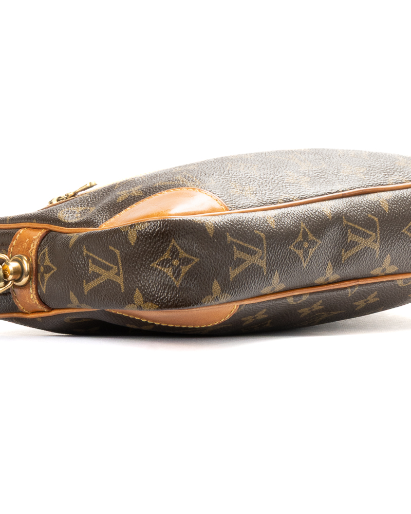 Pochette firmata Louis Vuitton, modello Marly nella misura MM, realizzata in tela marrone nella classica fantasia monogram con inserti in vacchetta e hardware dorato. Dotata di una chiusura superiore a zip, internamente rivestita in pelle marrone con comode tasche, la pochette è abbastanza capiente. Munita di un polsino, per una comoda portata a mano. Completa di una comoda tasca sulla parte frontale con chiusura a zip. L’articolo si presenta in buone condizioni, con tasche vulcanizzate, visibili in foto.