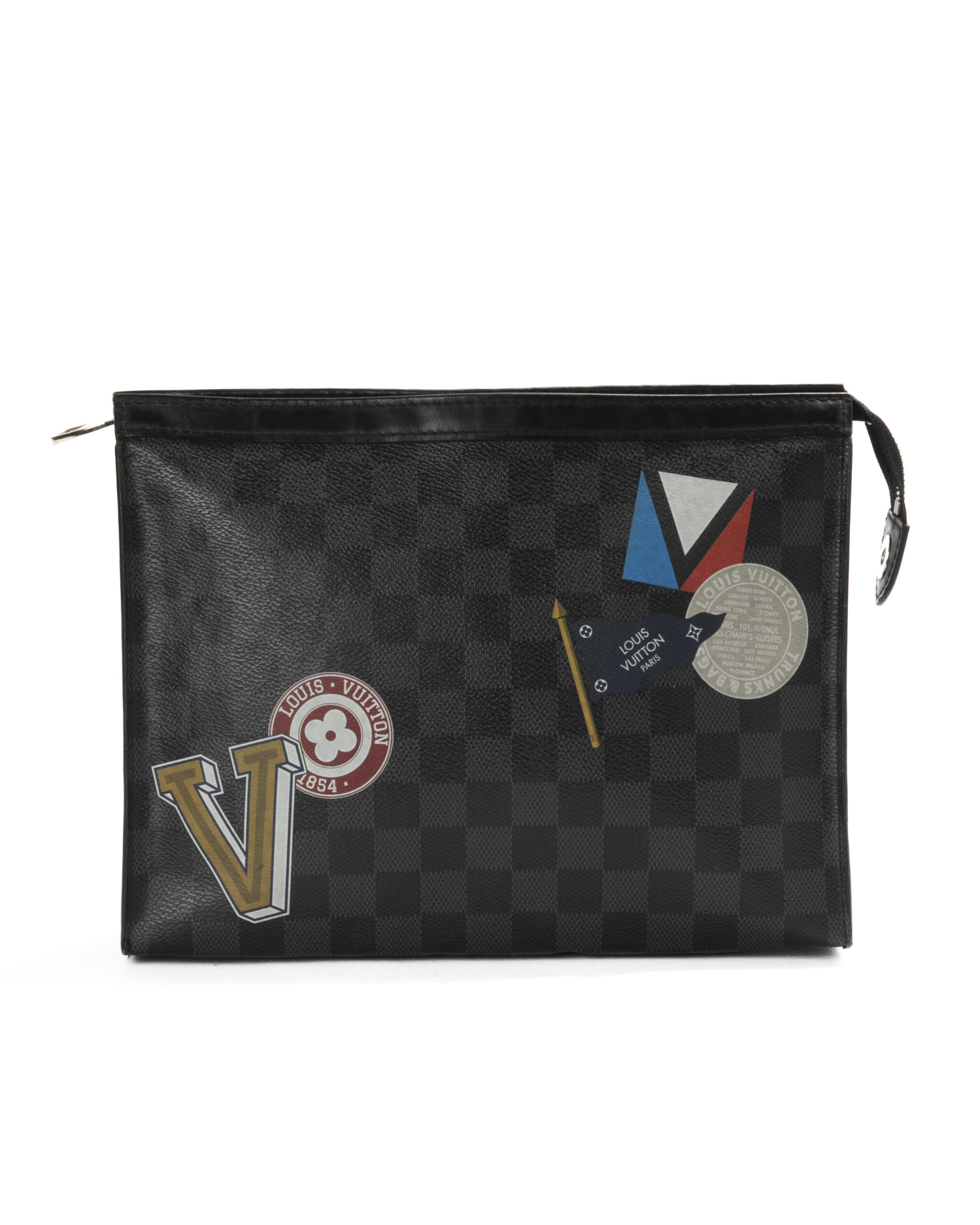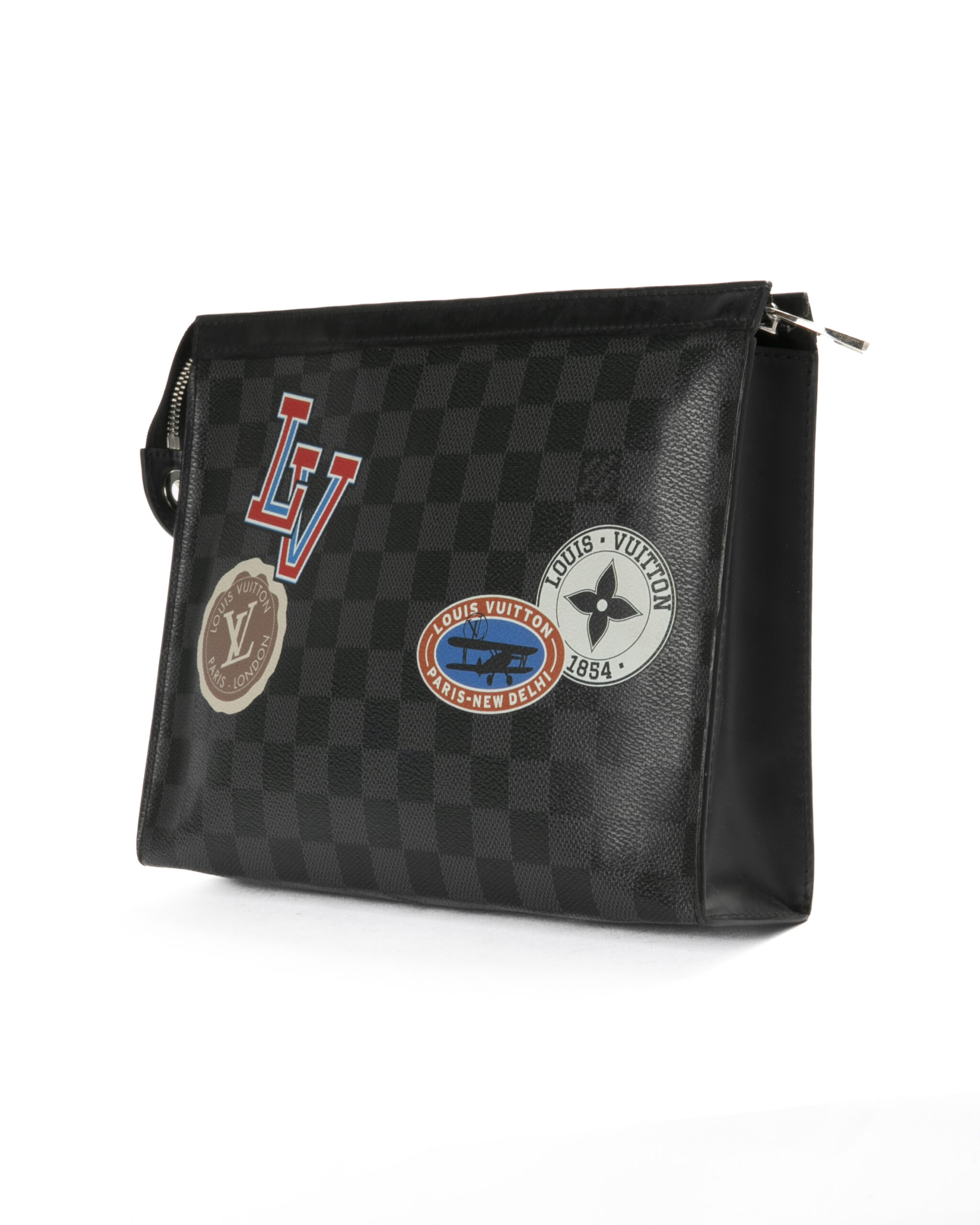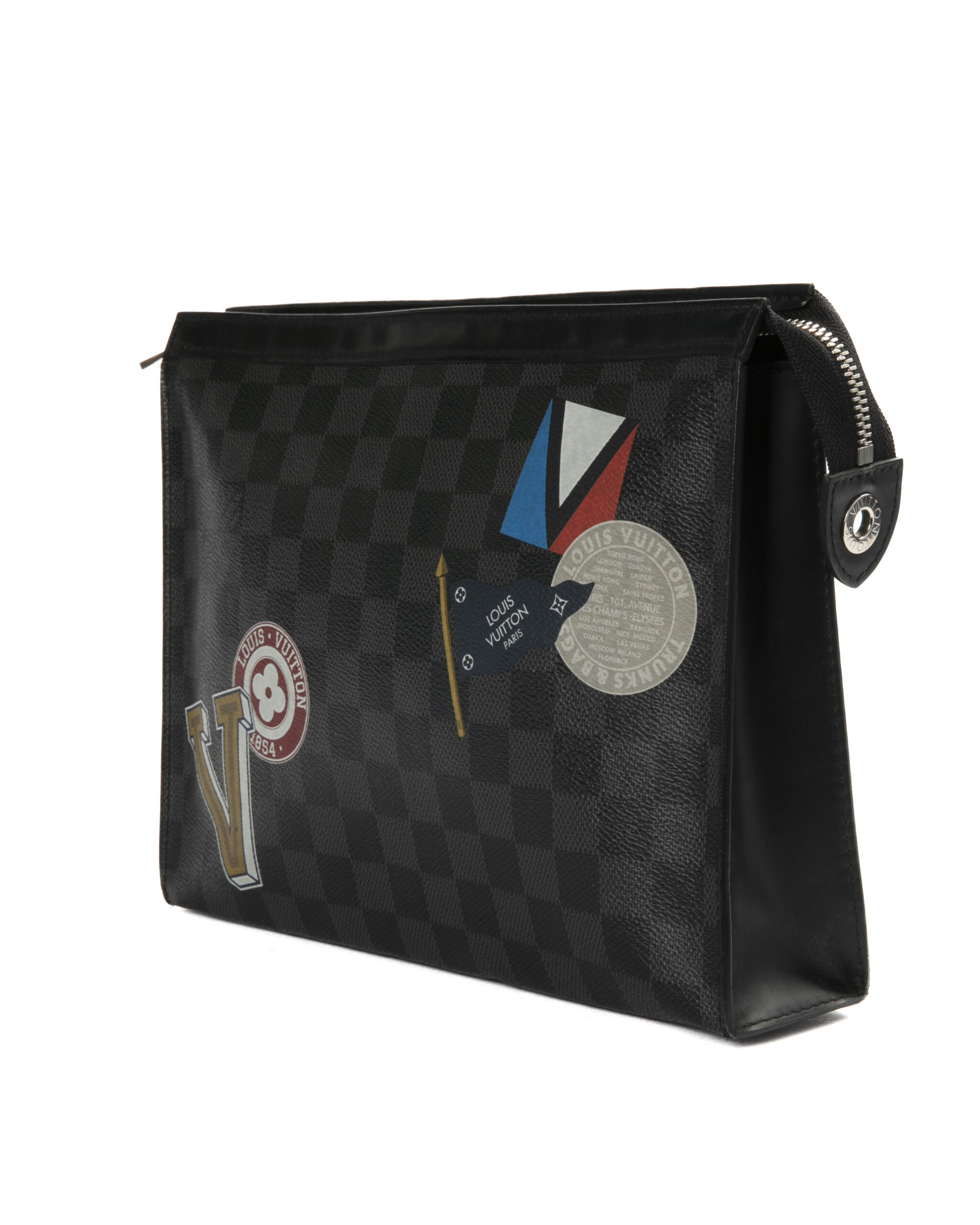 Pochette firmata Louis Vuitton, modello Voyage nella misura MM, realizzata in tela nella classica fantasia Damier Graphite con inserti in pelle e hardware argento. Dotata di una chiusura superiore a zip, internamente rivestita in tessuto nero con comode tasche, per documenti e banconote, la pochette è abbastanza capiente. Arricchita da patch su entrambi i lati. L'articolo si presenta in buone condizioni.