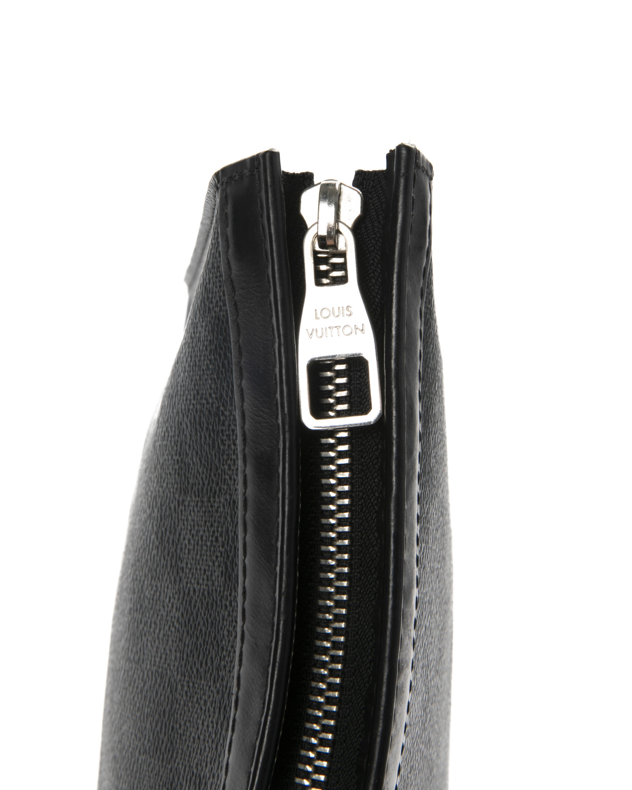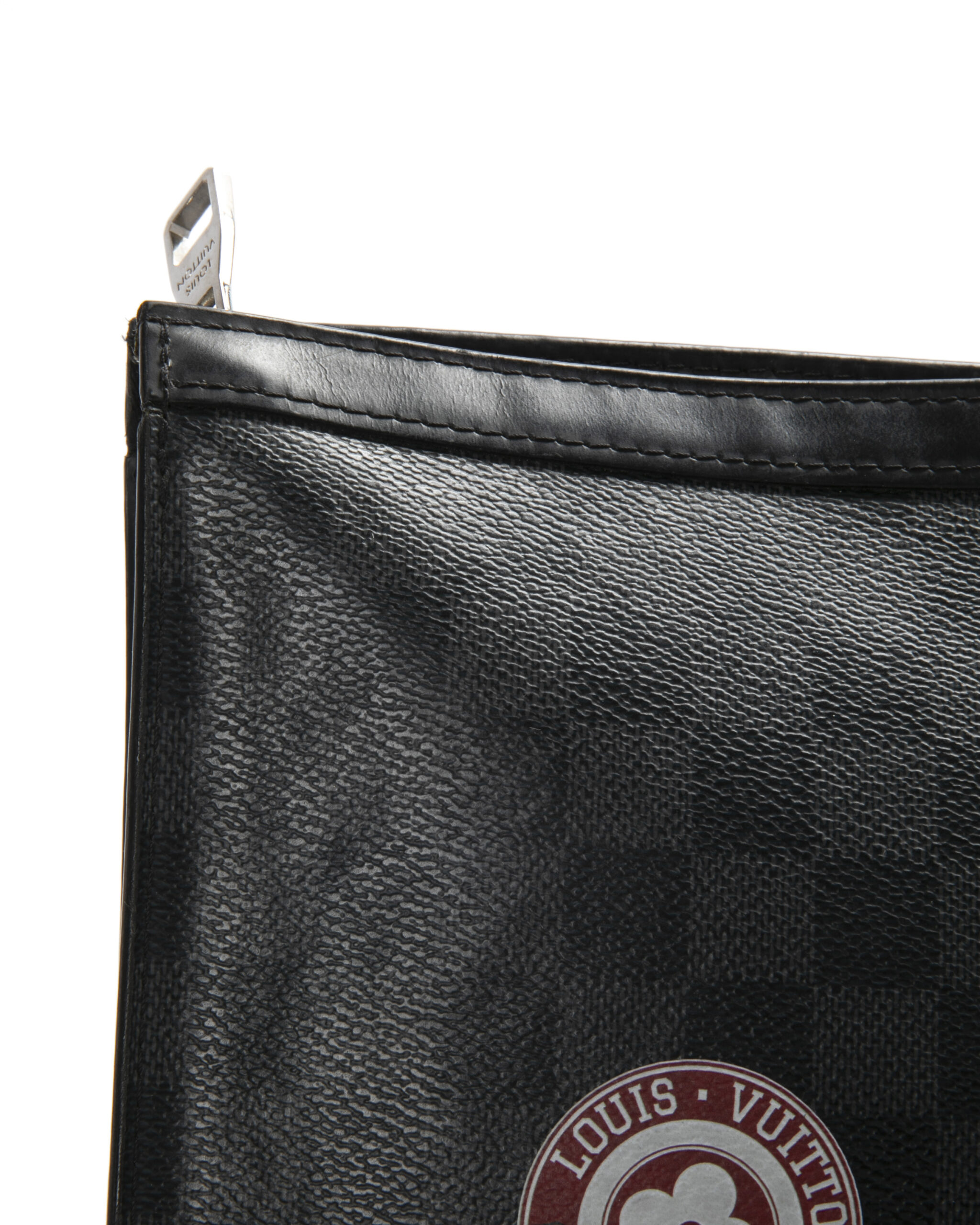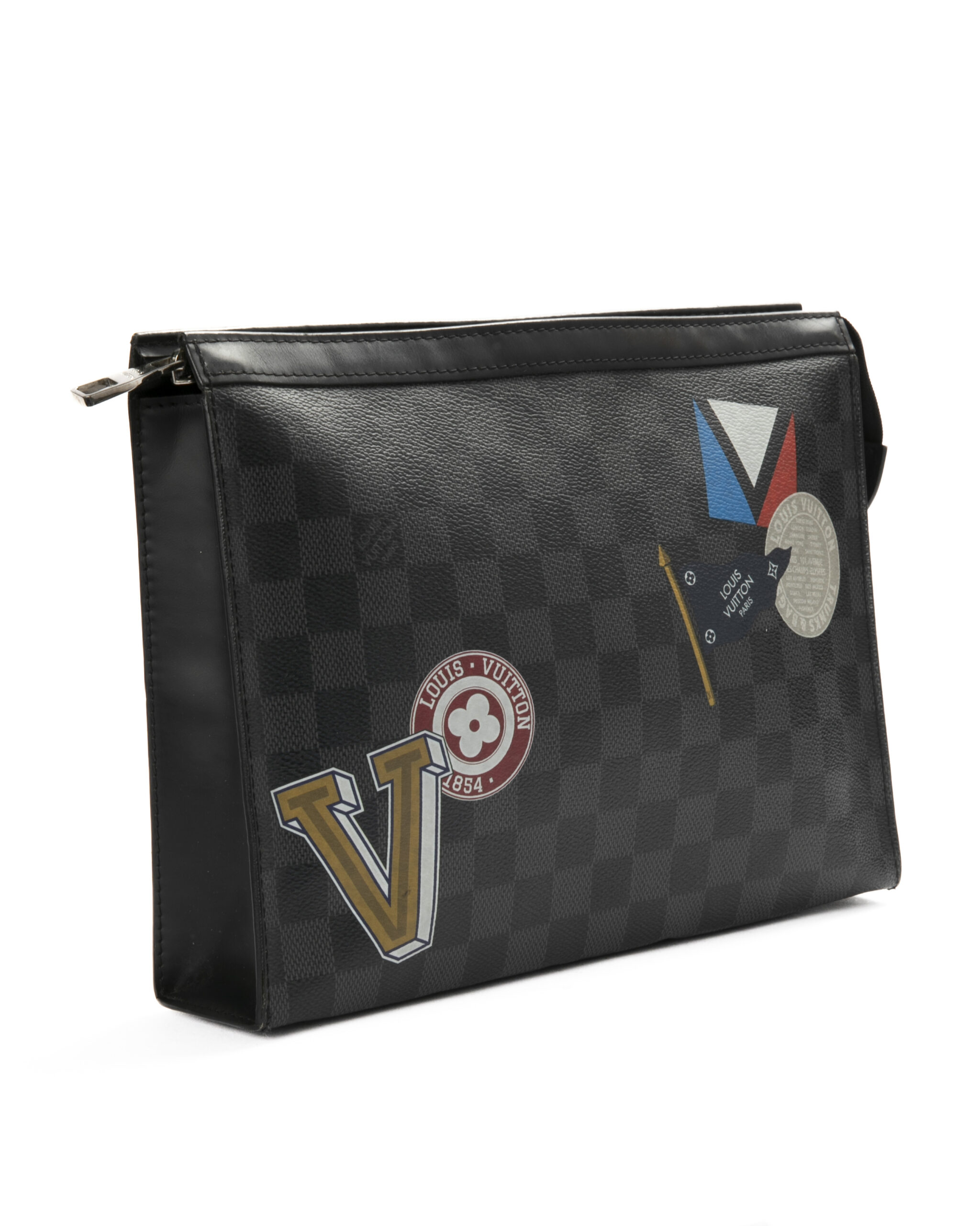 Pochette firmata Louis Vuitton, modello Voyage nella misura MM, realizzata in tela nella classica fantasia Damier Graphite con inserti in pelle e hardware argento. Dotata di una chiusura superiore a zip, internamente rivestita in tessuto nero con comode tasche, per documenti e banconote, la pochette è abbastanza capiente. Arricchita da patch su entrambi i lati. L'articolo si presenta in buone condizioni.