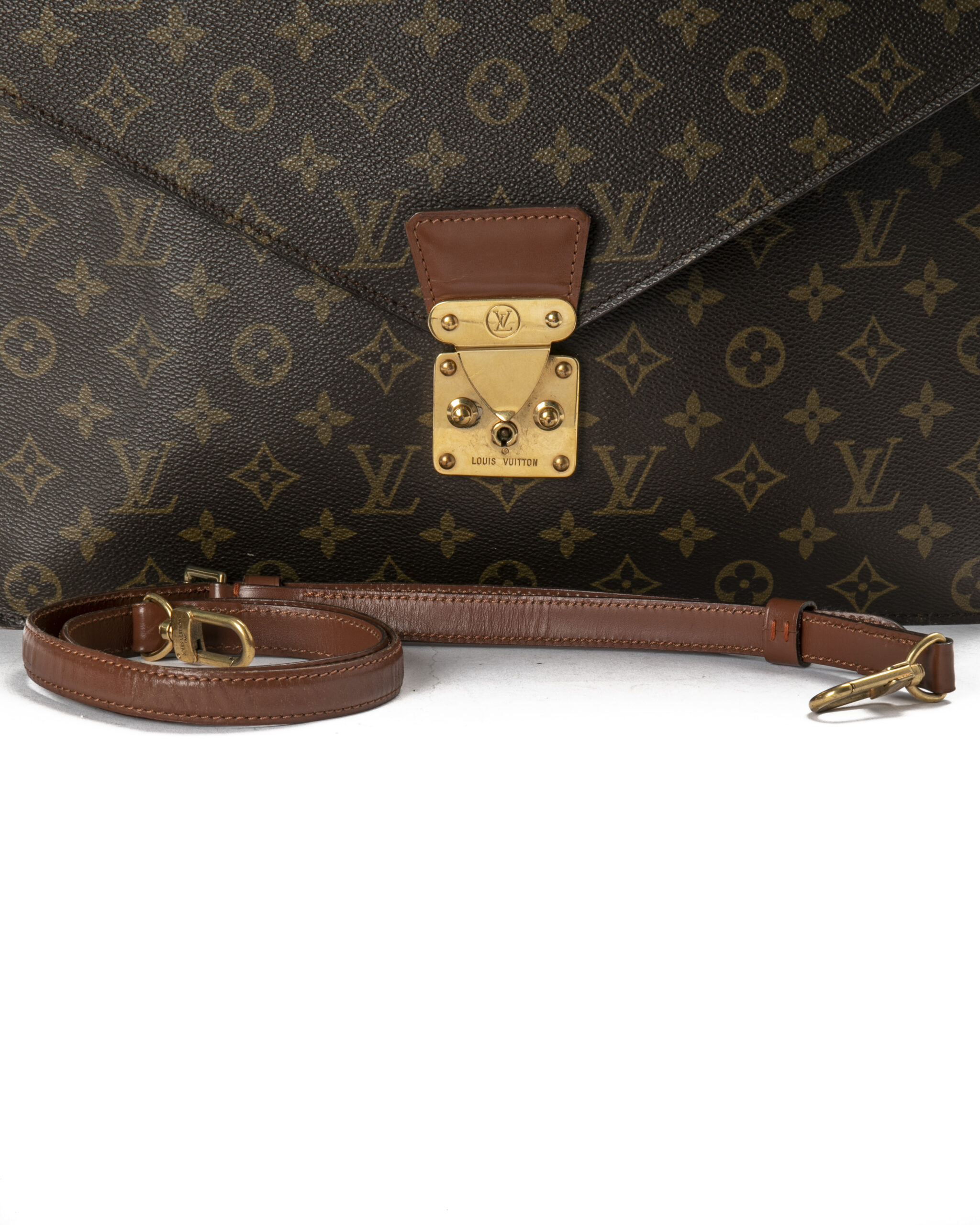 Portadocumenti firmato Louis Vuitton, linea Vintage, realizzata in tela nella fantasia monogram con inserti in pelle marrone e hardware dorato. Dotata di una patta con chiusura ad incastro, internamente rivestita in pelle marrone con comode tasche, la borsa è abbastanza capiente. Munito di un manico e di una tracolla rimovibile e regolabile, per una comoda portata a spalla o a mano. L’articolo si presenta in buone condizioni, con segni di usura visibili in foto.