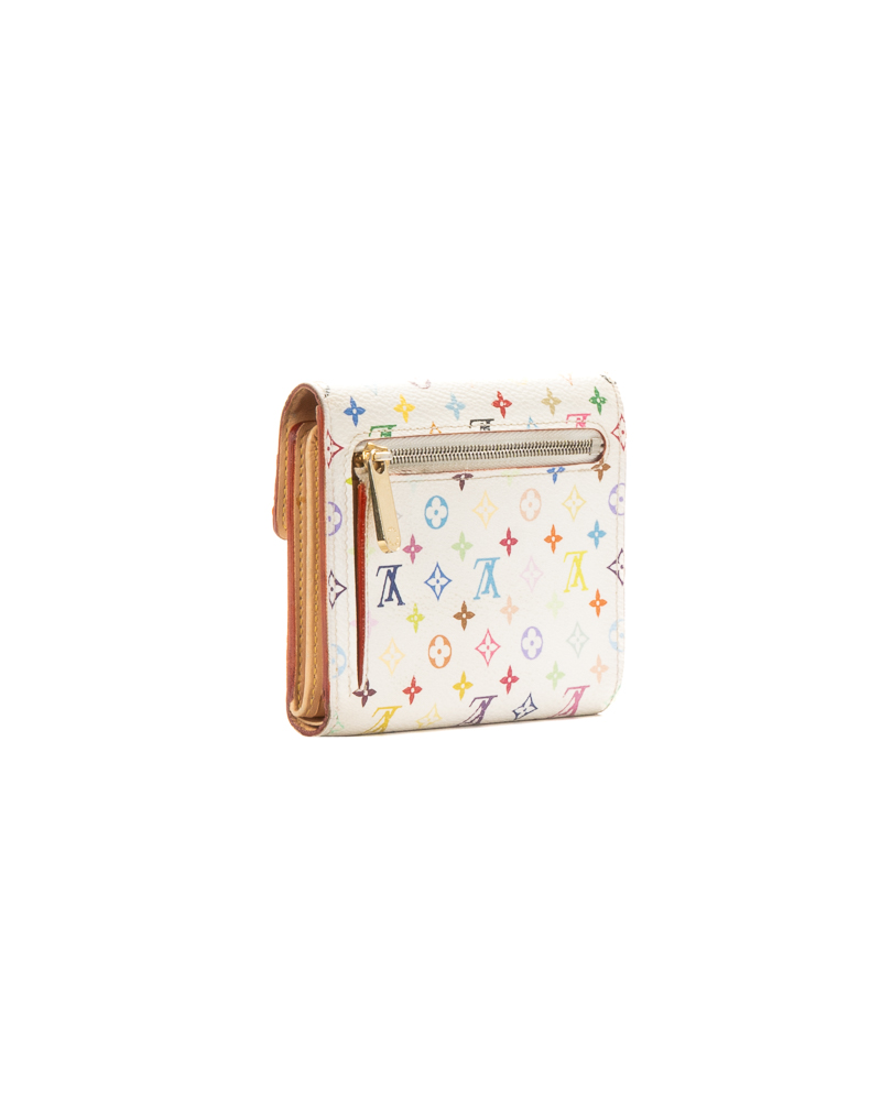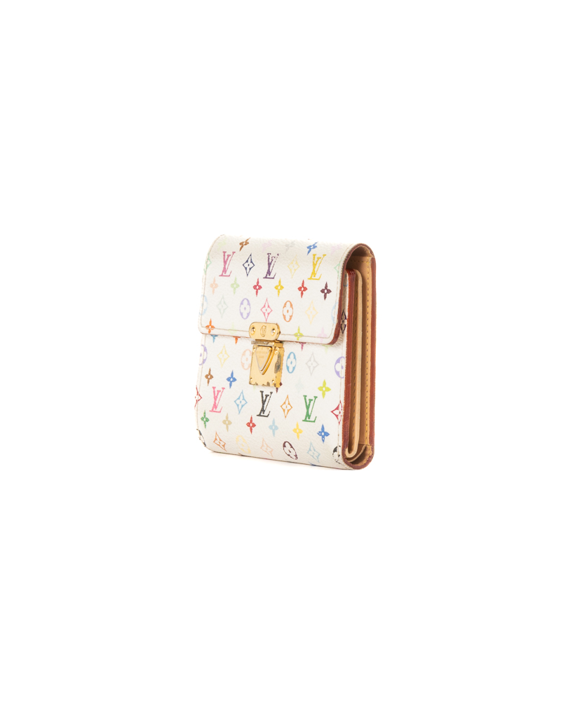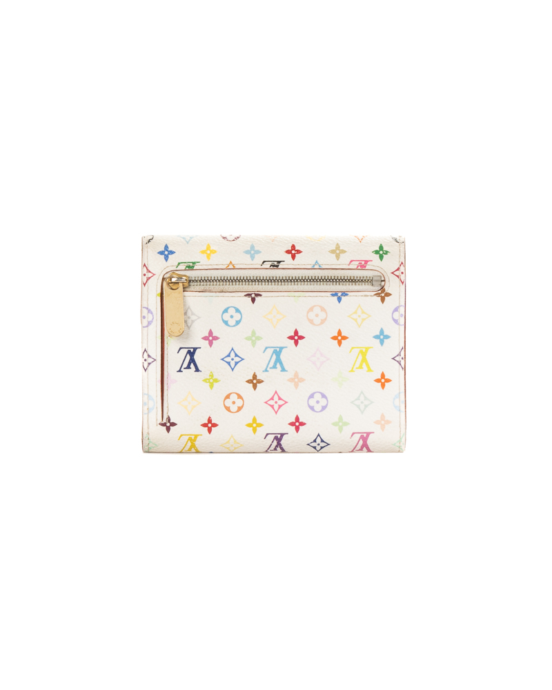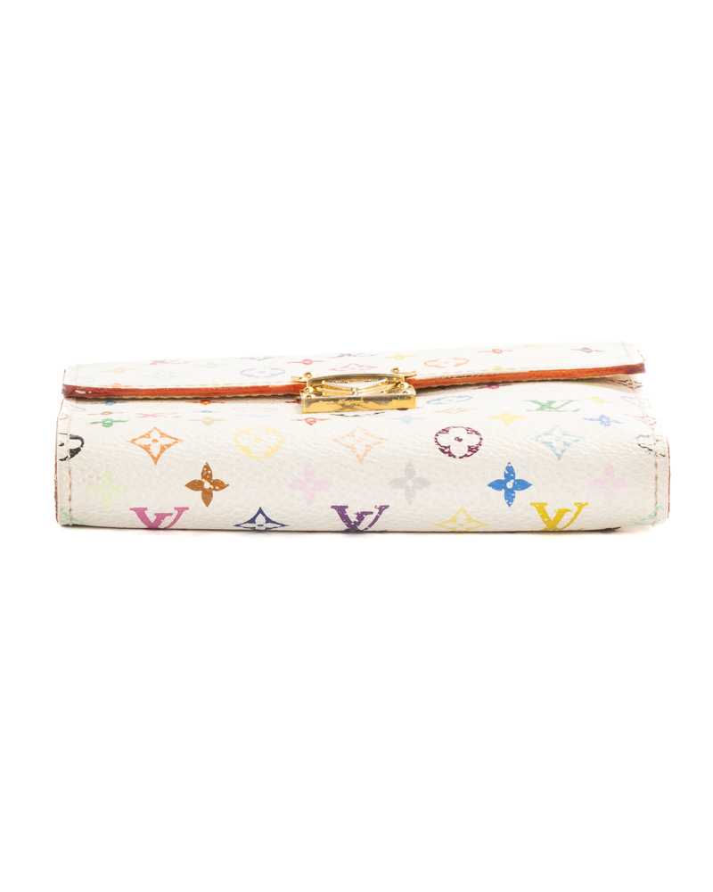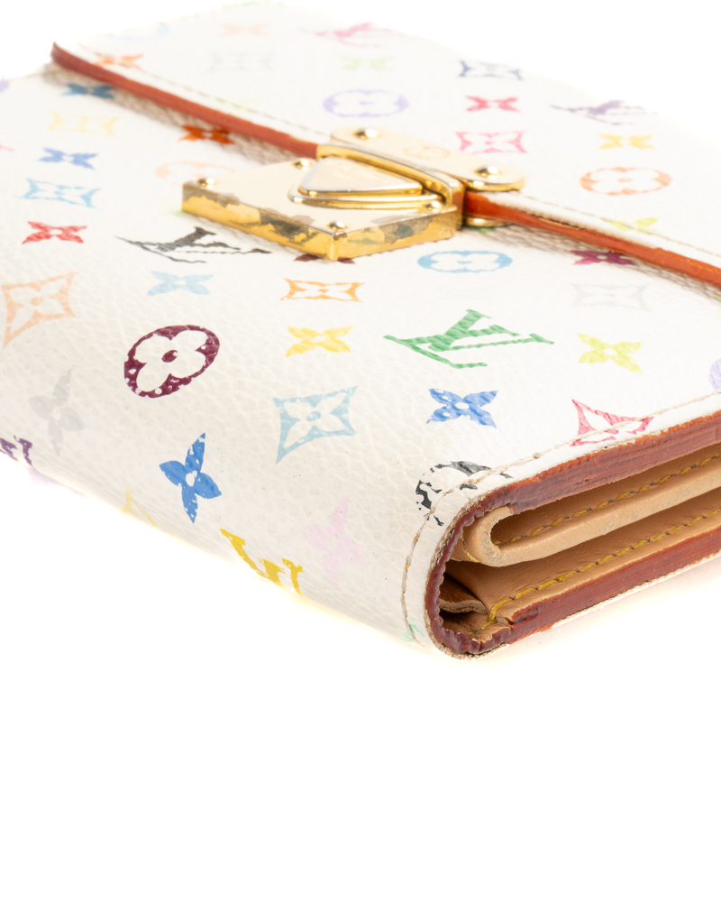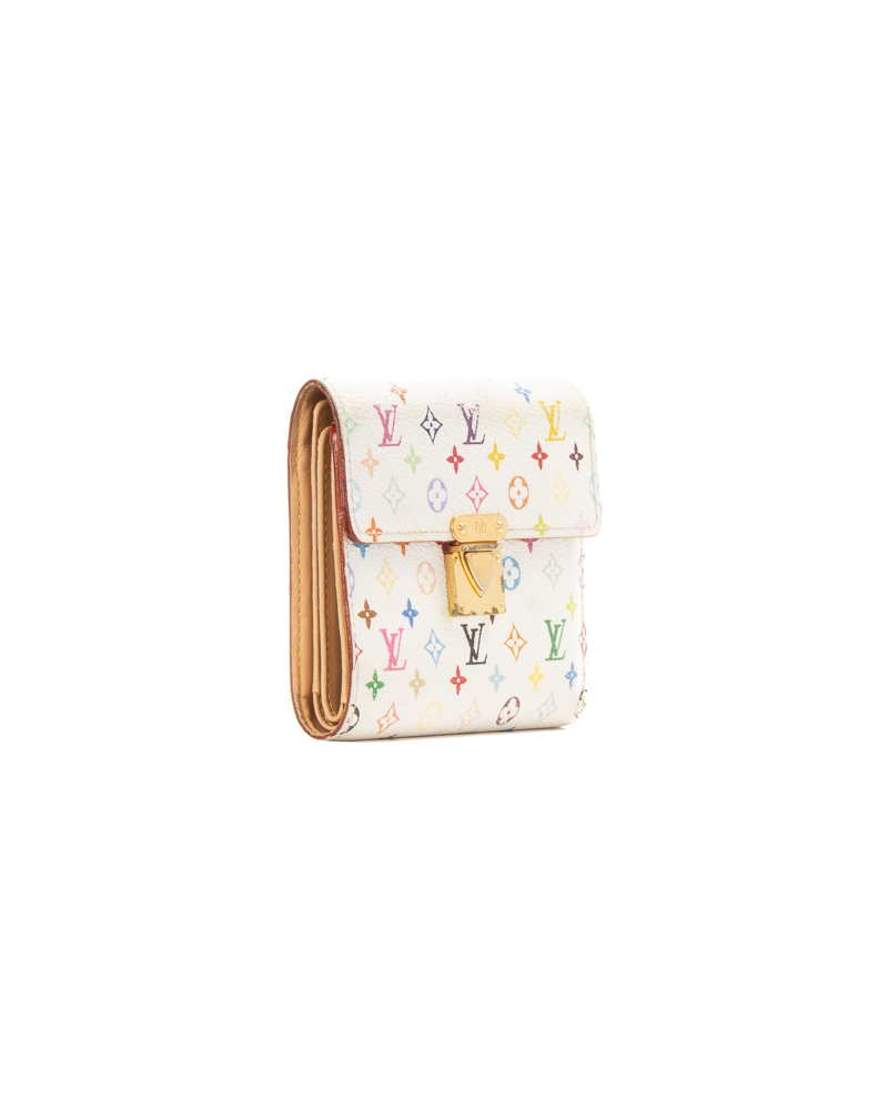 Portamonete firmato Louis Vuitton,  in edizione limitata in collaborazione con Takashi Murakami. Modello Koala, realizzato in tela nella fantasia monogram multicolor con hardware dorato. Dotato di una patta con chiusura ad incastro, internamente rivestito pelle liscia beige con comodi scompartimenti comodo per documenti e banconote. Arricchito di una comoda tasca esterna con chiusura a zip. L'articolo si presenta in buone condizioni, con segni di usura visibili in foto.