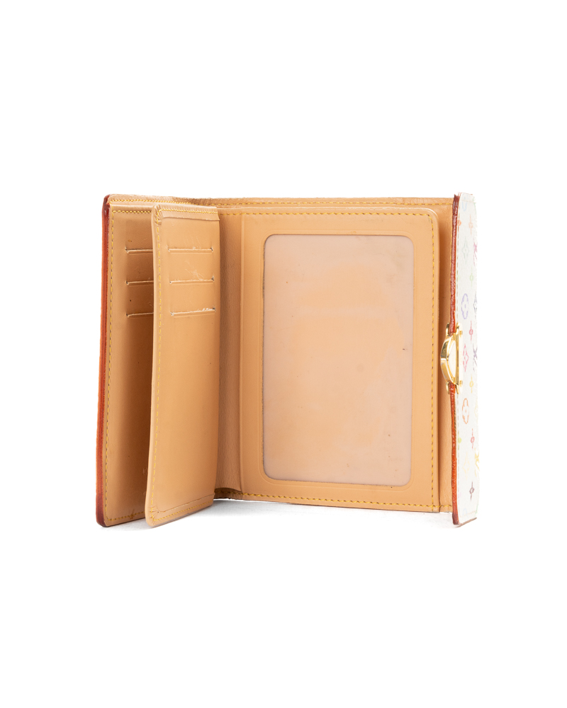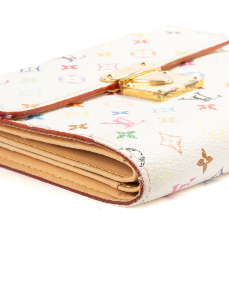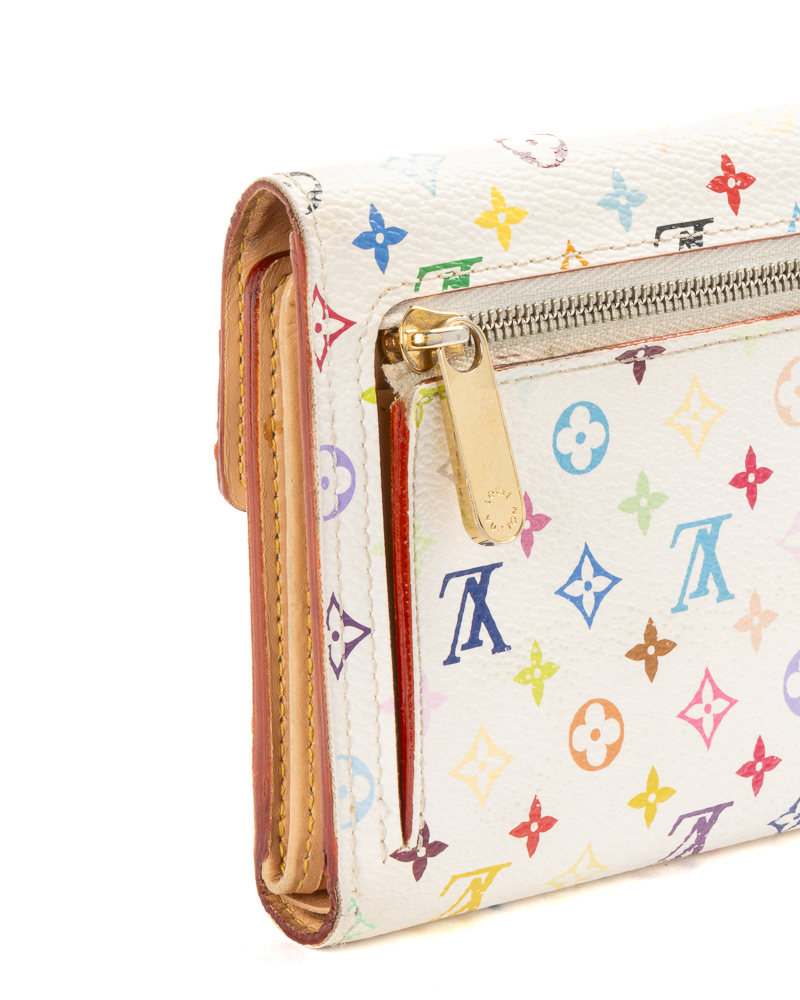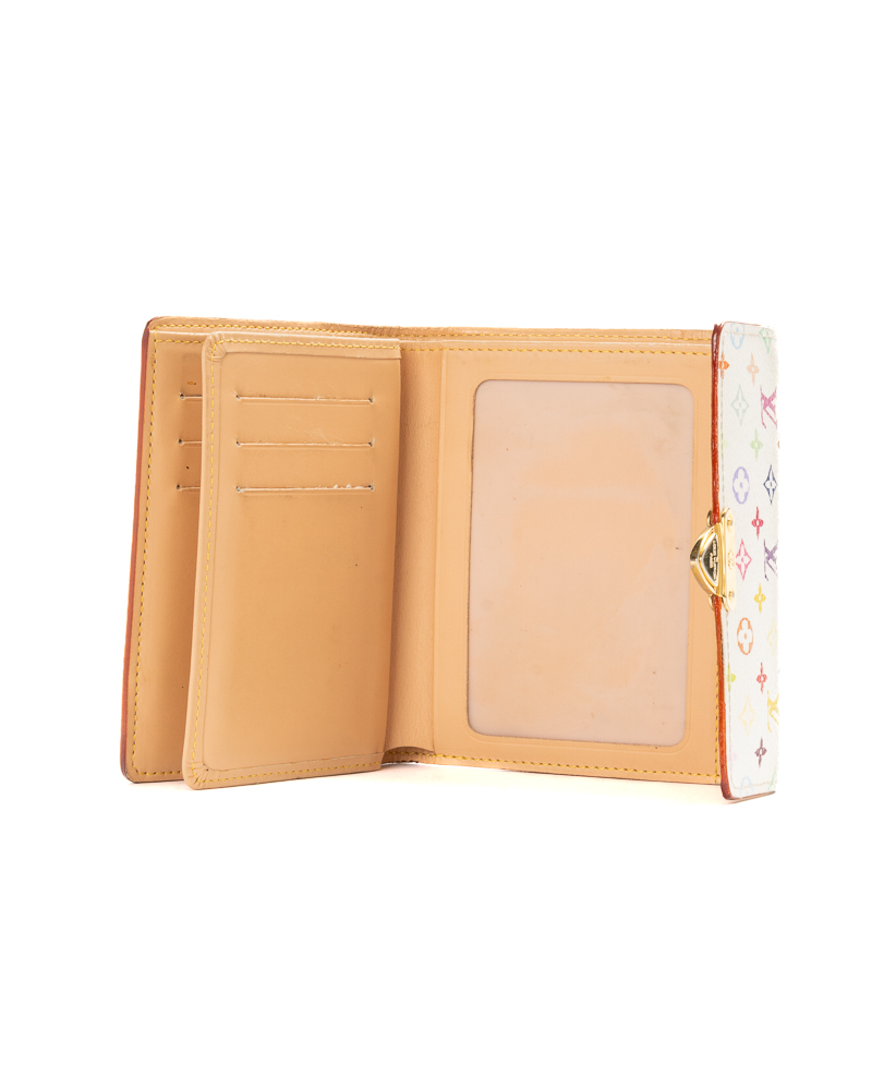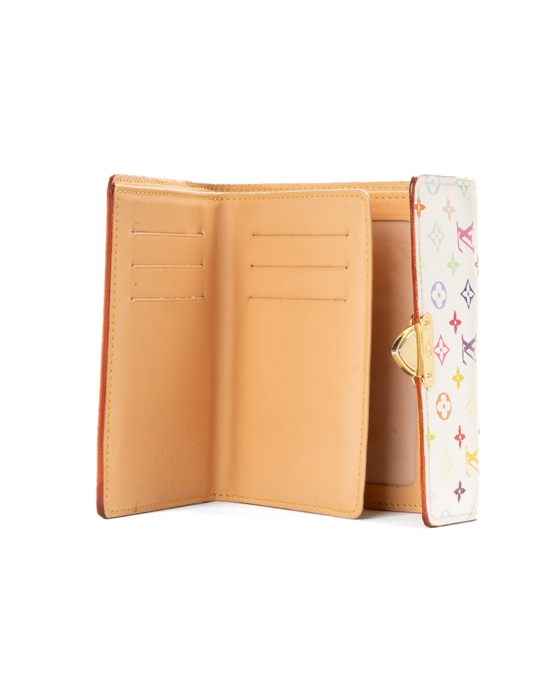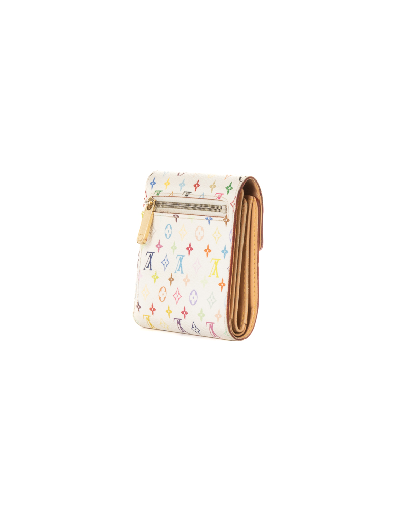 Portamonete firmato Louis Vuitton,  in edizione limitata in collaborazione con Takashi Murakami. Modello Koala, realizzato in tela nella fantasia monogram multicolor con hardware dorato. Dotato di una patta con chiusura ad incastro, internamente rivestito pelle liscia beige con comodi scompartimenti comodo per documenti e banconote. Arricchito di una comoda tasca esterna con chiusura a zip. L'articolo si presenta in buone condizioni, con segni di usura visibili in foto.