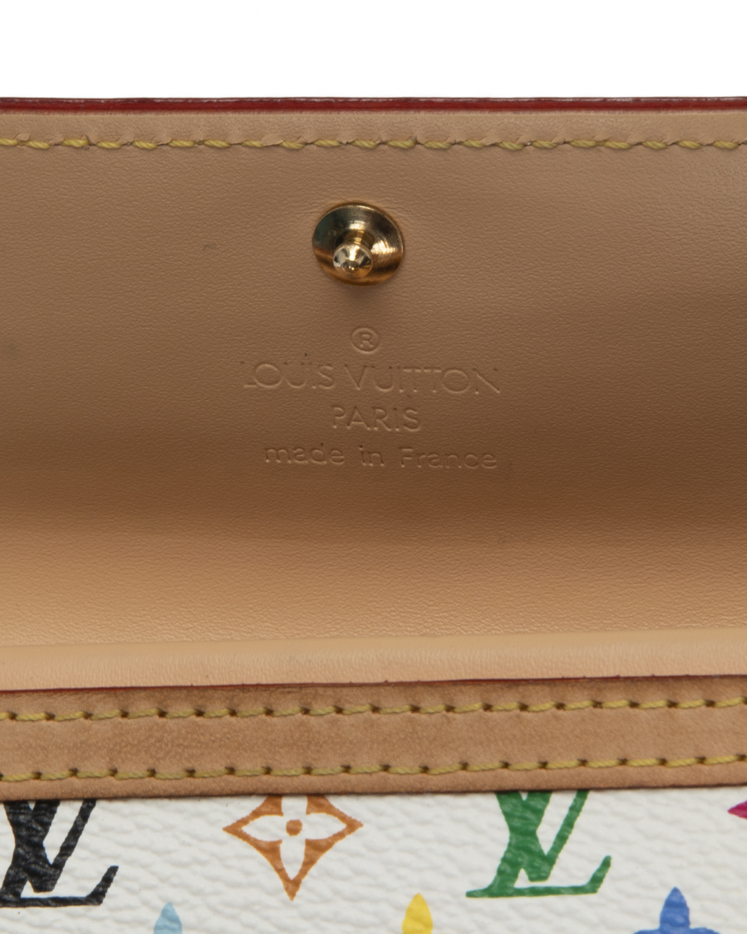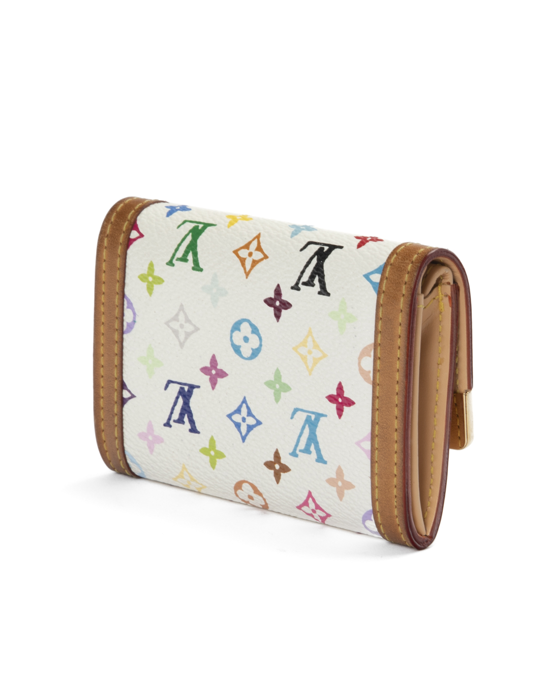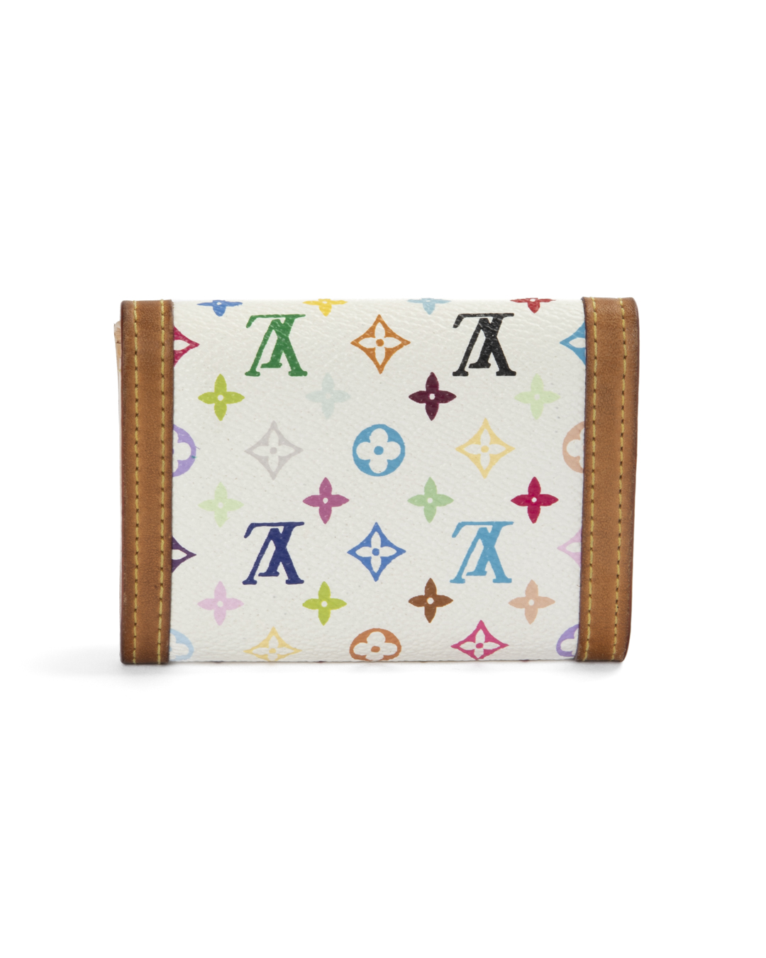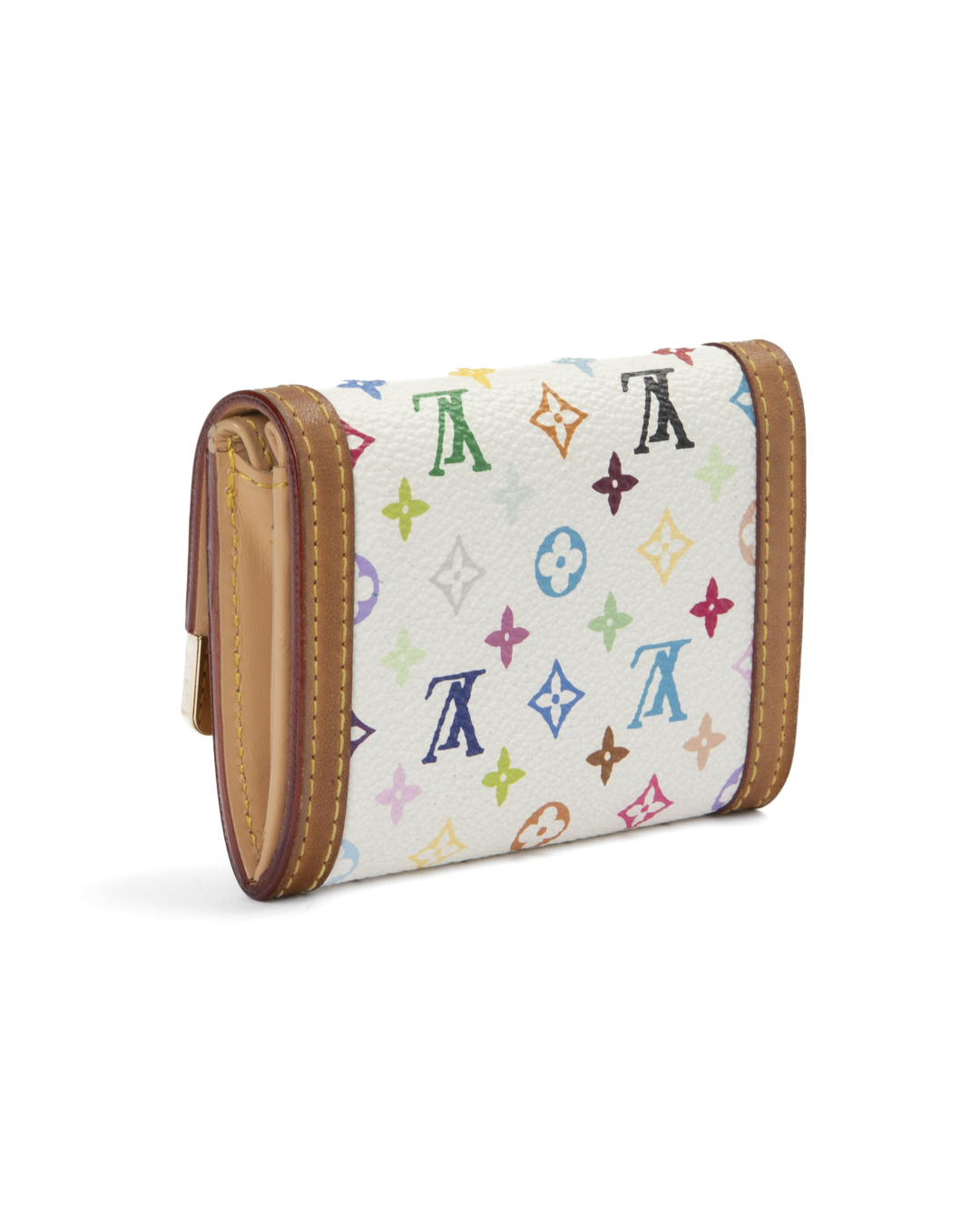 Portamonete firmato Louis Vuitton, in edizione limitata in collaborazione con Takashi Murakami. Realizzato in tela nella fantasia monogram multicolor con hardware dorato. Dotato di una patta con chiusura a clip, internamente rivestito pelle liscia beige comodo per banconote e monete. L'articolo si presenta in ottime condizioni.