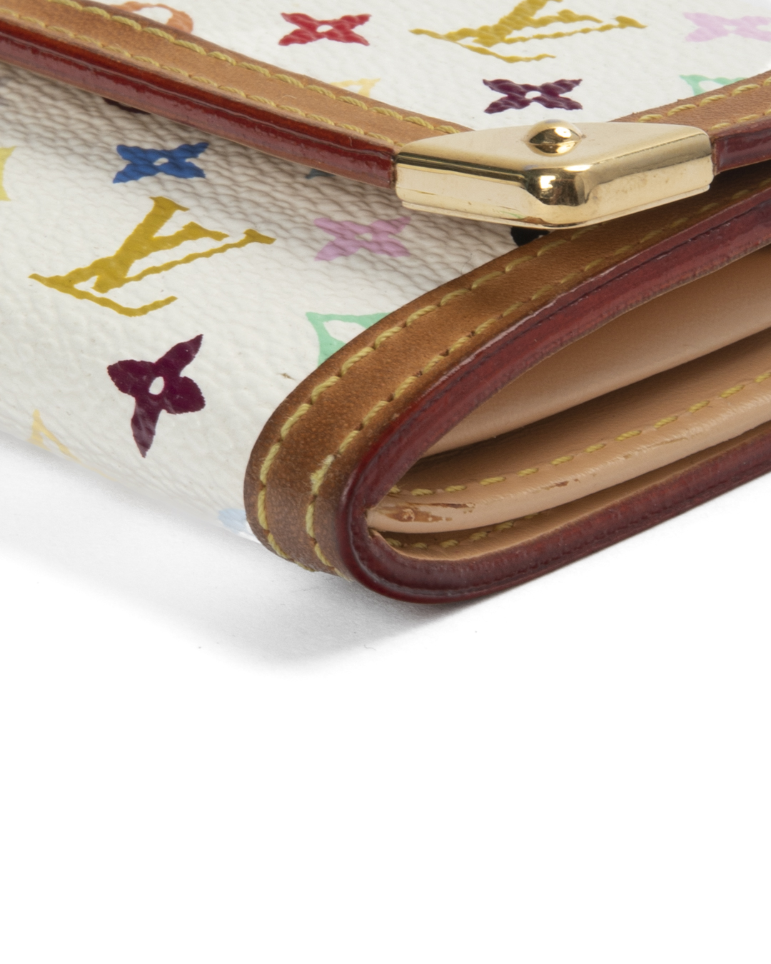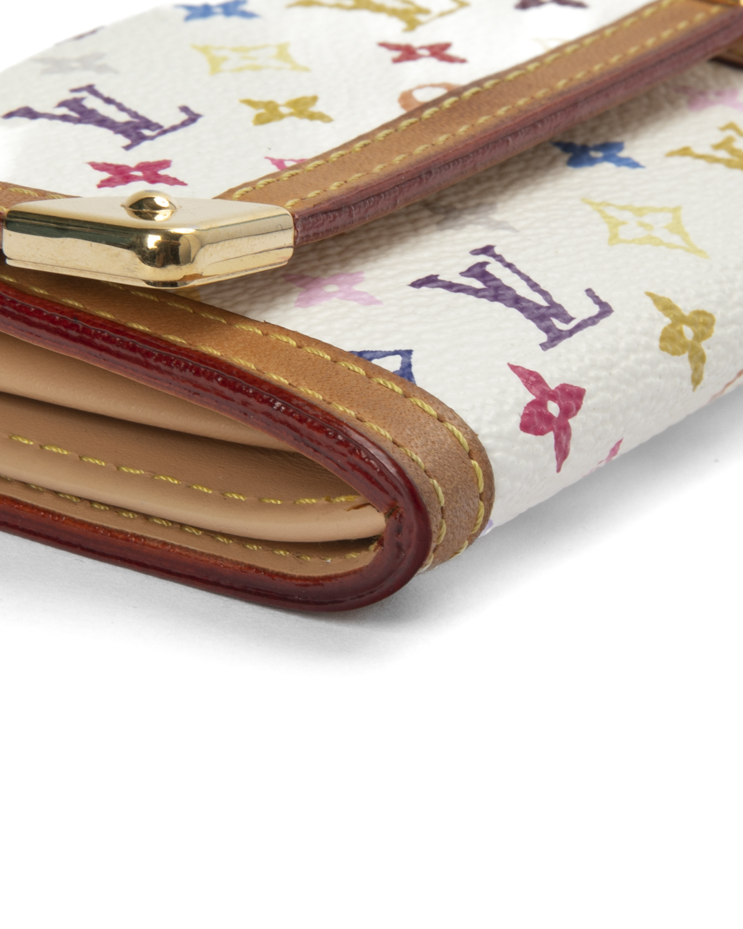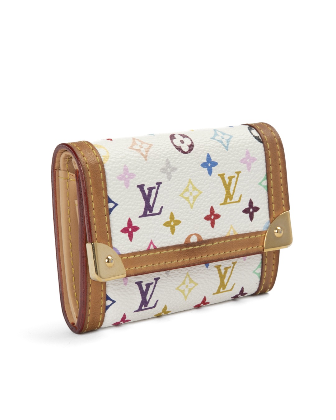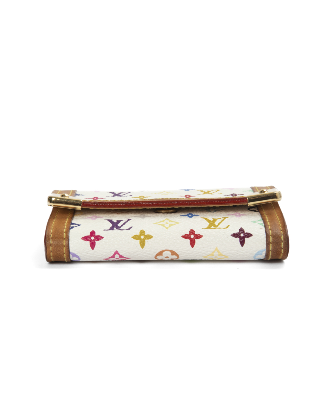 Portamonete firmato Louis Vuitton, in edizione limitata in collaborazione con Takashi Murakami. Realizzato in tela nella fantasia monogram multicolor con hardware dorato. Dotato di una patta con chiusura a clip, internamente rivestito pelle liscia beige comodo per banconote e monete. L'articolo si presenta in ottime condizioni.
