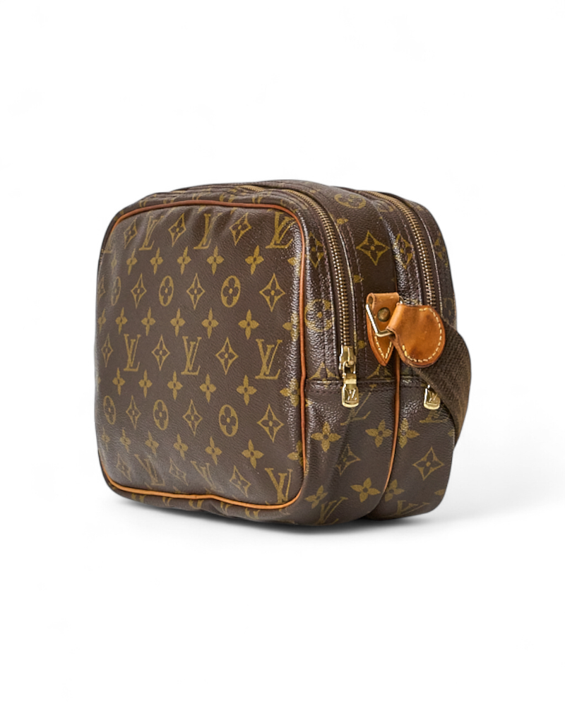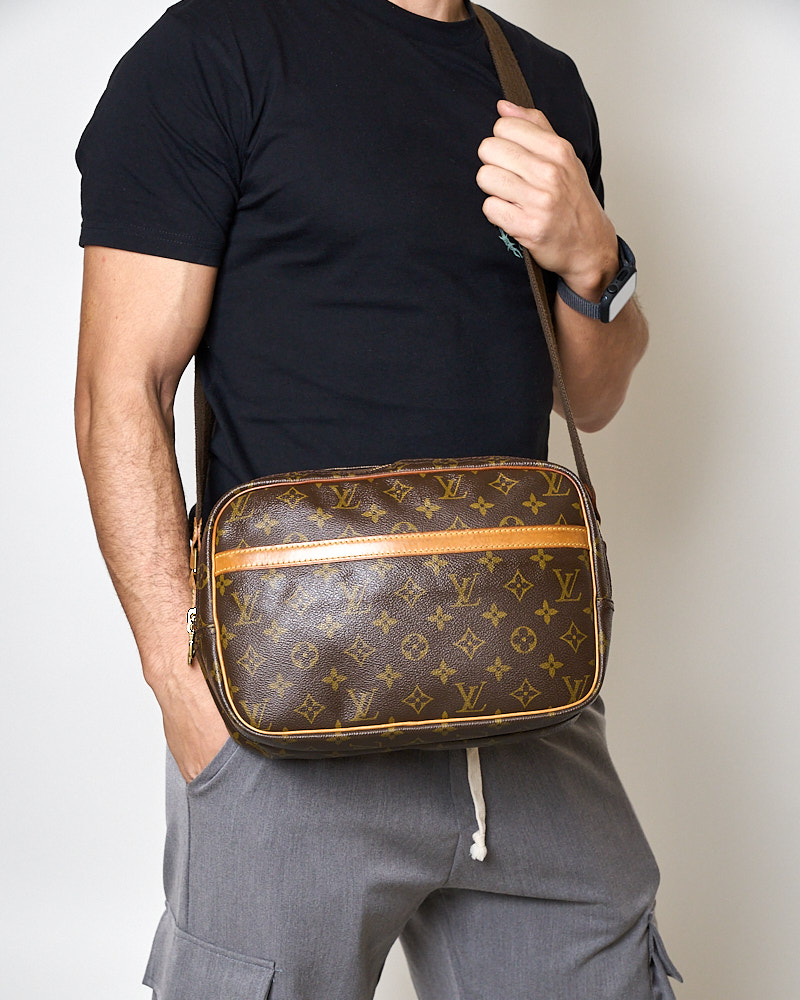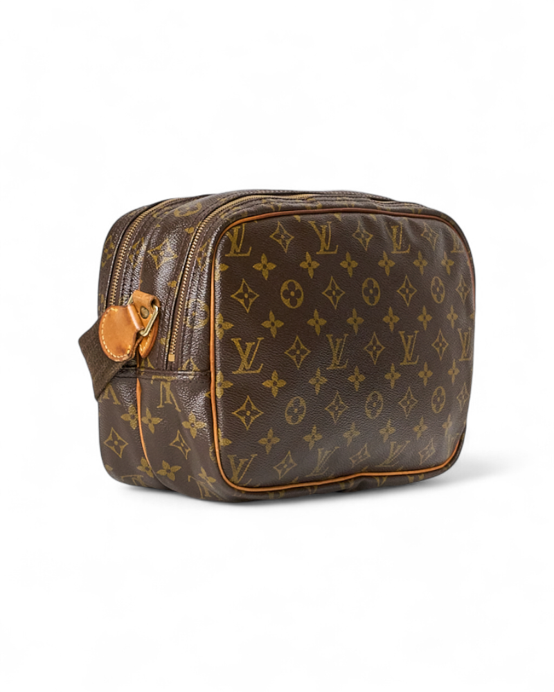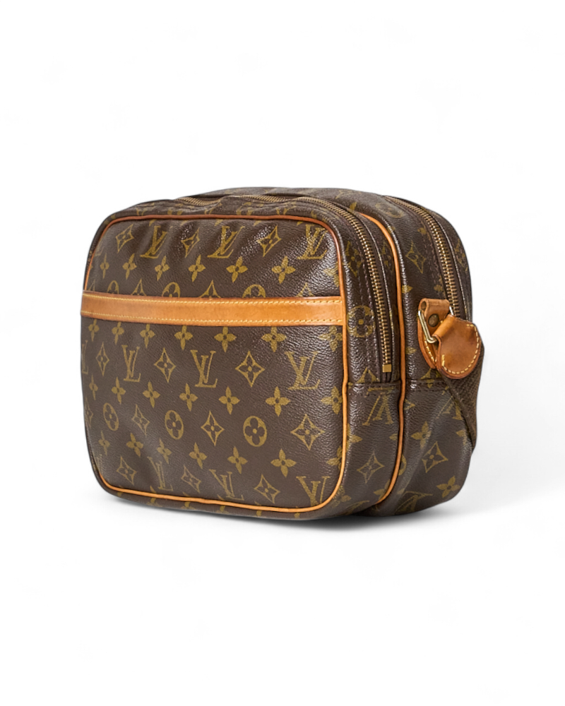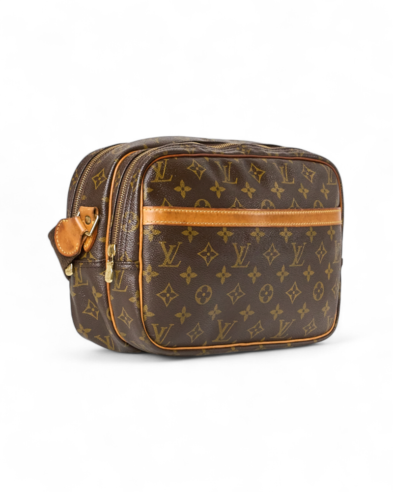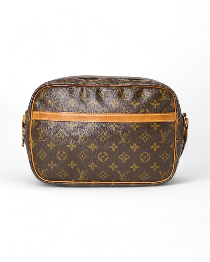Borsa firmata Louis Vuitton, modello Reporter nella misura PM, realizzata in tela nella classica fantasia monogram con rifiniture in vacchetta e hardware dorato. Dotata di una doppia chiusura superiore a zip, internamente rivestita in tela beige con comoda tasca, la borsa è abbastanza capiente. Munita di una tracolla in tessuto regolabile per una comoda portata a spalla. Sulla parte frontale presenta una pratica tasca senza chiusura. L’articolo si presenta in buone condizioni.