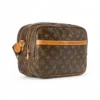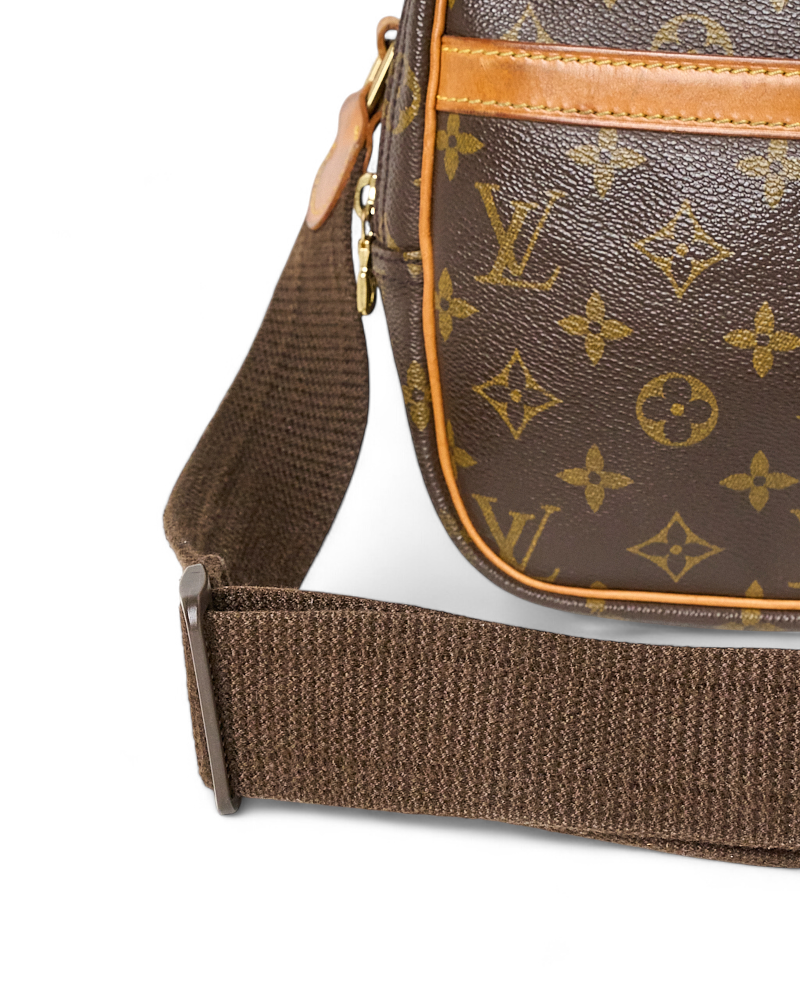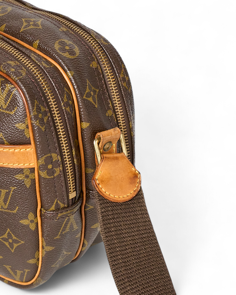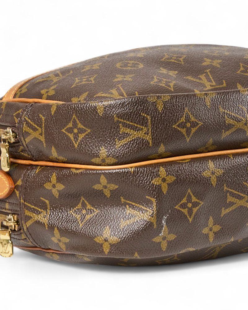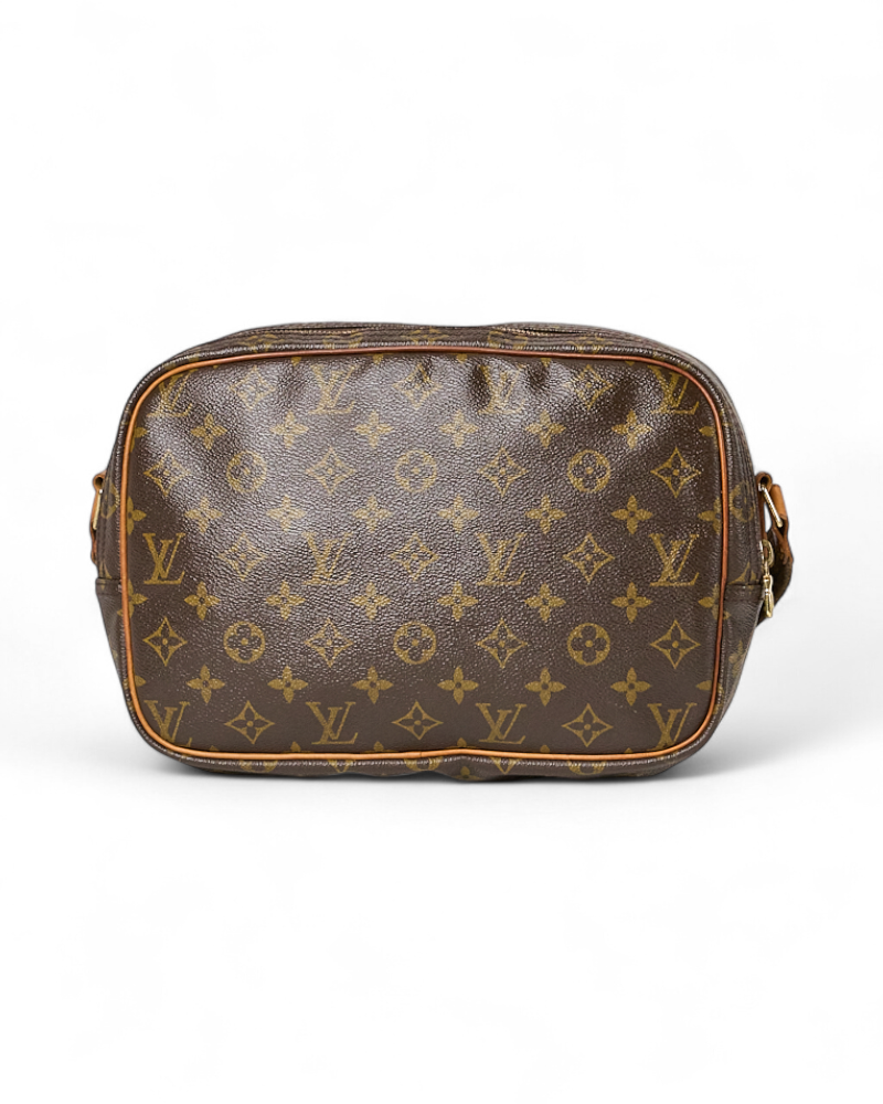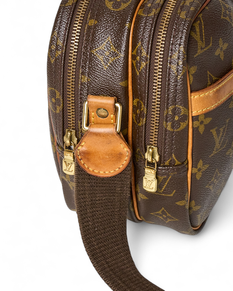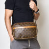 Borsa firmata Louis Vuitton, modello Reporter nella misura PM, realizzata in tela nella classica fantasia monogram con rifiniture in vacchetta e hardware dorato. Dotata di una doppia chiusura superiore a zip, internamente rivestita in tela beige con comoda tasca, la borsa è abbastanza capiente. Munita di una tracolla in tessuto regolabile per una comoda portata a spalla. Sulla parte frontale presenta una pratica tasca senza chiusura. L’articolo si presenta in buone condizioni.