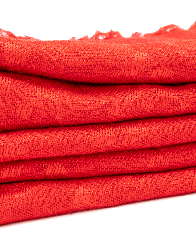 Scialle firmato Louis Vuitton, realizzato in misto lana e seta nella classica fantasia monogram nella colorazione rossa. Arricchita da frange all’estremità, misura 143.4 di lunghezza e 143.4 di altezza. L’articolo si presenta in ottime condizioni.