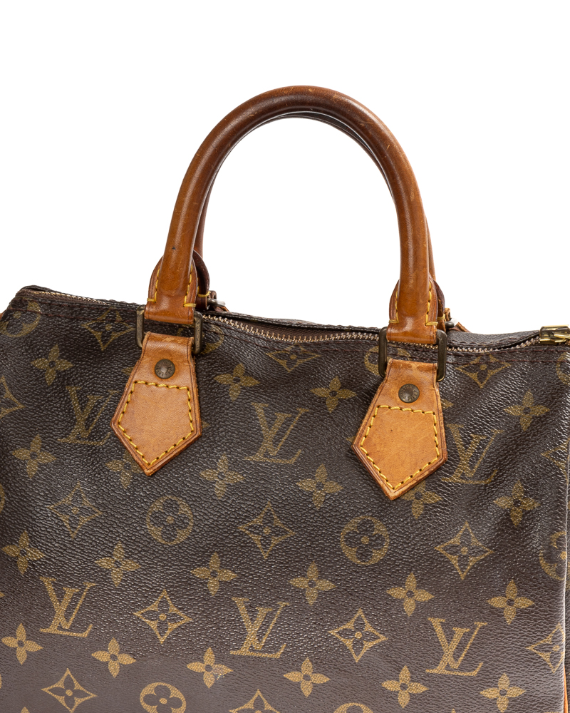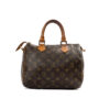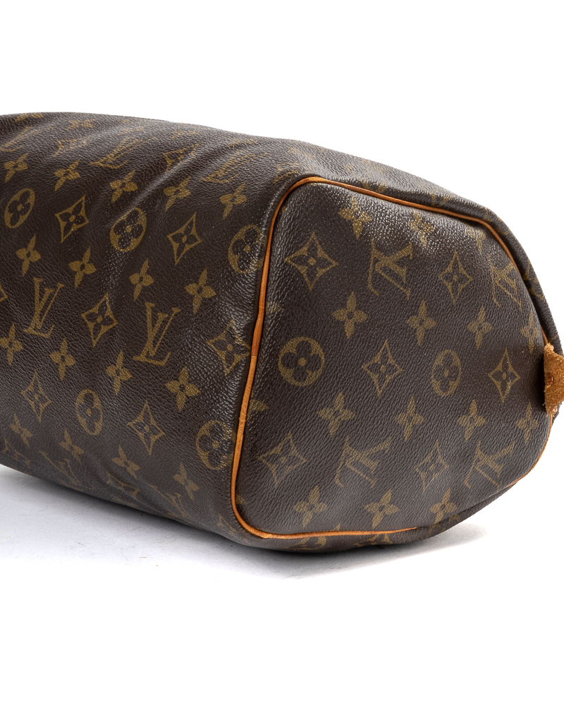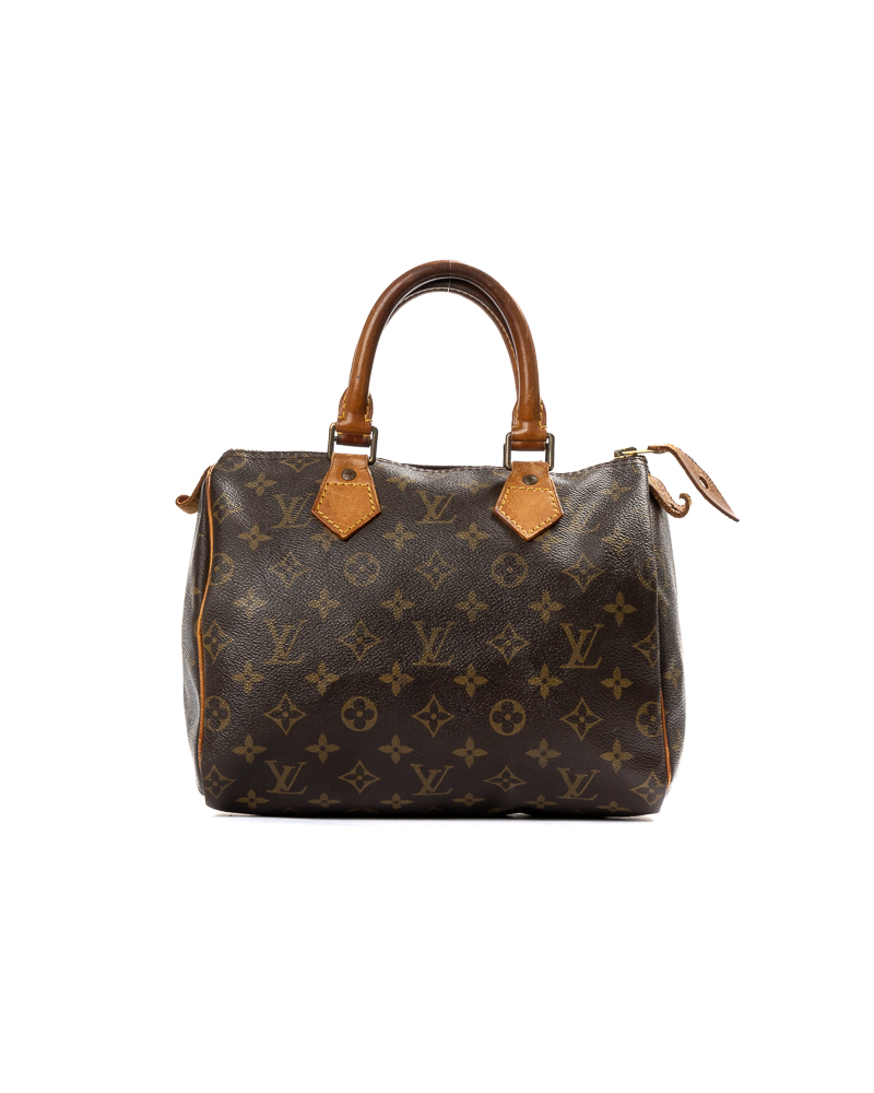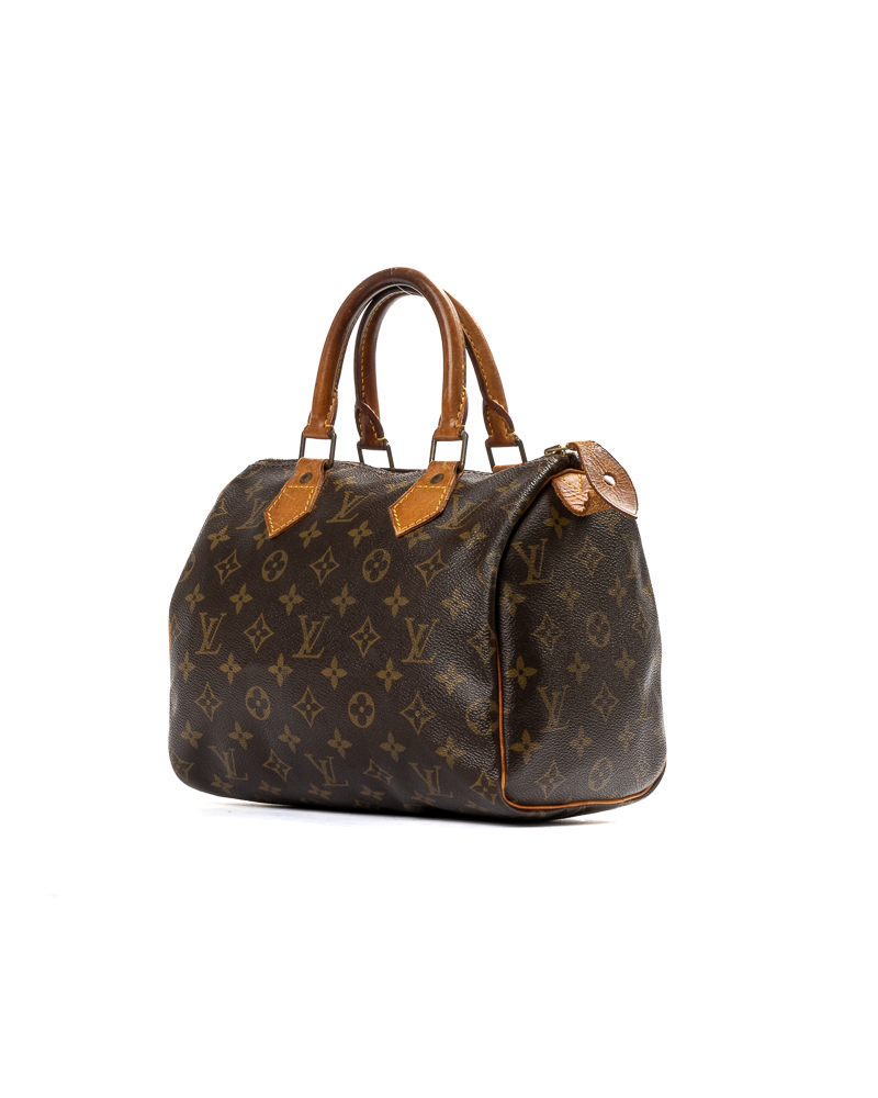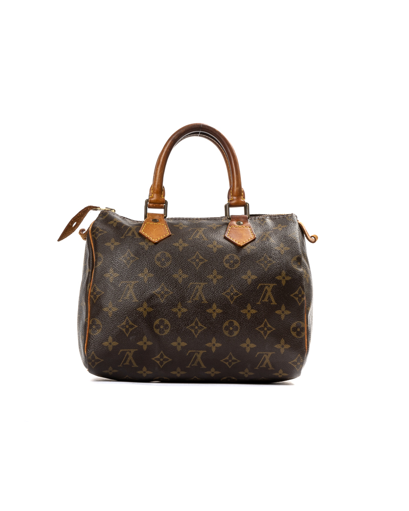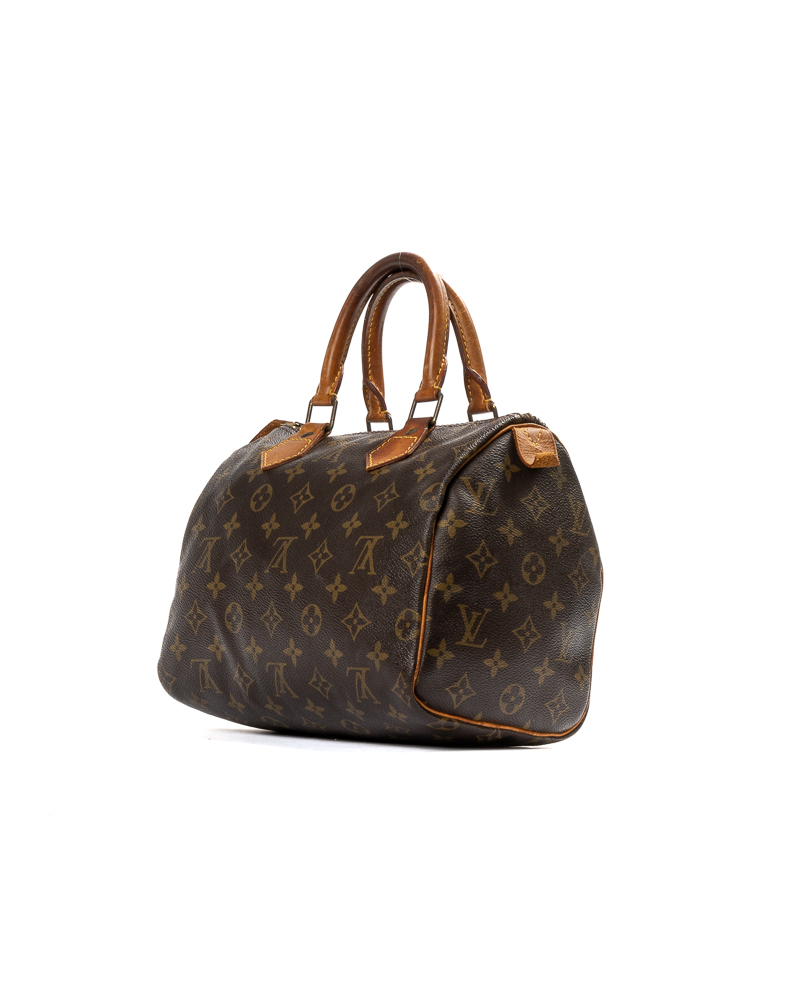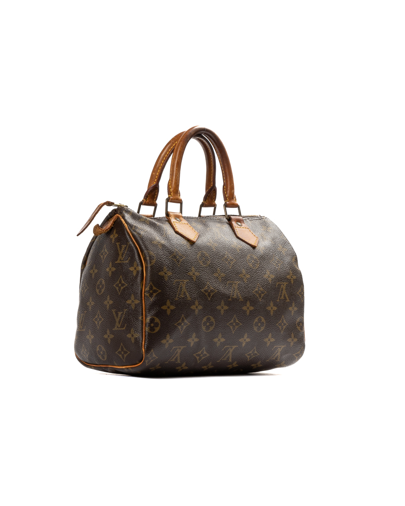 Borsa firmata Louis Vuitton, modello Speedy nella misura 25, realizzato in tela marrone nella classica fantasia monogram con inserti in vacchetta e hardware dorato. Dotata di una chiusura superiore a zip, internamente rivestito in tela marrone con comoda tasca, la borsa è abbastanza capiente. Munito di doppio manico in vacchetta, per una comoda portata a mano. L’articolo si presenta in buone condizioni, con piccoli segni di usura visibili in foto.