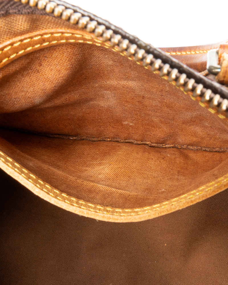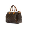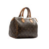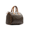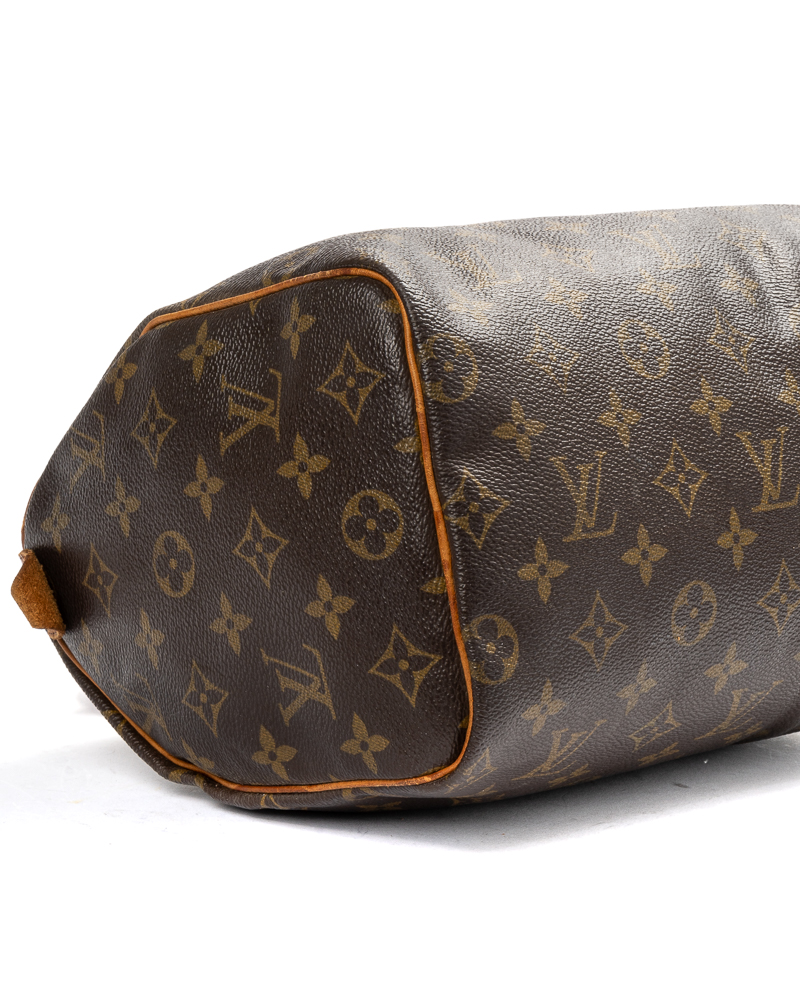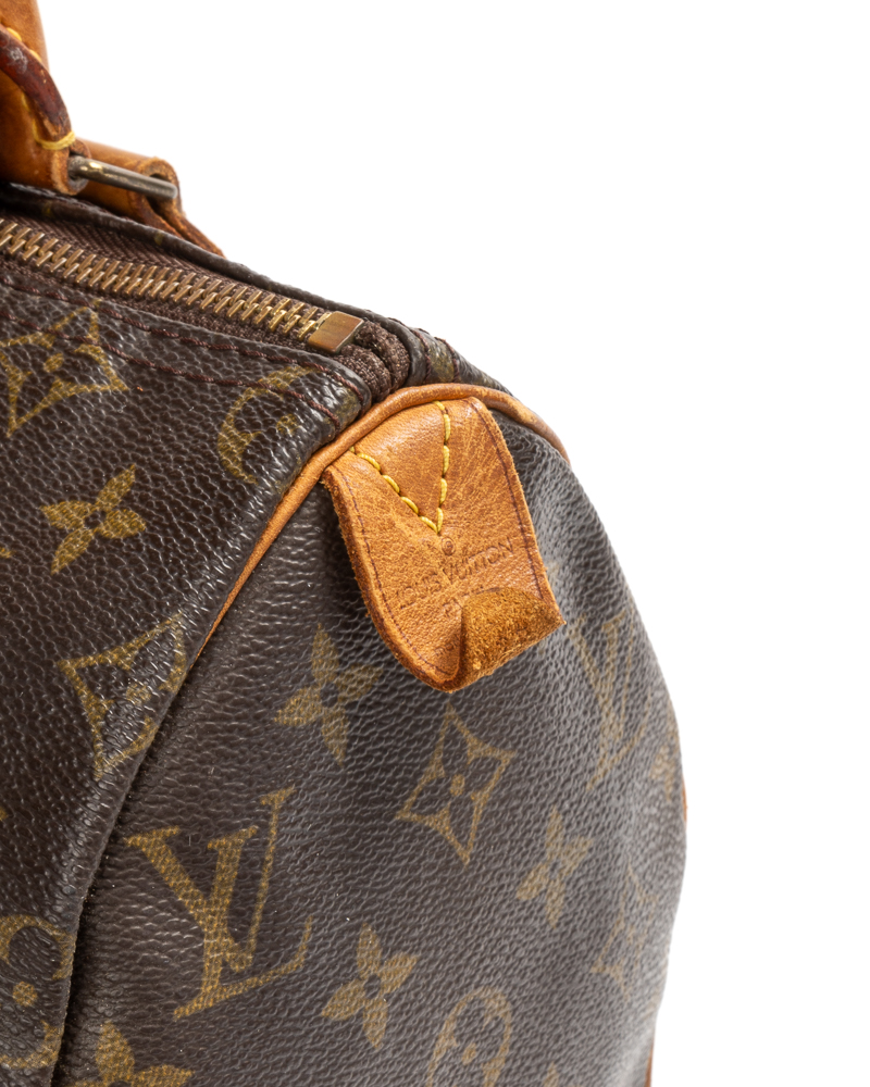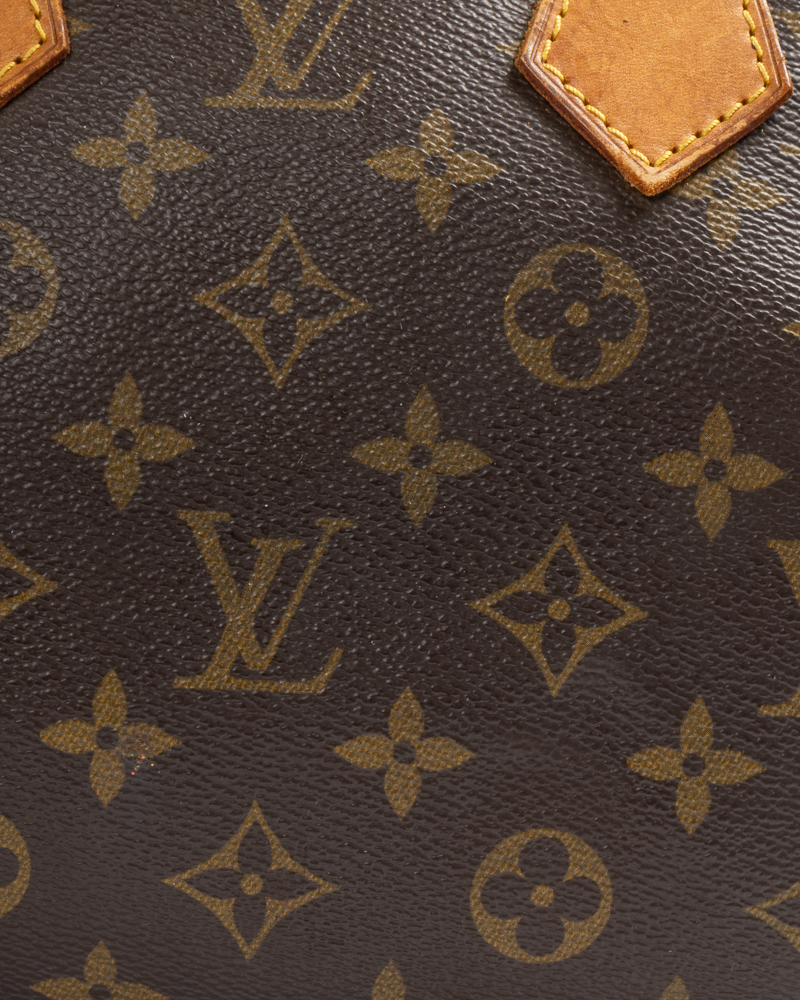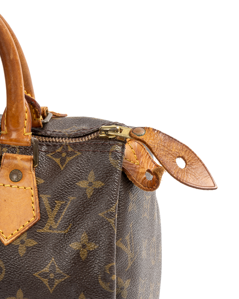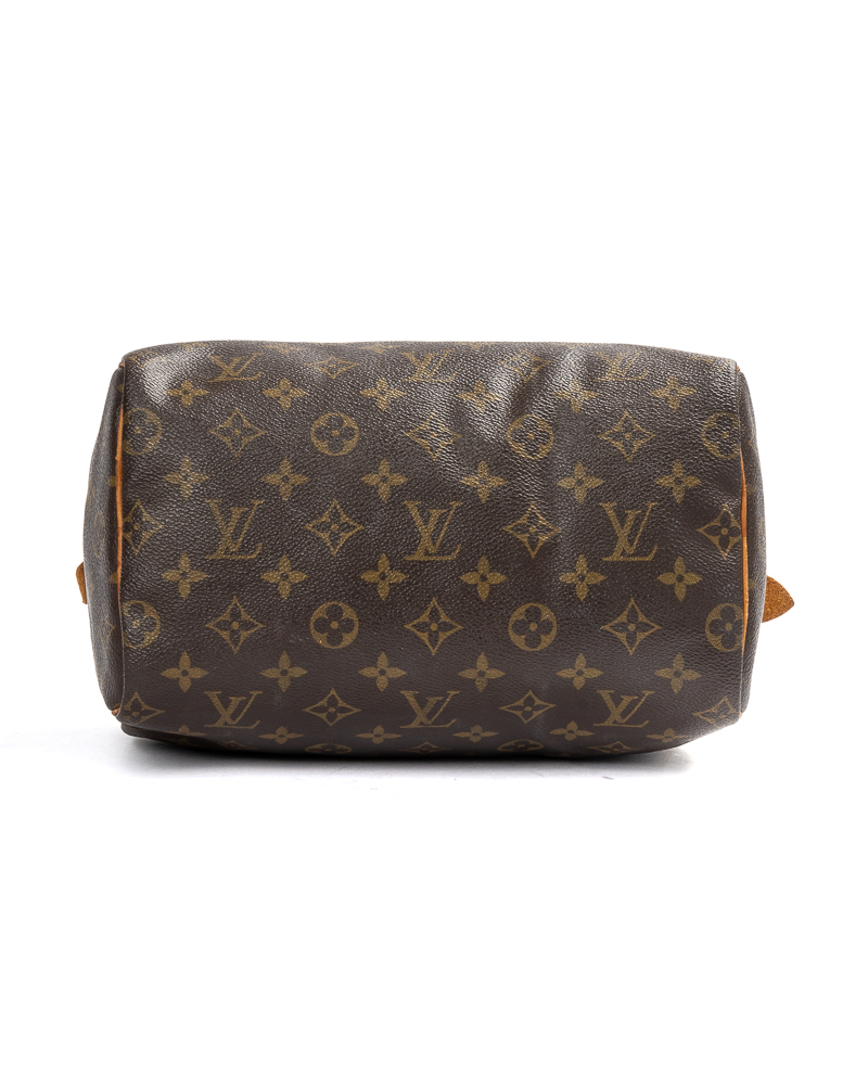 Borsa firmata Louis Vuitton, modello Speedy nella misura 25, realizzato in tela marrone nella classica fantasia monogram con inserti in vacchetta e hardware dorato. Dotata di una chiusura superiore a zip, internamente rivestito in tela marrone con comoda tasca, la borsa è abbastanza capiente. Munito di doppio manico in vacchetta, per una comoda portata a mano. L’articolo si presenta in buone condizioni, con piccoli segni di usura visibili in foto.